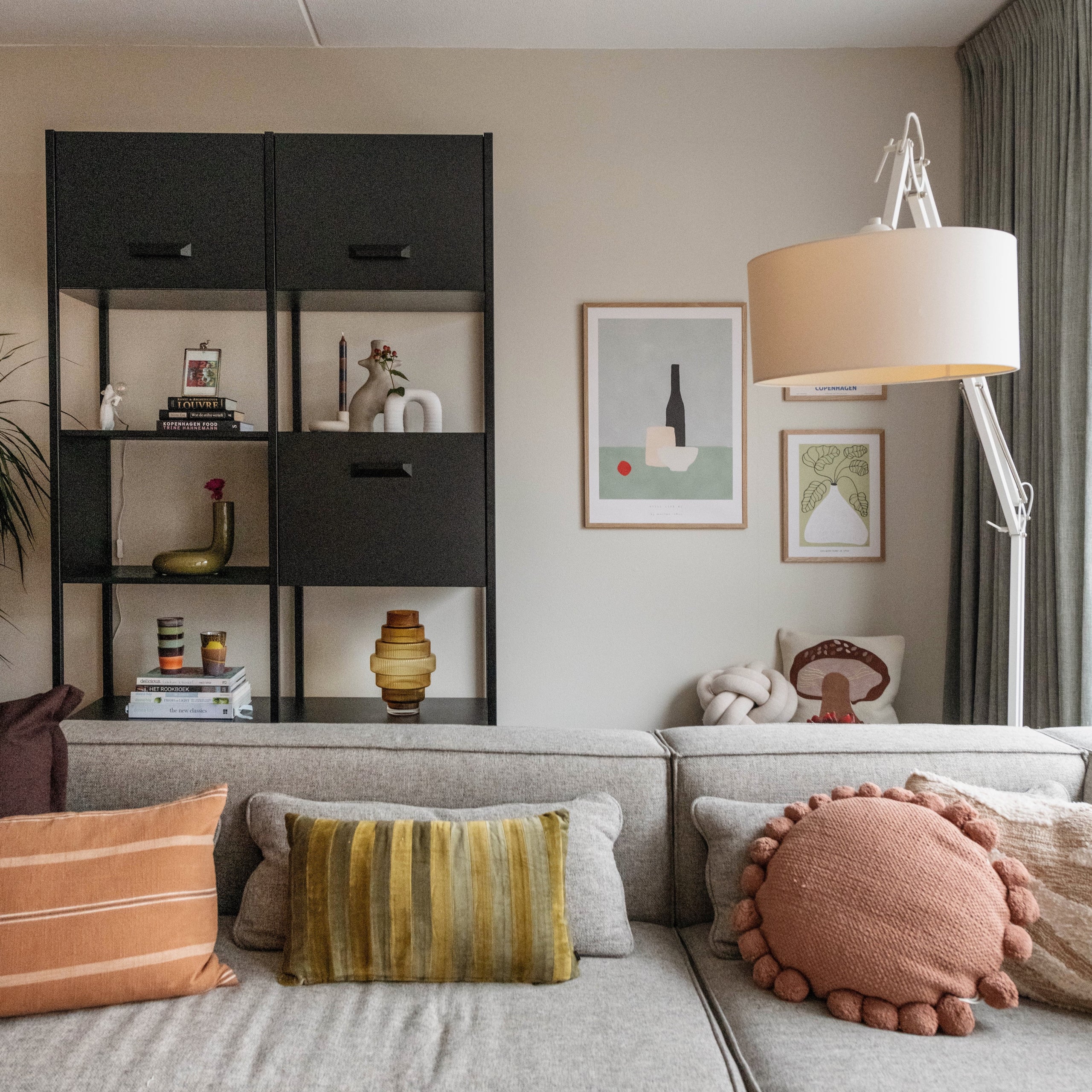 De woonkamer van Wouter had voorheen geen duidelijke woonstijl. ''Het kleurenpalet was voornamelijk grijs met wit, waardoor de woonkamer fris en ruimtelijk oogde. Dit gevoel wilden we graag behouden, maar dan wel met een duidelijke stijl en meer kleur.'' Die woonstijl bleek een mix van Scandinavisch en Industrieel te zijn. Met een aantal stijlvolle vazen en sierkussens kun je gemakkelijk en snel meer kleur aanbrengen in huis.