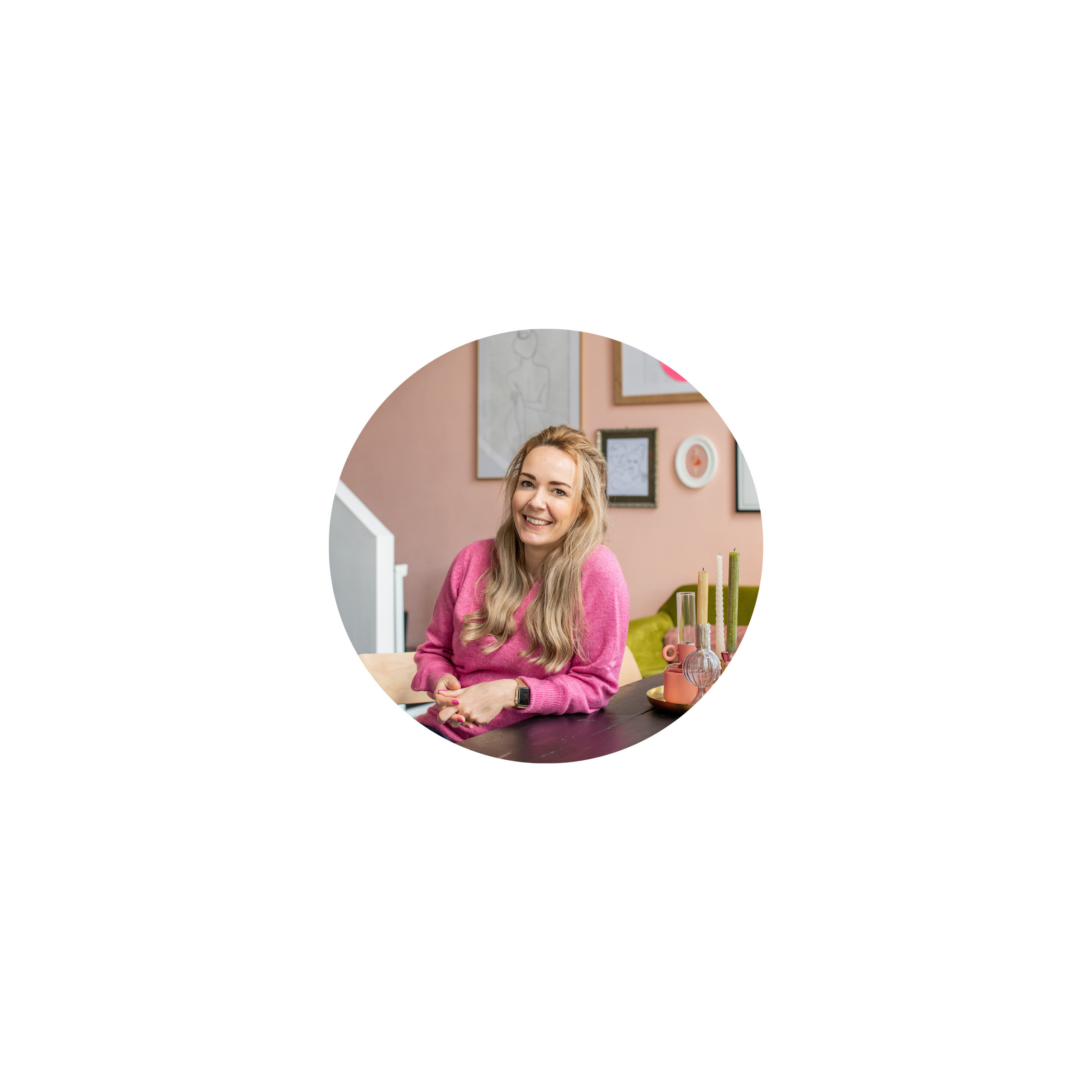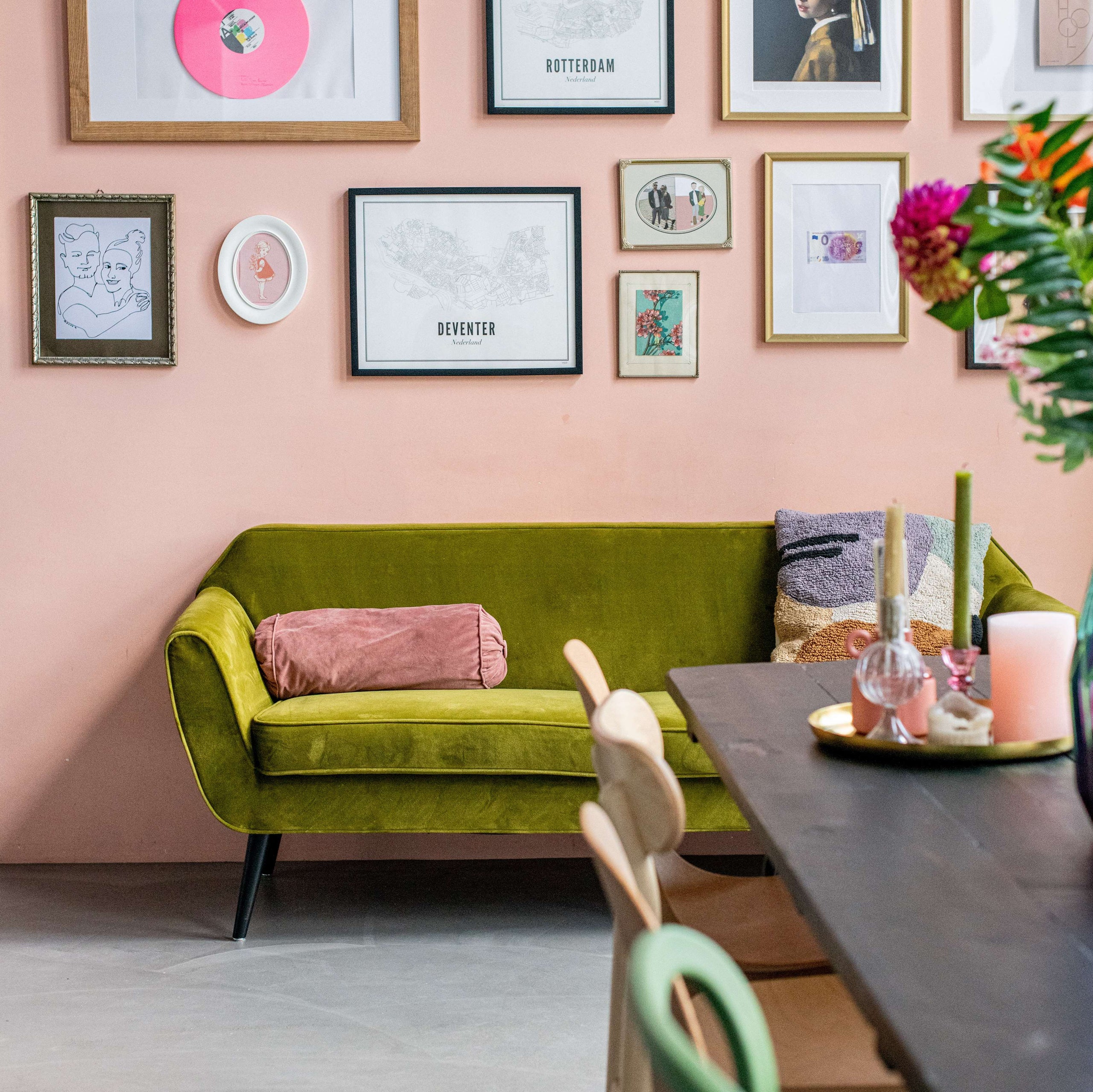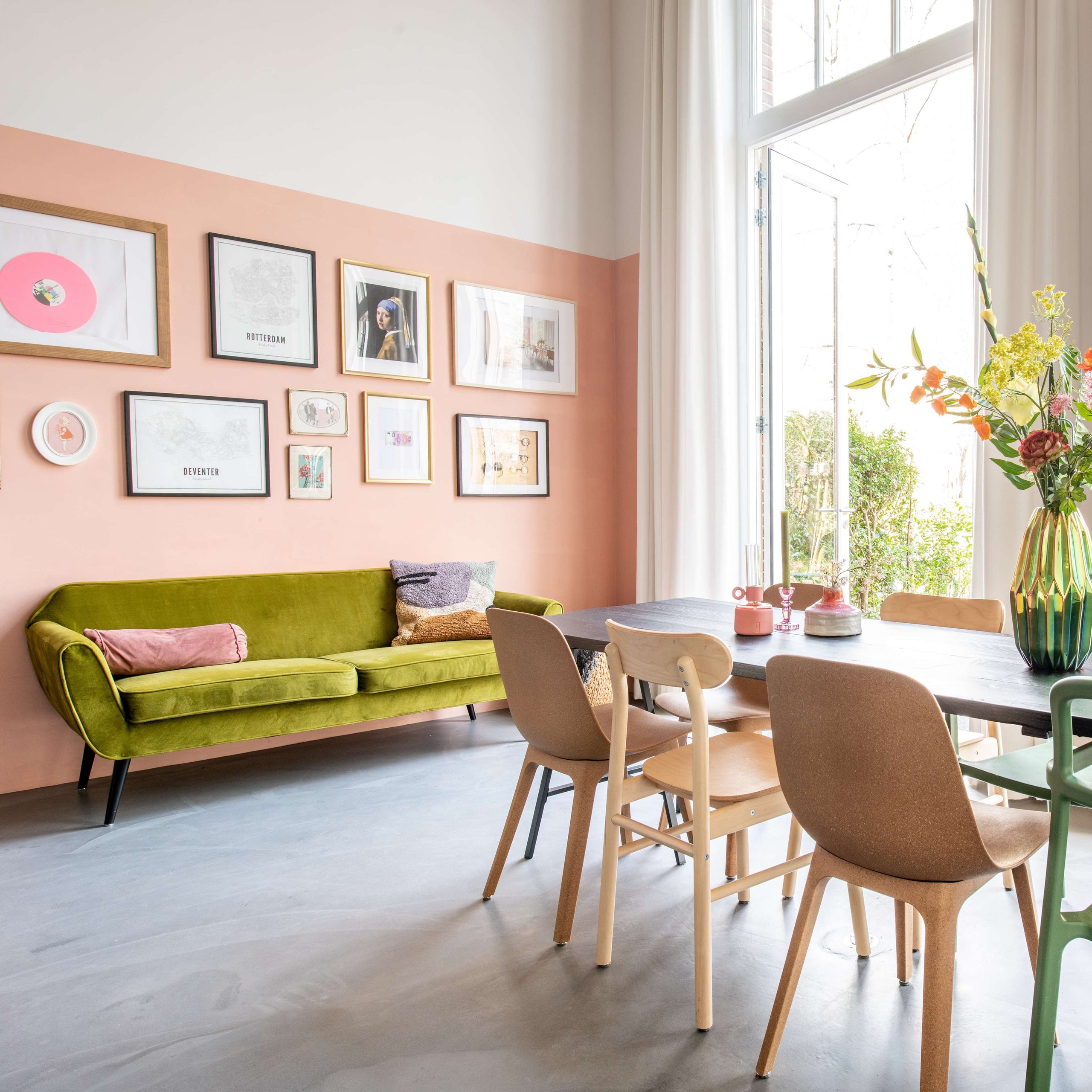 Zwart, wit en houttinten vormen het kleurenpalet van de woning. Aan deze rustige basis voegt Aquine sprekende tinten toe. Zo vult de roze muur de grote ruimte in de keuken en zorgt het kleurencontrast met de groene velvet bank voor een fleurig geheel. “Deze twee knallende kleuren trek ik door in subtiele woonaccessoires. Het leuke daaraan vind ik dat wanneer je het zat bent, je met bijvoorbeeld een nieuwe vaas of stijlvolle sierkussens je interieur weer een andere uitstraling kunt geven.” Dat Aquine gek is op planten, is duidelijk terug te zien in huis. Het vele groen in huis zorgt voor een levendige sfeer en is een kleurrijke toevoeging aan haar strakke interieur.