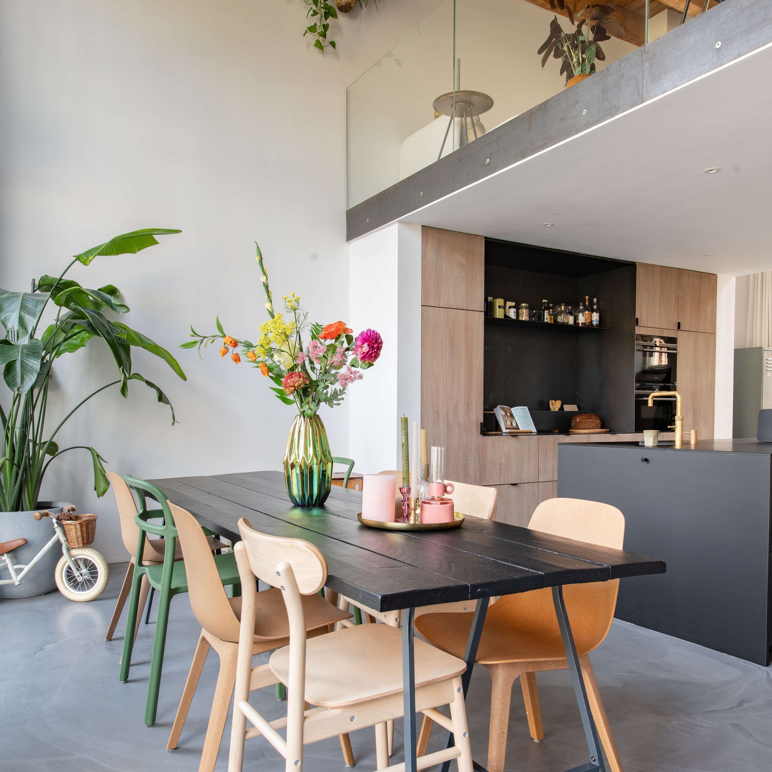 De keuken is voor Aquine en haar gezin de favoriete plek in huis. Aan de grote eettafel brengen ze de meeste tijd samen door. Door verschillende eetkamerstoelen met elkaar te combineren, ontstaat er een vrolijk en speels effect. In de zomer staan de grote openslaande deuren in de keuken vaak open zodat de kinderen lekker buiten kunnen spelen. Aquine vindt het belangrijk dat er geleefd mag worden in huis. “In de vloer ontstaan krassen en butsen en de meubels hebben er voor de komst van de kinderen ook beter uitgezien. Dat hebben we enigszins losgelaten. Onze tijd van design items komt nog wel”, grapt ze.