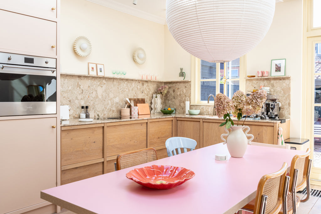 "Voor ons was het altijd al een grote droom om zelf een keuken te kunnen bedenken. We zijn er voor naar Kopenhagen gevlogen en hebben flink onderzoek gedaan naar wat wij mooi vinden. Uiteindelijk hadden we nooit zo ver hoeven zoeken want een vriend van ons heeft onze droomkeuken gebouwd. We wilden graag dat de keuken meteen zou opvallen als je de woonkamer binnen komt. Dat is goed gelukt, zeker met de opvallende roze eettafel van HKliving erbij!"