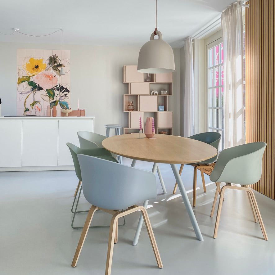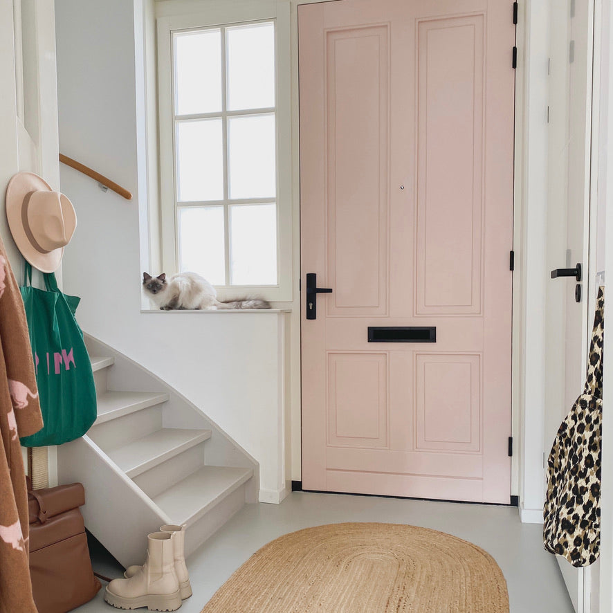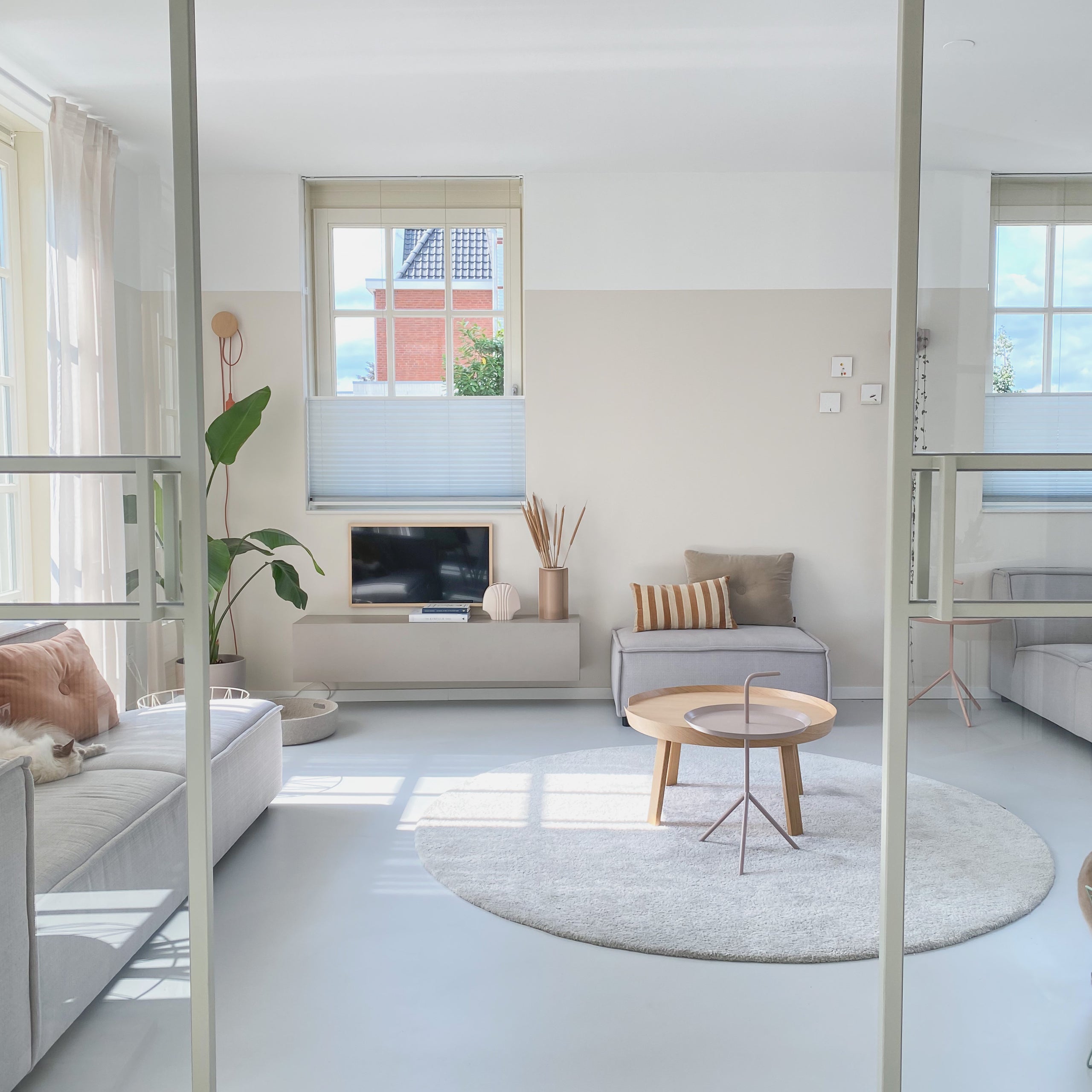 De basis van het huis is licht en strak. De lichtgrijze gietvloer die door het hele huis is gegoten was de start van hun minimalistische, Scandinavische designhuis. “Het huis moet daarentegen wel een leefbaar en gezellig familiehuis zijn.” vertelt Debbie. "De ronde, organische vormen in het huis maken het interieur zacht en minder koel." Zo staat de prachtige ovale eettafel als pronkstuk in de eetkamer, en de ronde bijzettafels geven de woonkamer een fijn en ruimtelijk aanzicht. Hoe minimalistisch ook: aan kleur geen gebrek in dit strakke huis. De kleuren in huis vallen binnen een zoet palet van pasteltinten en geven het huis een knusse, fijne sfeer. Zelfs de voordeur is roze geschilderd. “Wie kan er nou zeggen: ik woon in het huis met de roze voordeur?” Grapt Debbie.