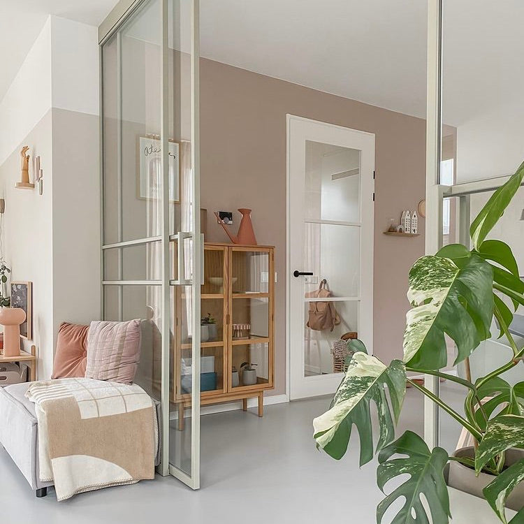 Debbie blijft je verrassen met haar Scandi pastelinterieur. Zo heeft zij niet gekozen voor de populaire – maar standaard – zwarte stalen pui, maar voor een lichte grijsgroene kleur. “De eetkamer en keuken worden daarmee gescheiden van de woonkamer. Omdat het geheel van glas is, blijft de ruimte een open karakter houden.” De meubels en accessoires zijn in voornamelijk zachte kleuren, maar een accentkleur hier en daar mag niet missen. Waar velen bruintinten als basis zien, is dit bij Debbie juist de kleur die als opvallende, kleurrijke touch is toegevoegd.