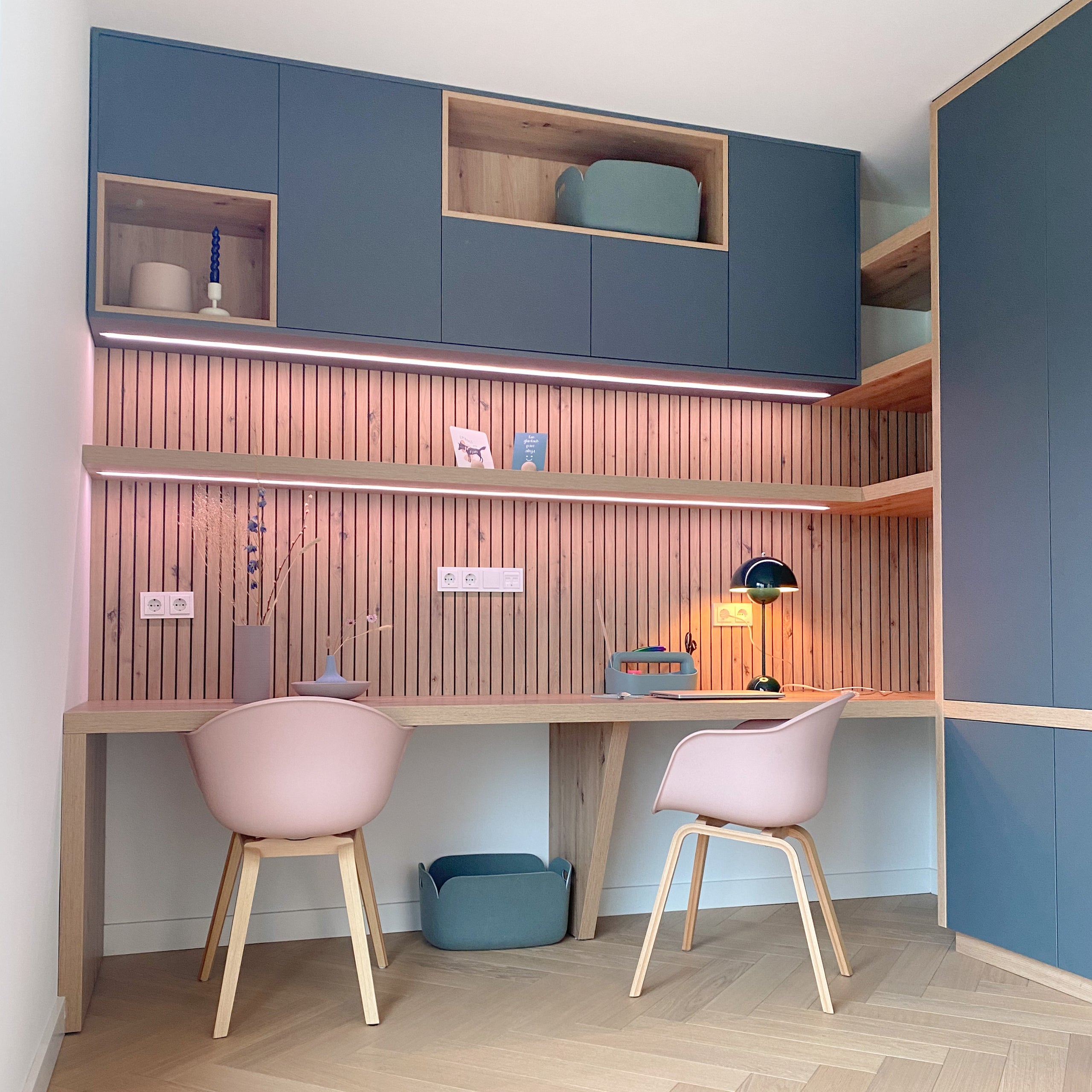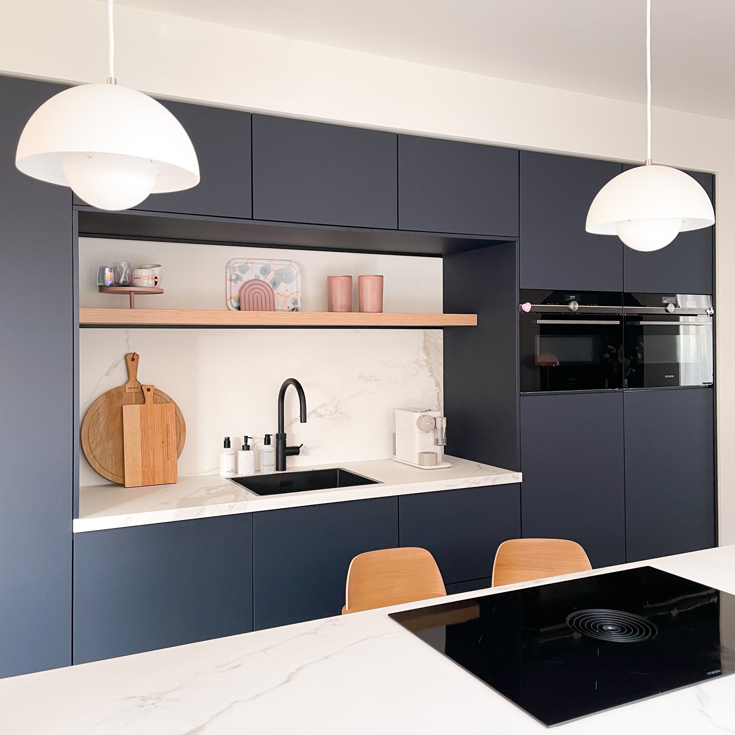 Met haar passie voor kleur was een standaard witte keuken geen optie voor Suzanne. Groen stond bovenaan haar wishlist maar tijdens de zoektocht naar haar droomkeuken stuitte ze op eentje in een nachtblauwe tint. “De keuze was best lastig, maar ons huis is erg licht en kon wel wat pit gebruiken. Dus we gingen vol voor donkerblauw en daar heb ik nog geen moment spijt van gehad!” De keuken vormt het hart van het huis. De eikenhouten Muuto barkrukken rondom het kookeiland zijn de ideale plek om samen te komen met het gezin. “Achter de keuken is een fraai vormgegeven bloktrap geplaatst. Ik wilde van iets functioneels als een trap echt een statement maken. De trap is daarmee onderdeel van de architectuur geworden."