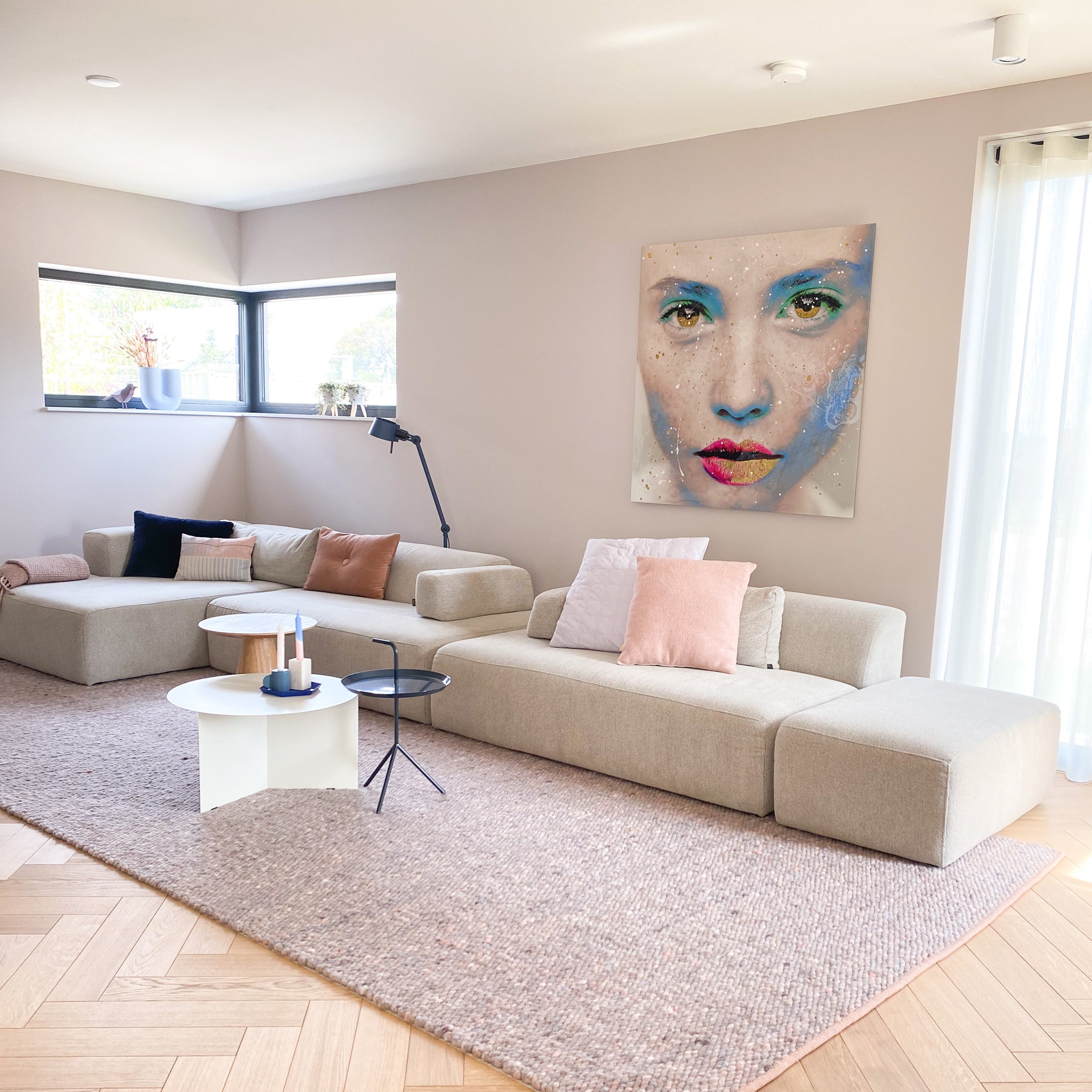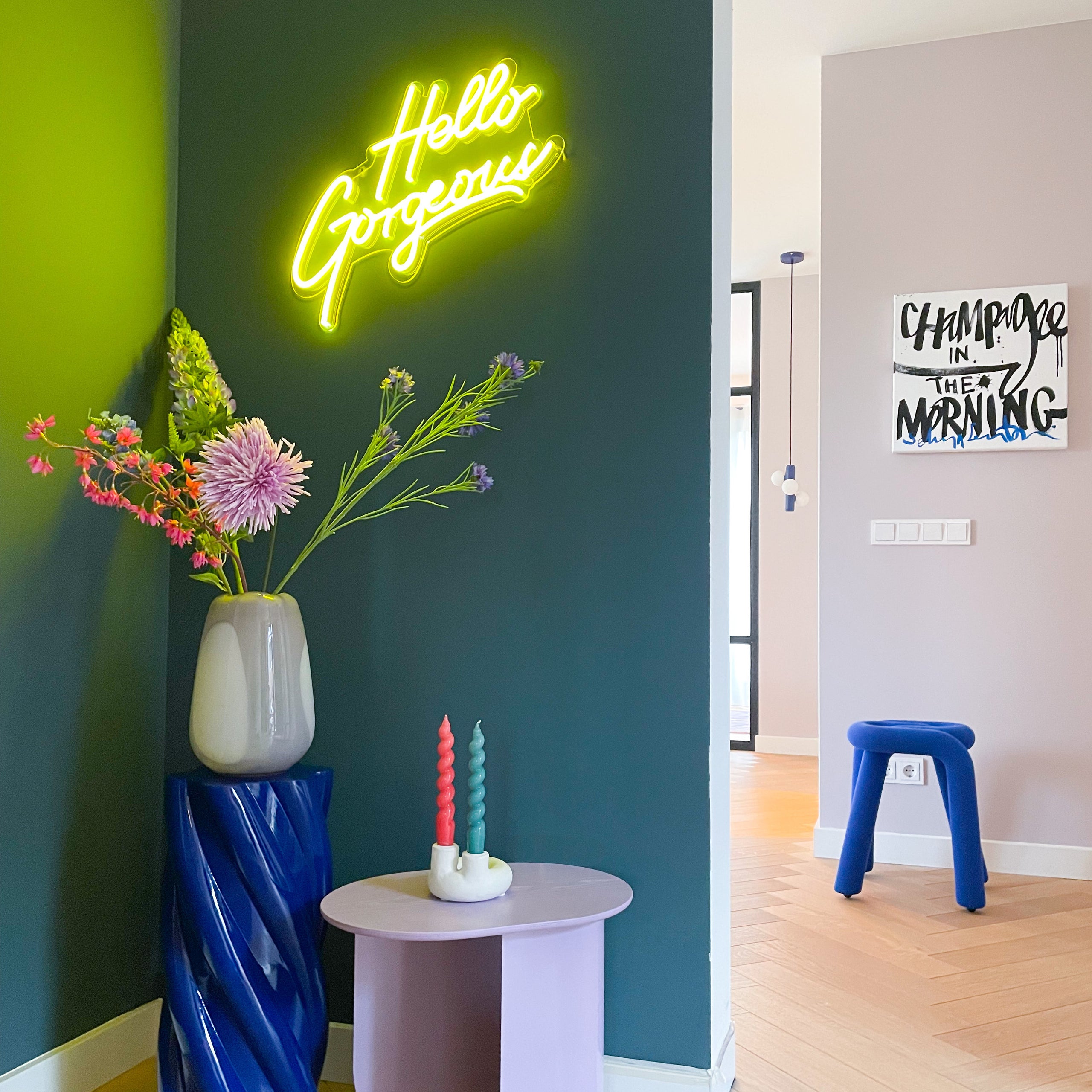 De vele rechthoekige lijnen in haar strakke nieuwbouwwoning geeft Suzanne zachtheid door er flink wat ronde vormen aan toe te voegen. Zo heeft ze niet gekozen voor één salontafel, maar creëert ze een speels effect door verschillende ronde bijzettafels met elkaar te combineren. “Speelsheid en humor spreken mij erg aan in een interieur. Het hoeft allemaal niet zo serieus. Een gek gevormd krukje of een neonlamp met ‘hello gorgeous’ aan de muur? Ja graag! Dit zorgt meteen voor een glimlach op je gezicht.” Ronde vormen zijn niet alleen terug te zien in grote items zoals de ovale eettafel of de prachtige Petite Friture hanglamp, maar ook in kleinste details zoals de spiegel in de slaapkamer of de subtiele afwerking van de deurklinken.
