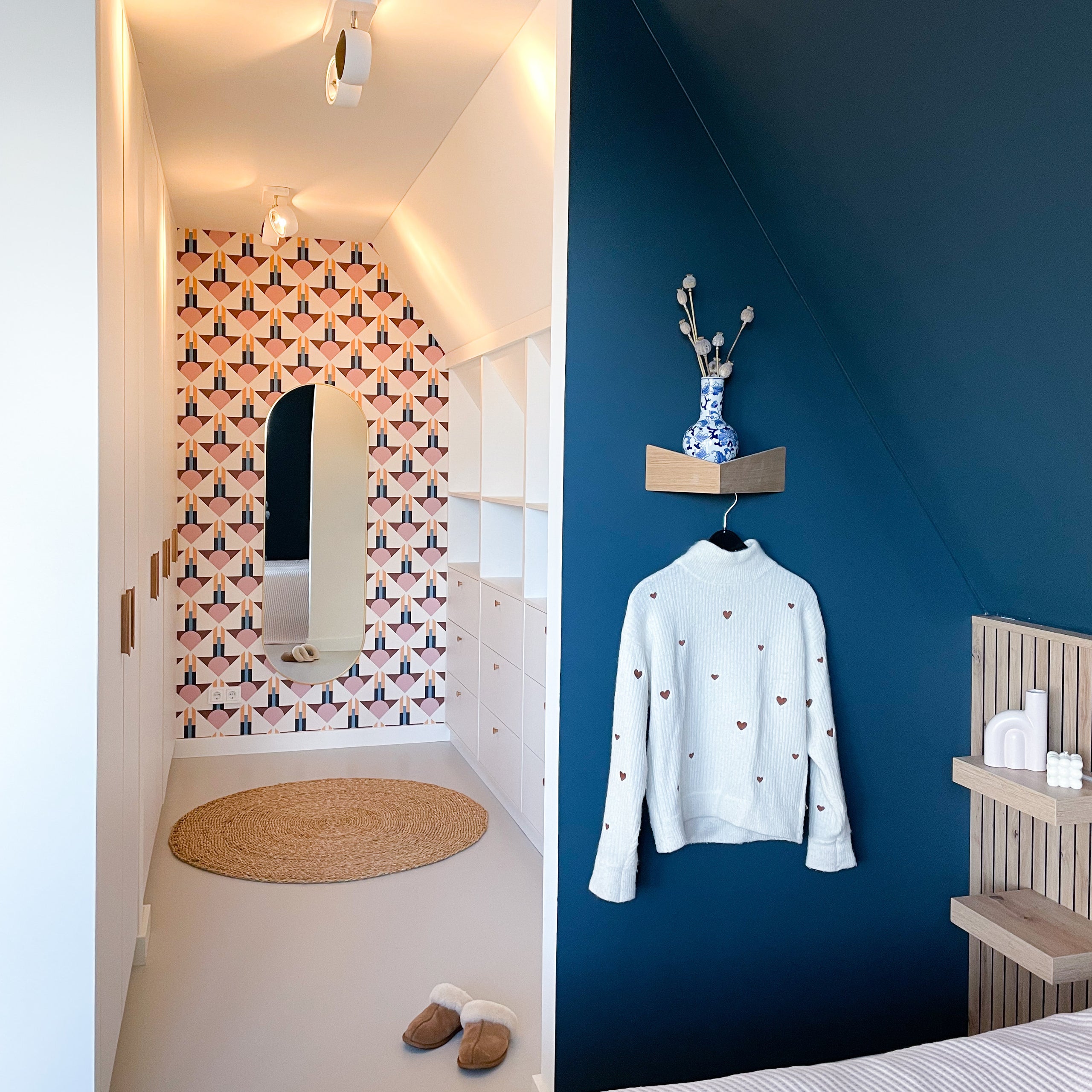 Suzanne creëert eenheid in huis door vaste basiskleuren als uitgangspunt te nemen in haar brede kleurenpalet. Zo komt het donkerblauw van de keuken, mintgroen van de badkamertegels en het lichtroze op de muur terug door haar hele huis. “Daarbij zorgen kobaltblauwe items voor een fijn contrast zonder dat het te druk wordt. Spannende kleurencombinaties maken je interieur interessant waardoor je er niet snel op uitgekeken raakt", vertelt Suzanne. De gietvloer op de bovenverdieping en de zwarte lijnen van de stalen deuren zijn een moderne tegenhanger in haar zoete interieur.