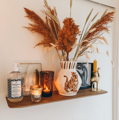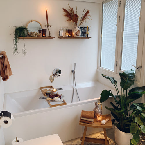 Door een kleurenpalet van terracotta en okergeel te combineren met messing en natuurlijke materialen ontstaat er een warme bohemian sfeer. Met hout breek je het geheel en voorkom je dat je witte badkamer een kille uitstraling krijgt. Kies bijvoorbeeld voor een houten wandplankje en kleedt hem aan met een aantal boho woonaccessoires, zoals een gouden kandelaar. Zo maak je een kale, witte muur een stuk gezelliger.
