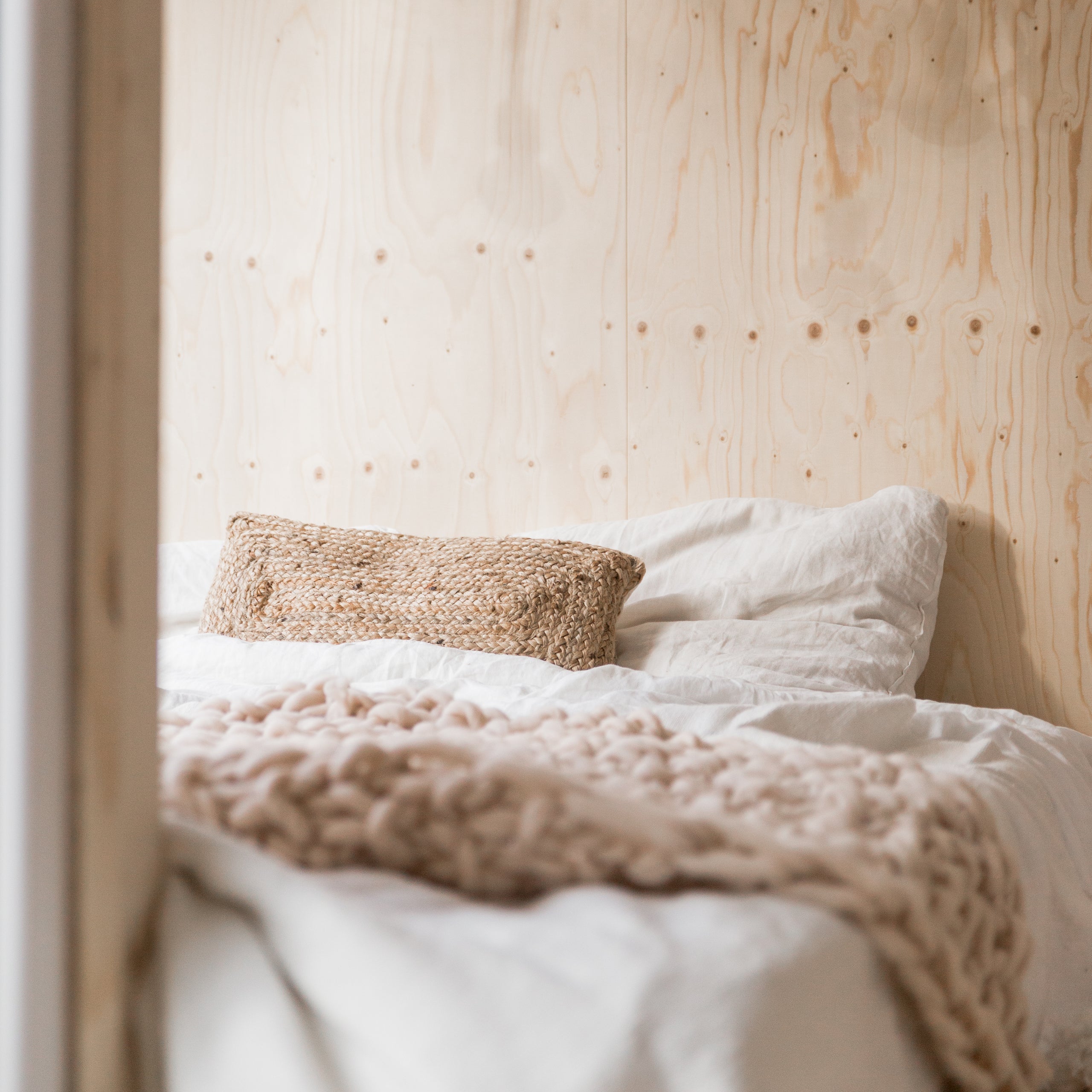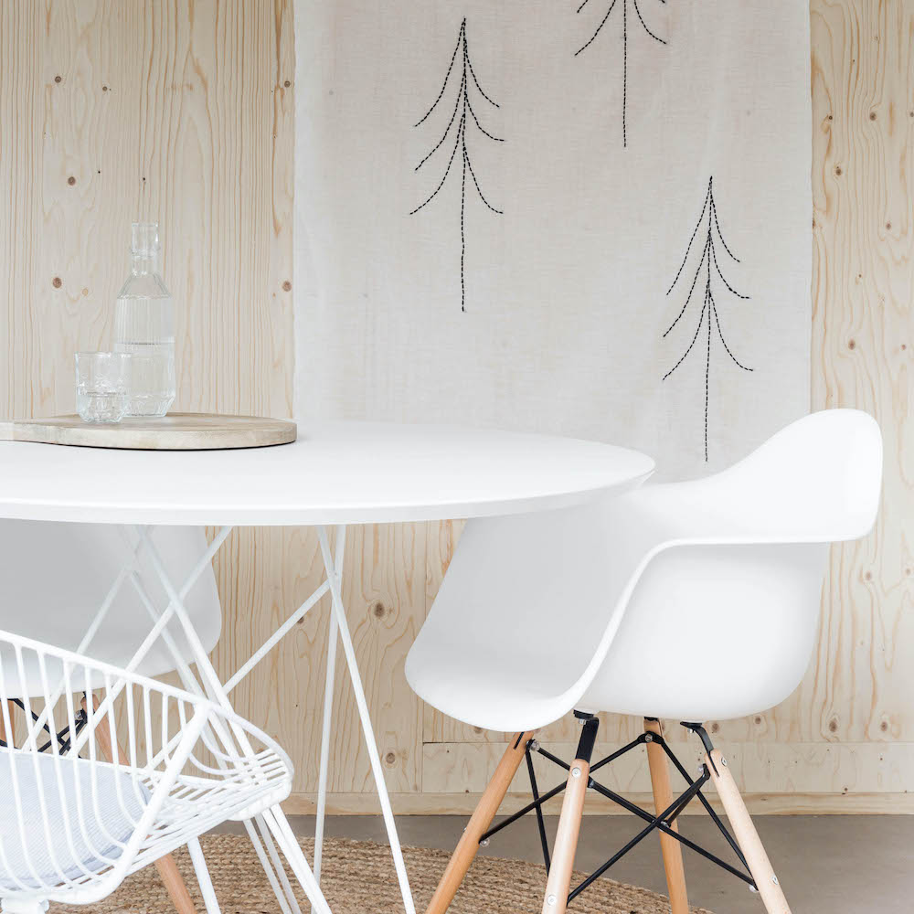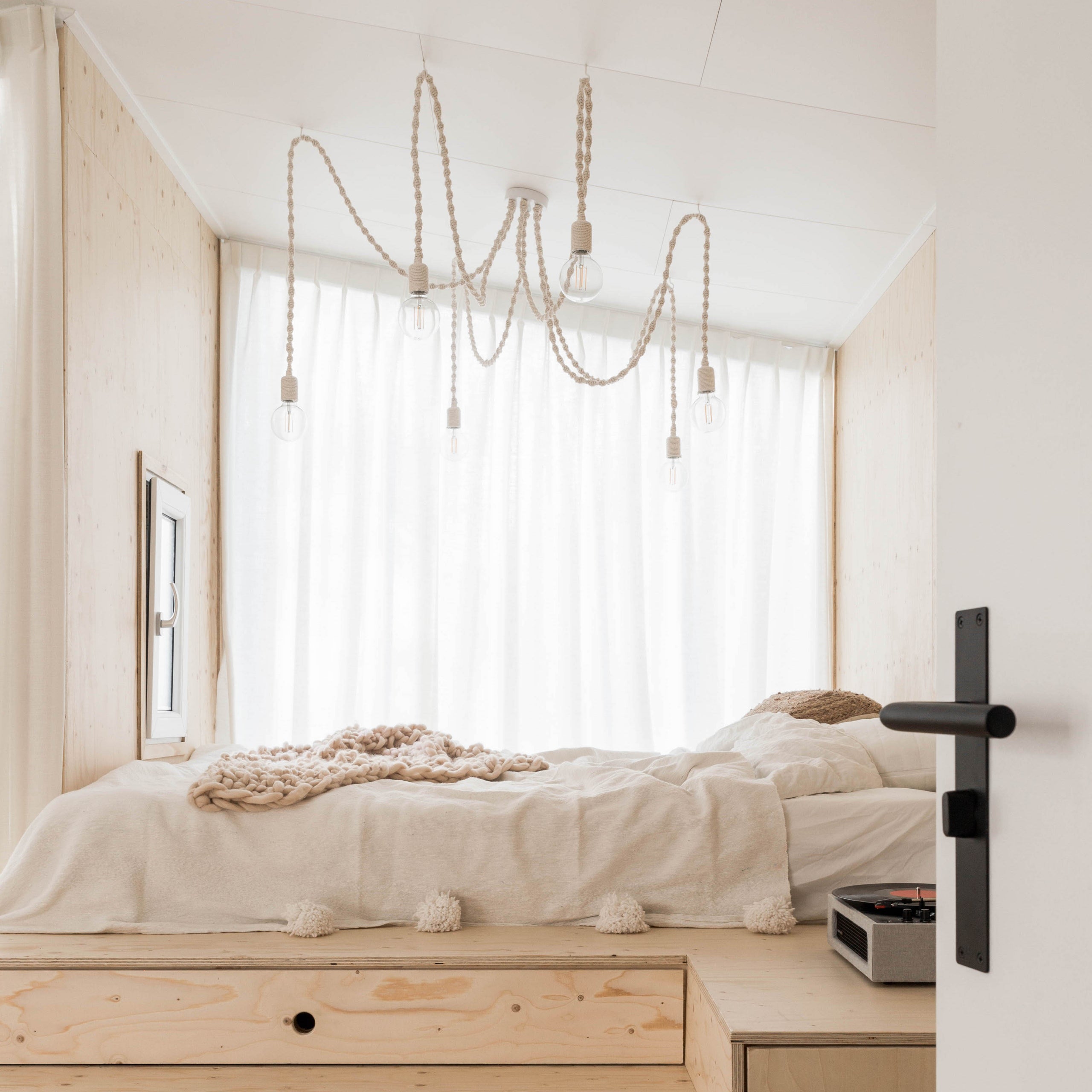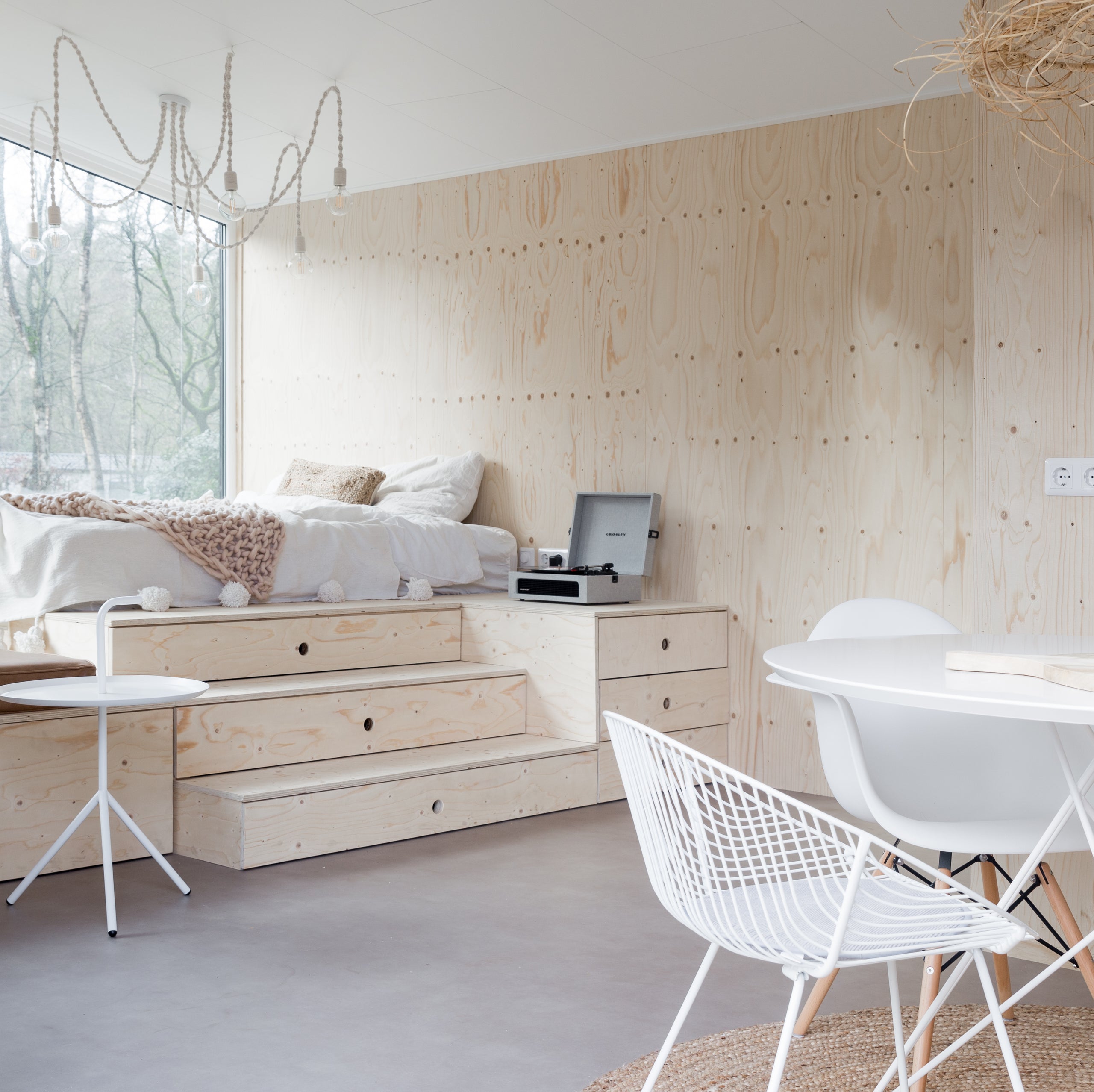 Door de grote, schuine ramen en het verhoogde bed ervaar je het optimale 'bosgevoel' wanneer je in het tiny house verblijft. Het interieur van het tiny house is een lust voor het oog, zeker voor liefhebbers van de Scandinavische woonstijl. Als het aan Nikkie had gelegen was de inrichting helemaal wit geweest, maar voor Marc was dat wel erg extreem en niet praktisch. Ze kozen daarom voor een lichte, Scandinavische basis die rust uitstraalt en voegden licht hout toe om het warm en knus te maken. Om het geheel af te maken werd het tiny house interieur gestyled met typische Scandi meubels, zoals de bekende HAY DLM tafel en witte kuipstoelen.