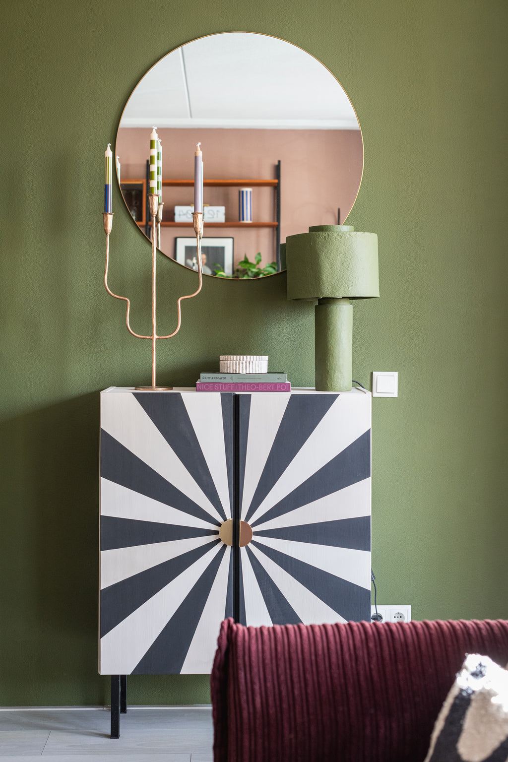 De leefruimte weerspiegelt de eclectische smaak van het stel: een mix van retro met een barok randje, een vleugje hotel chic en flink wat levendige kleuren. Rick en Jean-Paul weten als geen ander hoe je een huis smaakvol inricht: "We begonnen het plan voor dit interieur met een kleurpalet, en daarna volgden vormen en materialen." zegt Jean-Paul. Hoe doe je dat in een huurhuis? "Gewoon binnen de lijntjes kleuren!" De woonkamer draait bijvoorbeeld om de opvallende bordeaux by fonQ Ribbon bank en de vintage wandkast, die perfect past bij de tinten mosgroen, lichtroze en diep paars.