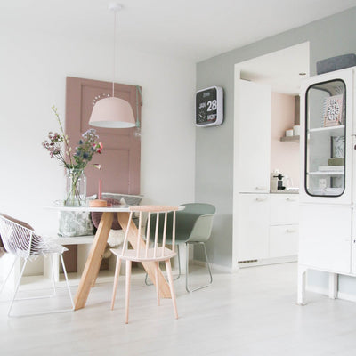 De stijl van Mariët is te omschrijven als een combinatie van Scandinavisch en landelijk. Als favoriete merken noemt ze Muuto, Ferm Living & HAY. "In huis hebben we gekozen voor een lichte basis, waar zachte pasteltinten, design en vintage elkaar ontmoeten. Ik hou er van als kleuren terugkomen in mijn interieur, zodat er een fijne balans ontstaat." Mariët koos voor een lichte basis in haar interieur: de keuken, de vloeren en de muren kregen allemaal een witte kleur.