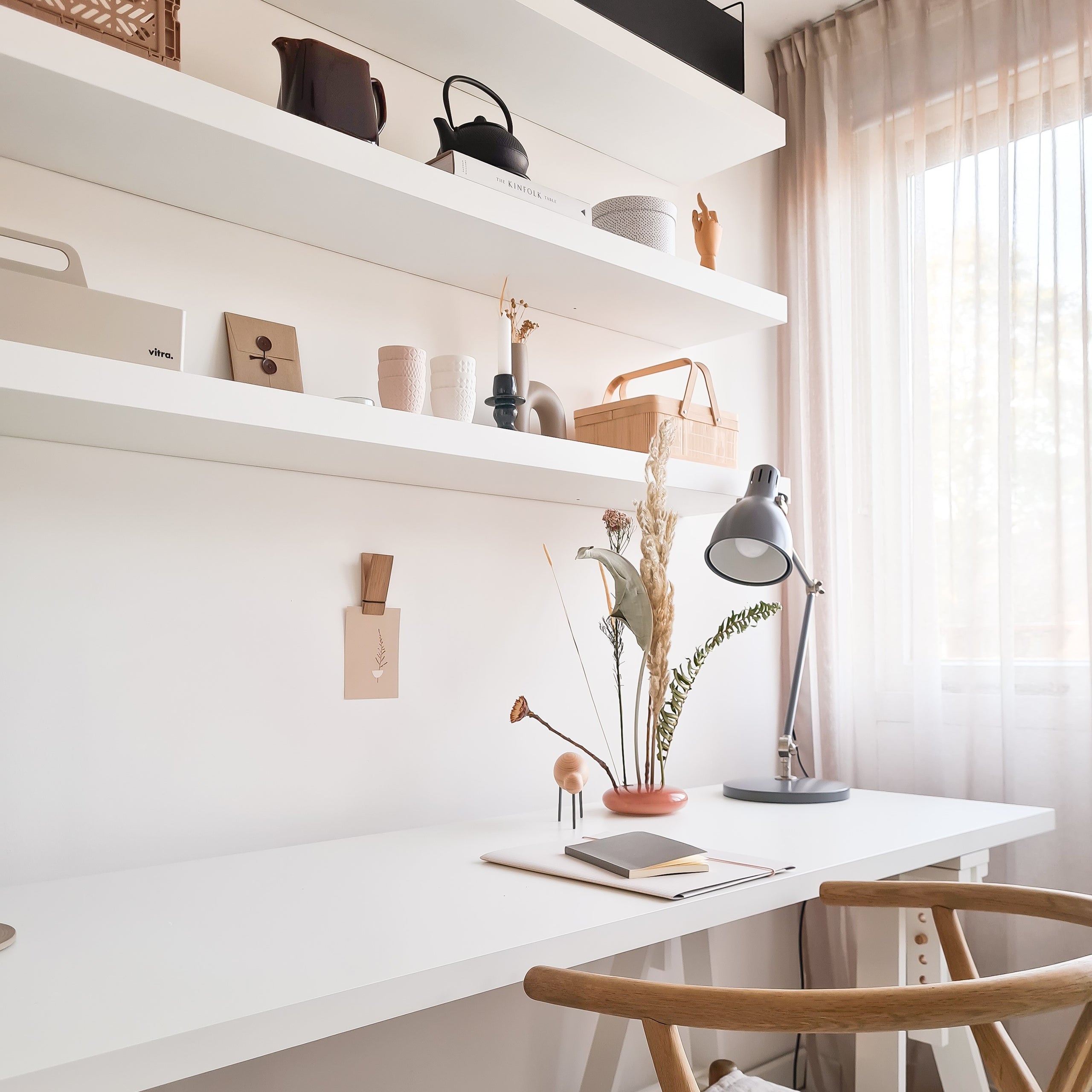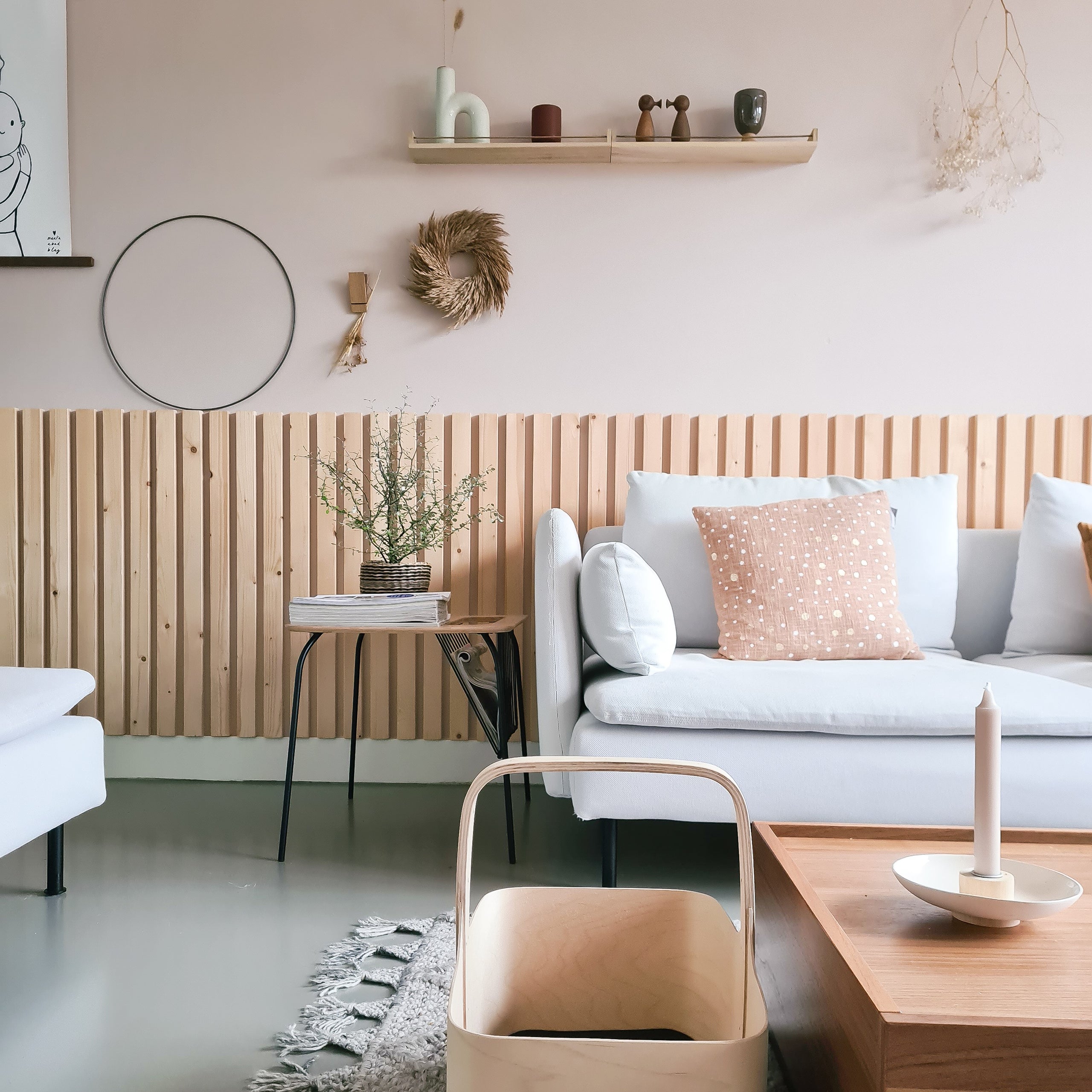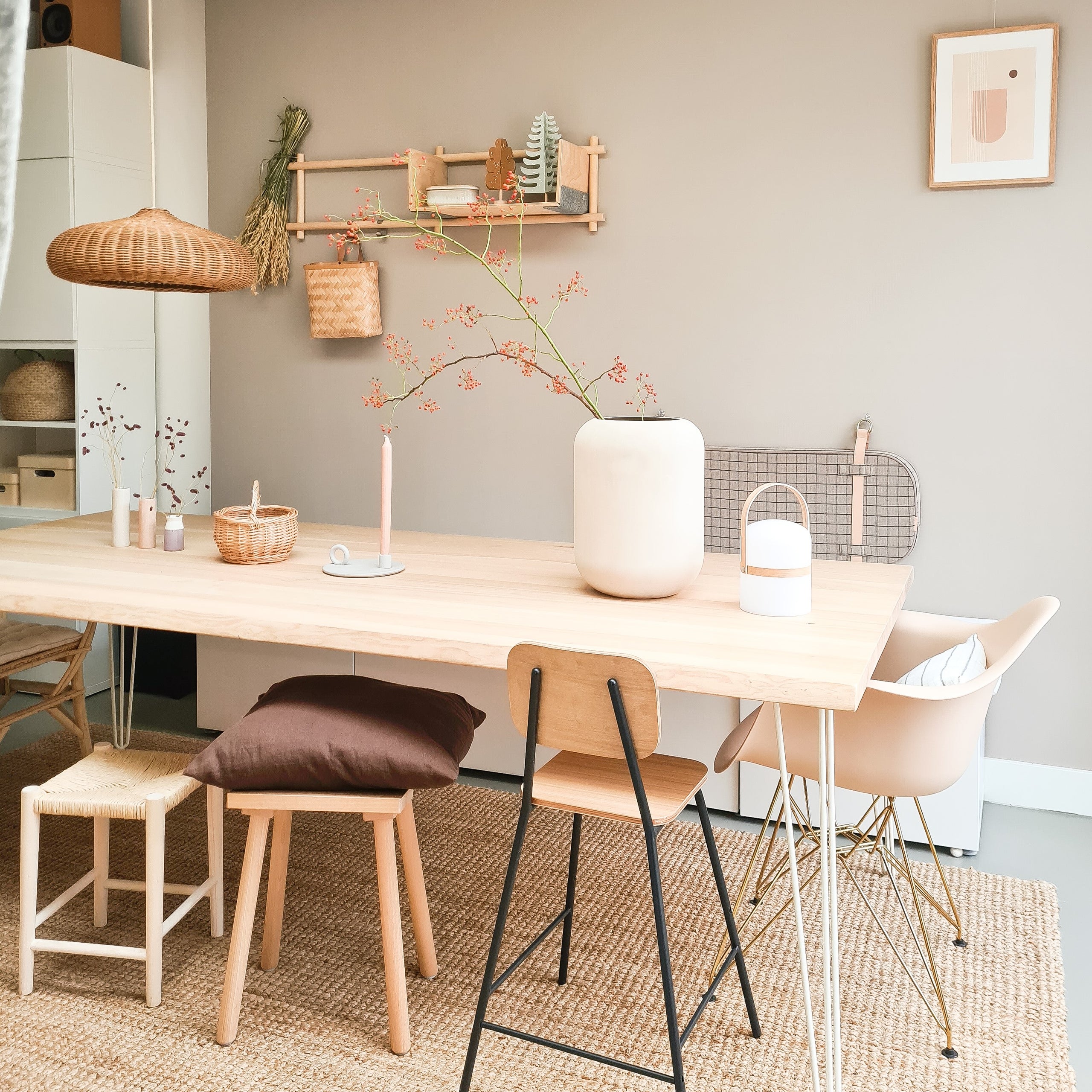 Samen met haar vriend Tim creëert Monique veel zelf. “Mijn vriend is erg handig. Ideeën die bij mij opborrelen weet hij perfect uit te voeren. Heerlijk om zo samen bezig te zijn!” Ze maakten onder andere de lambrisering van latjes in de woonkamer in een typisch Scandinavische stijl en de stang in de keuken. “De stang in de keuken is een houten stok die ik zelf goudkleurig heb gespoten. Dat is veel goedkoper dan een echte messing stang. Ik vind het heerlijk om met die stang verschillende looks te creëren en te stylen.” Ook het bureau in de woonkamer heeft het stel vanwege het vele thuiswerken samen van duurzaam materiaal gemaakt.