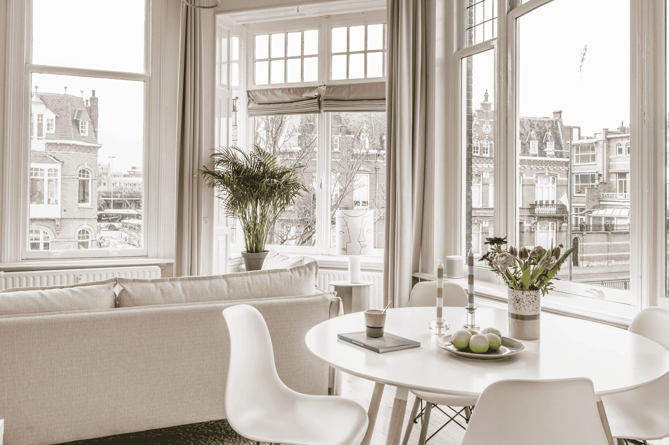 De authentieke woning is het perfecte canvas voor haar Scandinavische interieur. "Ik houd van een neutrale basis met veel wit en voeg hier kleur aan toe door te experimenteren met accessoires in vrolijke pasteltinten. Denk aan een opvallende vaas, gekleurde kaarsen, of een lampenkap met een bijzonder patroon." Het vele lichtinval en de hoge plafonds maken Kim's woning bijzonder. Door de vele karakteristieke elementen voelt het als een knus, maar modern stadsappartement. En dankzij de hoge ligging schijnt vaak de zon naar binnen. De erker is dan ook haar favoriete plek in huis.