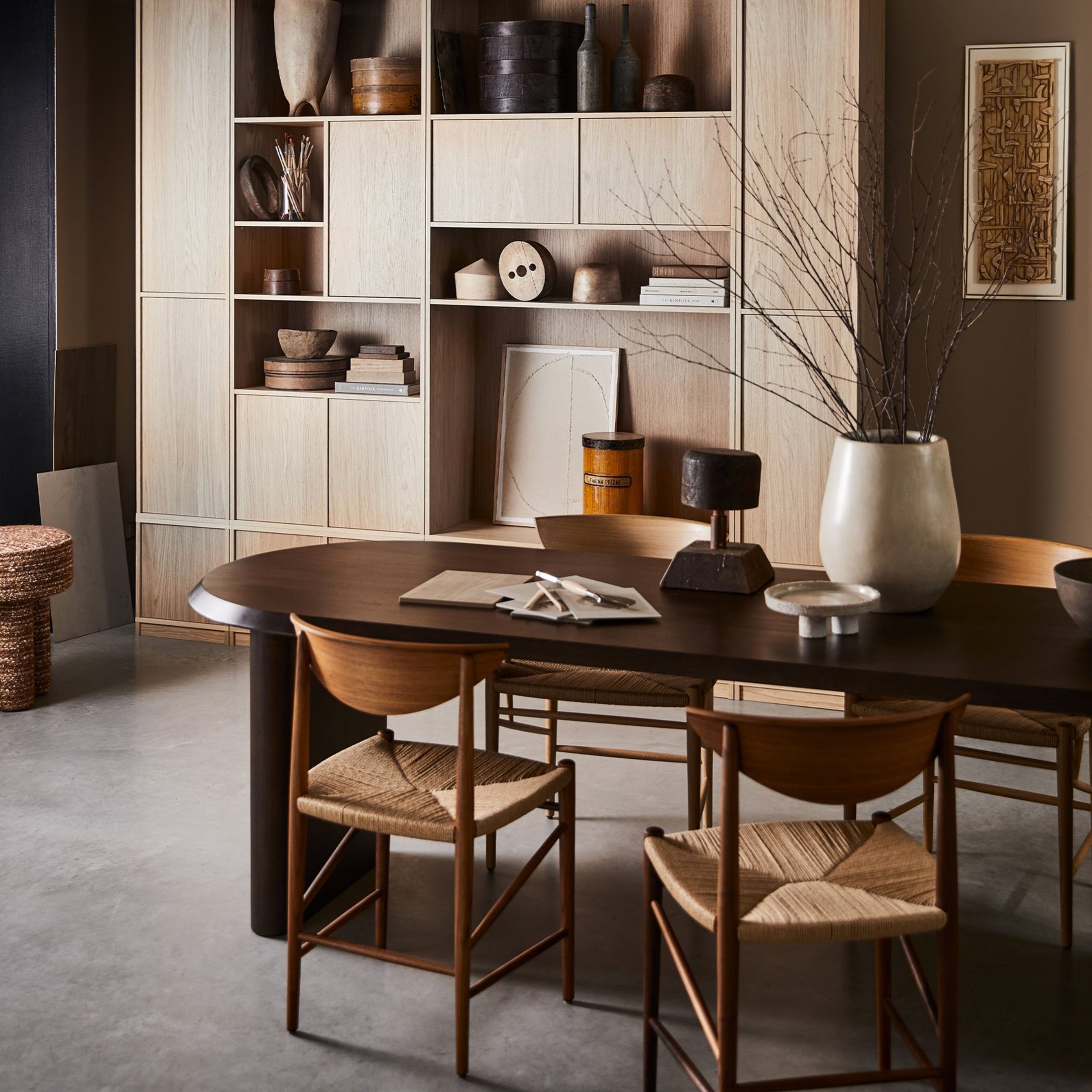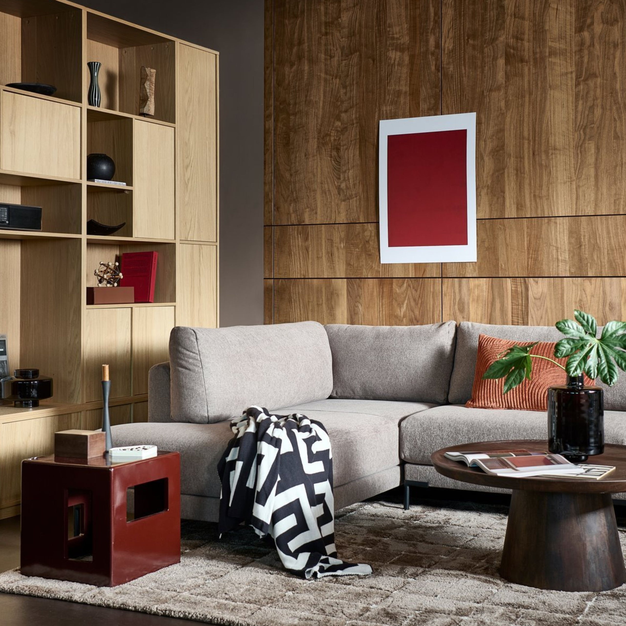 Exact dezelfde houttint terugvinden voor al je meubels is nogal een uitdaging. Gelukkig kan het combineren van verschillende houtsoorten en tinten juist voor harmonie zorgen, zolang er genoeg verschil in kleur en structuur is. Gebruik contrast om diepte te creëren: lichte meubels op een donkere vloer of andersom. Let er wel op dat de ondertonen van de houtsoorten bij elkaar passen: warm met warm, koel met koel. Zo hoef je je niet te binden aan een enkele houtsoort, en wordt inrichten een stuk gemakkelijker.