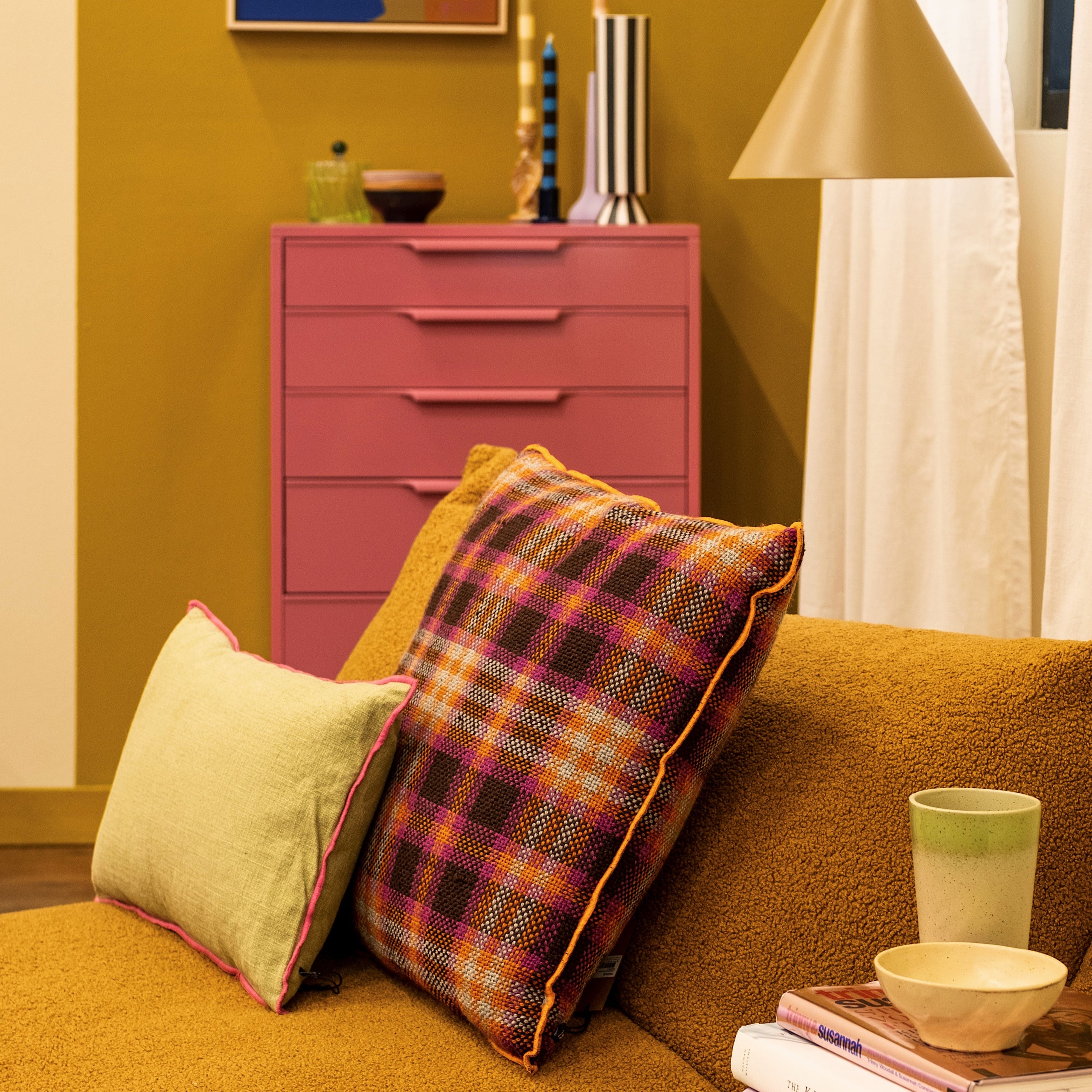 Breng kleur in de ruimte door te werken met textiel in de knalkleuren van de accessoires. Naast verlichting zorgen ook sierkussens voor sfeer. Ga voor grafische patronen en strepen. Voeg als laatst een fijn vloerkleed toe, zo verbind je de verschillende meubels in de kamer én zorgt het ervoor dat de kamer beter geïsoleerd is.