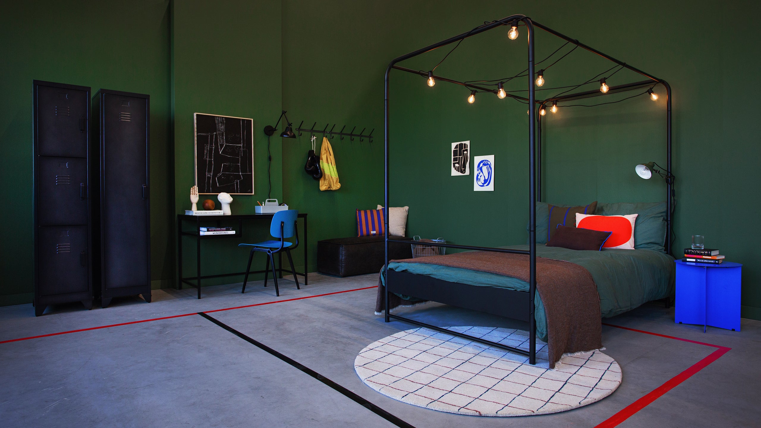 Een industriële stijl is ideaal als leidraad om een stoere tienerkamer in te richten. Denk bij industrieel aan robuuste items en stalen details. Maak gebruik van legergroen, bruin- en grijstinten om een passende look te creëren. In een typische industriële ruimte wordt er weinig gebruik gemaakt van kleur, maar in de tienerkamer mag het allemaal wel wat minder serieus. Voeg knalkleuren toe voor wat contrast. Kies bijvoorbeeld voor accenten in kobaltblauw of fel oranje. Dit laat je terugkomen in kleinere meubels, zoals een nachtkastje, bijzettafeltje of in woonaccessoires. Houd je tiener van sport? Dan is het tof om met rood en zwart tape lijnen op de grond te creëren. Zo krijg je het gevoel van een gymzaal!