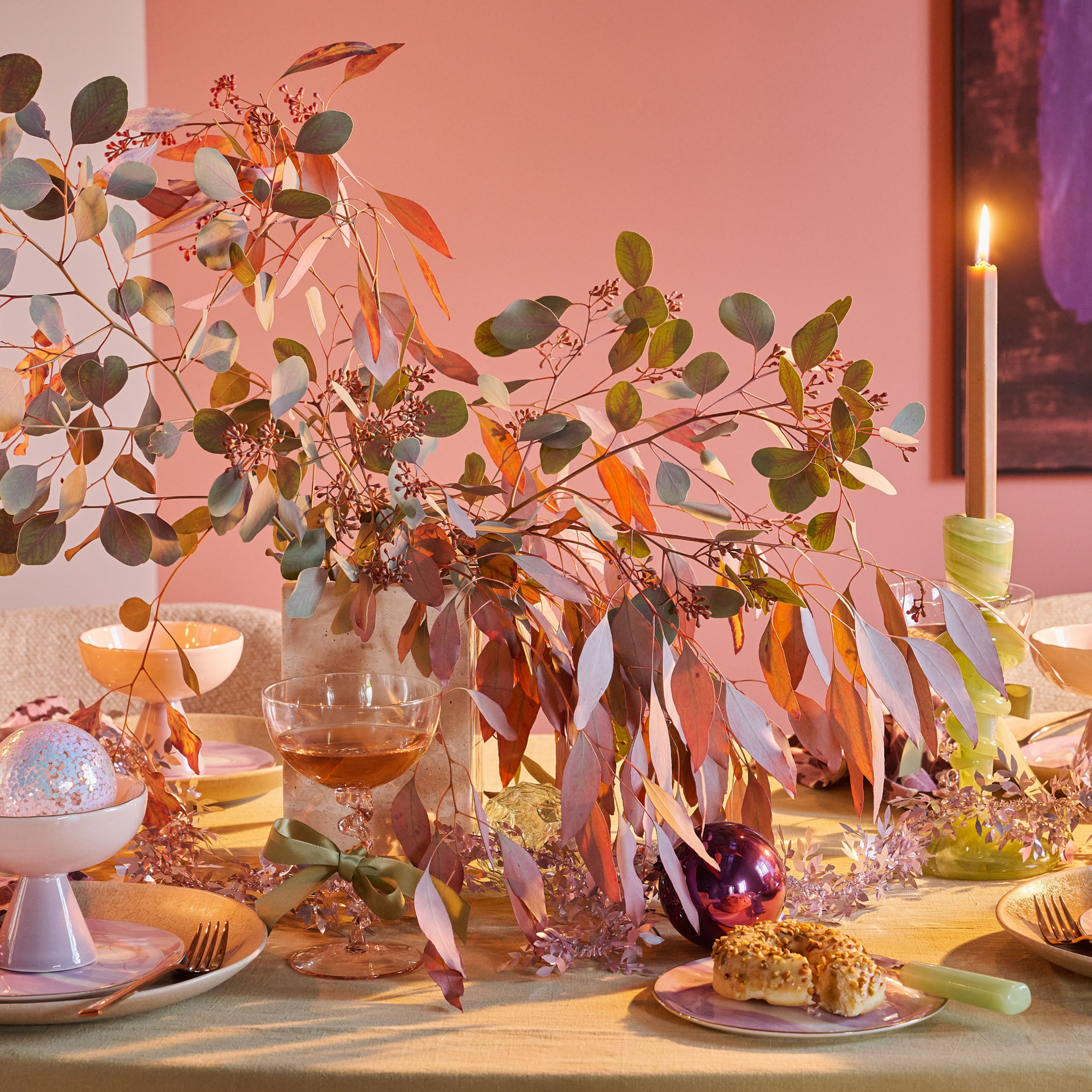 De balanced aesthetics look begint bij een lichte, harmonieuze basis. Zachte pasteltinten zoals lila, blush, peach en mint geven de tafel een serene uitstraling. Het kleurenpalet voelt rustig en verfijnd, maar heeft genoeg frisheid om toch direct in het oog te springen: de tinten zijn namelijk niet dof. Ze vormen samen dat gentle palette dat de tafel een lichte, moderne en ontspannen sfeer geeft. Dat is soms maar al te fijn tijdens de drukke feestdagen: een rustpunt te creëren.