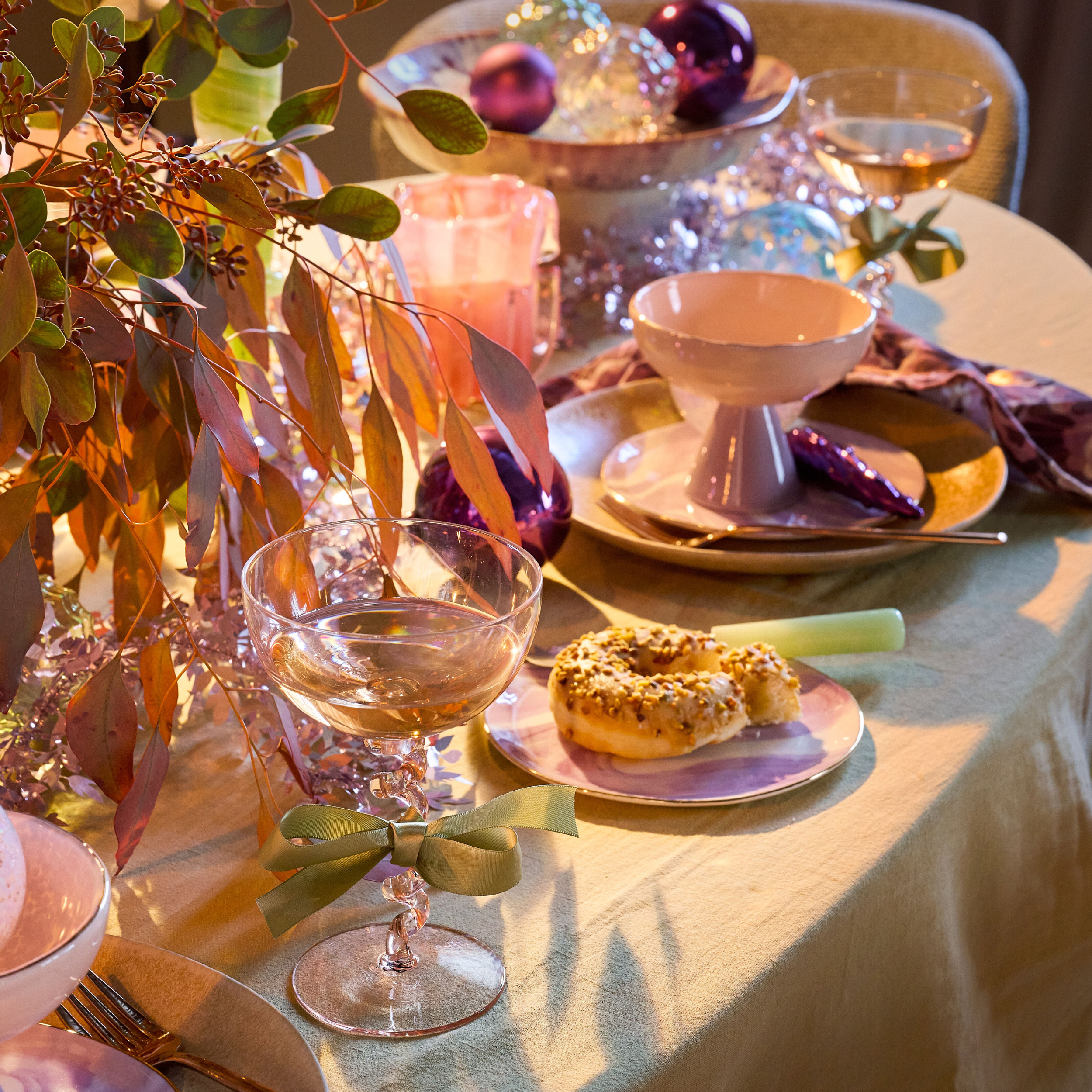 - Kies voor iridescent glaswerk en kerstballen voor een subtiele twinkeling in het kaarslicht.