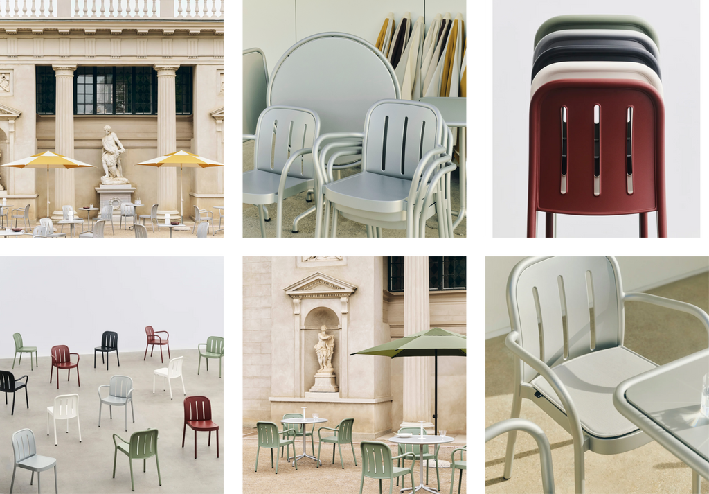 Nieuw dit seizoen is de Deville Collection, ontworpen door Julien Renault. Deville is HAY’s eigentijdse knipoog naar de klassieke bistroset, maar dan met royale proporties en zacht gebogen frames. De stoelen hebben een open, vriendelijk karakter dat uitnodigt om te blijven hangen, of je nu koffie drinkt in de ochtendzon of aanschuift voor een lange avond buiten. De collectie is gemaakt van minstens 60% post-consumer gerecycled aluminium, is roestbestendig en daardoor gebouwd om lang mee te gaan. Tegelijk blijft alles licht genoeg om makkelijk te verplaatsen en te herschikken. De lijn bestaat uit stapelbare stoelen en armstoelen, plus compacte tilt-top tafels in verschillende vormen en maten.