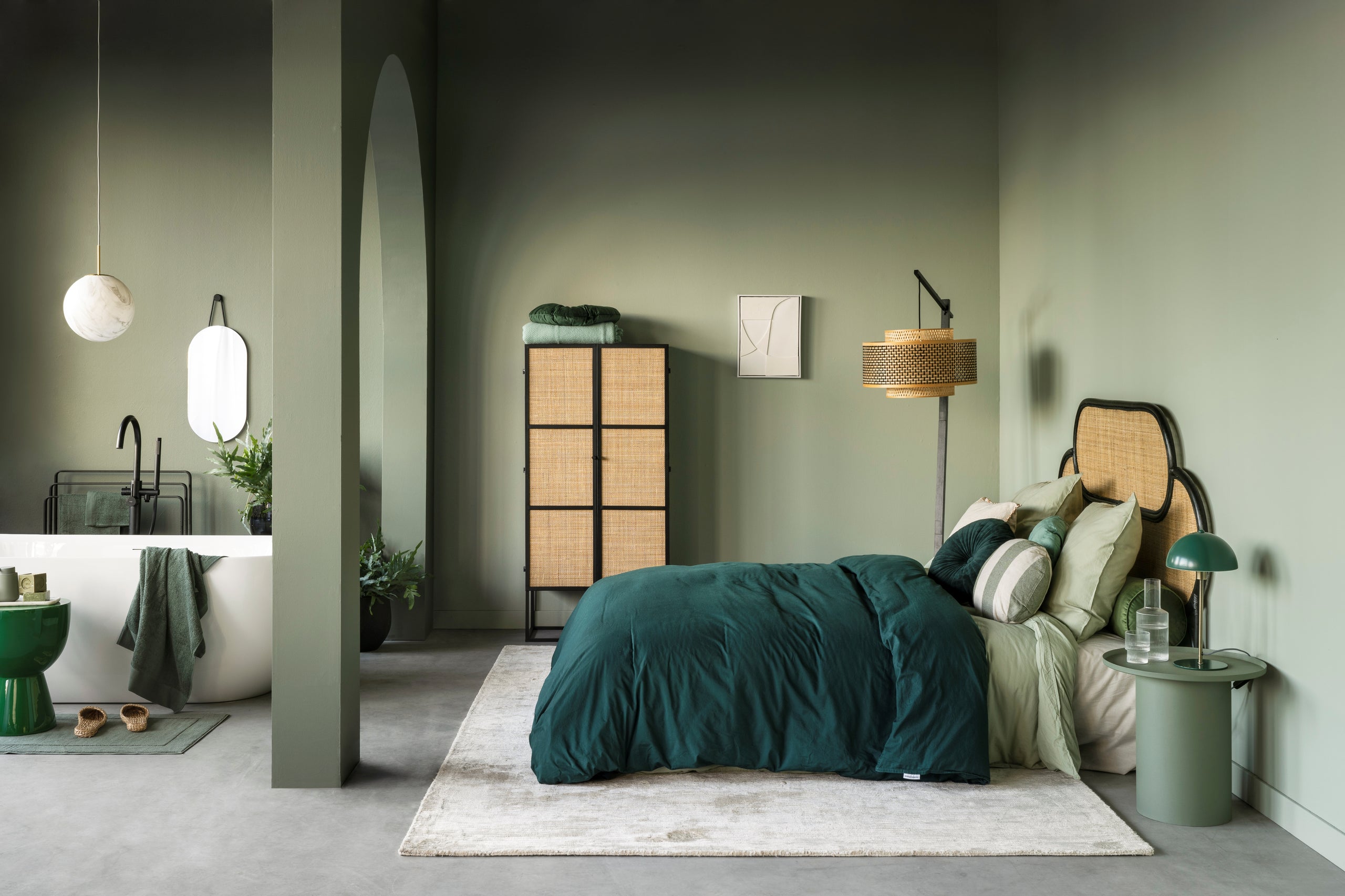 Muurkleur: Flexa Soothing Moss (boog en linkerwand) & Airy Foliage