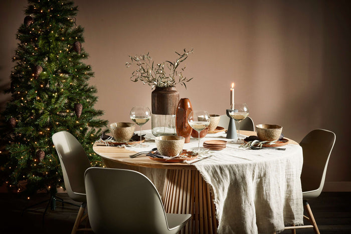 Dek de tafel deze kerst extra feestelijk met aardse kleuren en natuurlijke materialen.
