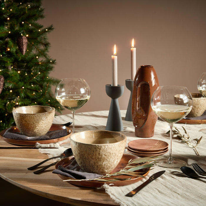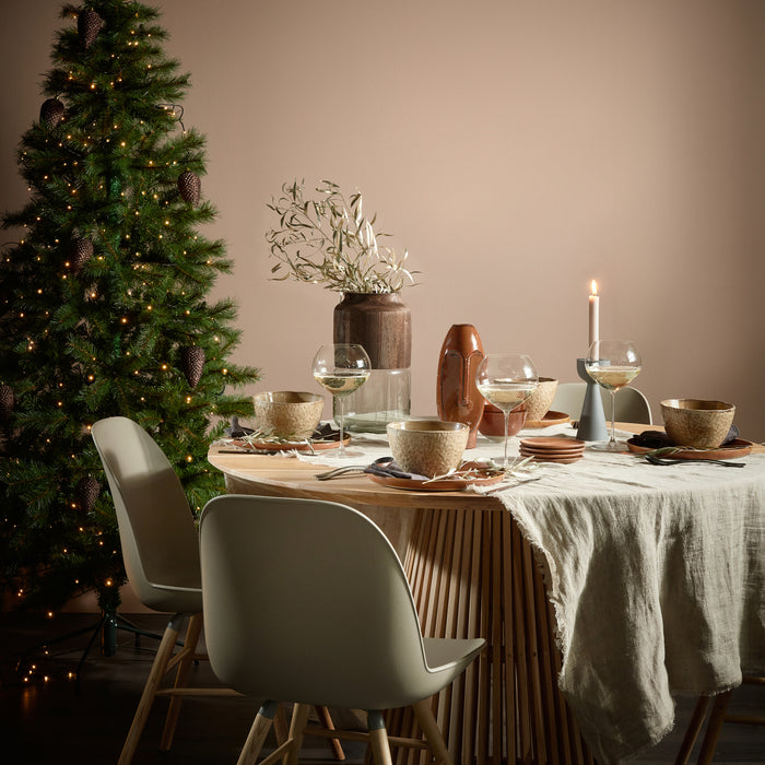 Tijdens de feestdagen brengen we veel tijd door in de eetkamer: lekker lang tafelen en genieten van een diner waar je je urenlang voor hebt uitgesloofd in de keuken. Zorg daarom dat ook jouw tafelsetting om door een ringetje te halen is en kleed deze extra feestelijk aan voor het kerstdiner. Laat je voor een on trend eettafel inspireren door de natuur. Begin bijvoorbeeld met een linnen tafelkleed. Kies vervolgens voor servies van aardewerk of keramiek in verschillende bruintinten voor een mooi ton-sur-ton effect. Serveer je gerechten in schalen en kleine hapjes op een houten serveerbord. Het kerstdiner eet je natuurlijk met een speciaal bestek. Ga voor een gouden set of een mat zwarte variant. Maak de look compleet met mooie wijnglazen en opvallende vazen en kandelaars voor een feestelijk tintje. Zo creëer je tijdens kerstmis een rustgevende sfeer aan tafel!