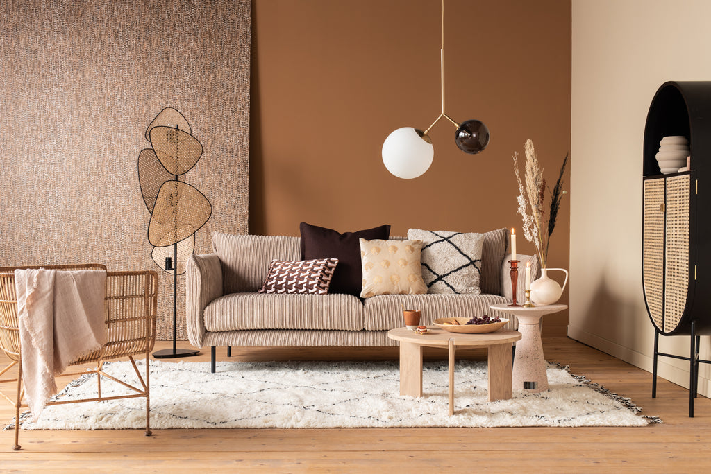Een sfeervol interieur creëer je door te kiezen voor een warm kleurenpalet met roze en terracotta. Ga voor groots en verf niet één muur, maar alle muren. Door zwarte accenten toe te voegen oogt het geheel strak en krijgt het een volwassen uitsraling. Voeg daarnaast verschillende woonaccessoires in dezelfde tinten toe, zoals een terrazzo bijzettafel. Hiermee creëer je eenheid in de ruimte. Heb je mooie souvenirs of persoonlijke items die je in de spotlight wil zetten? Groepeer deze, zodat het één kunstwerk wordt. Tot slot kan een comfortabele bank in de woonkamer natuurlijk niet ontbreken. Kies een exemplaar met bijpassende hocker. Deze schuif je gemakkelijk bij op een lui avondje Netflixen op de bank.