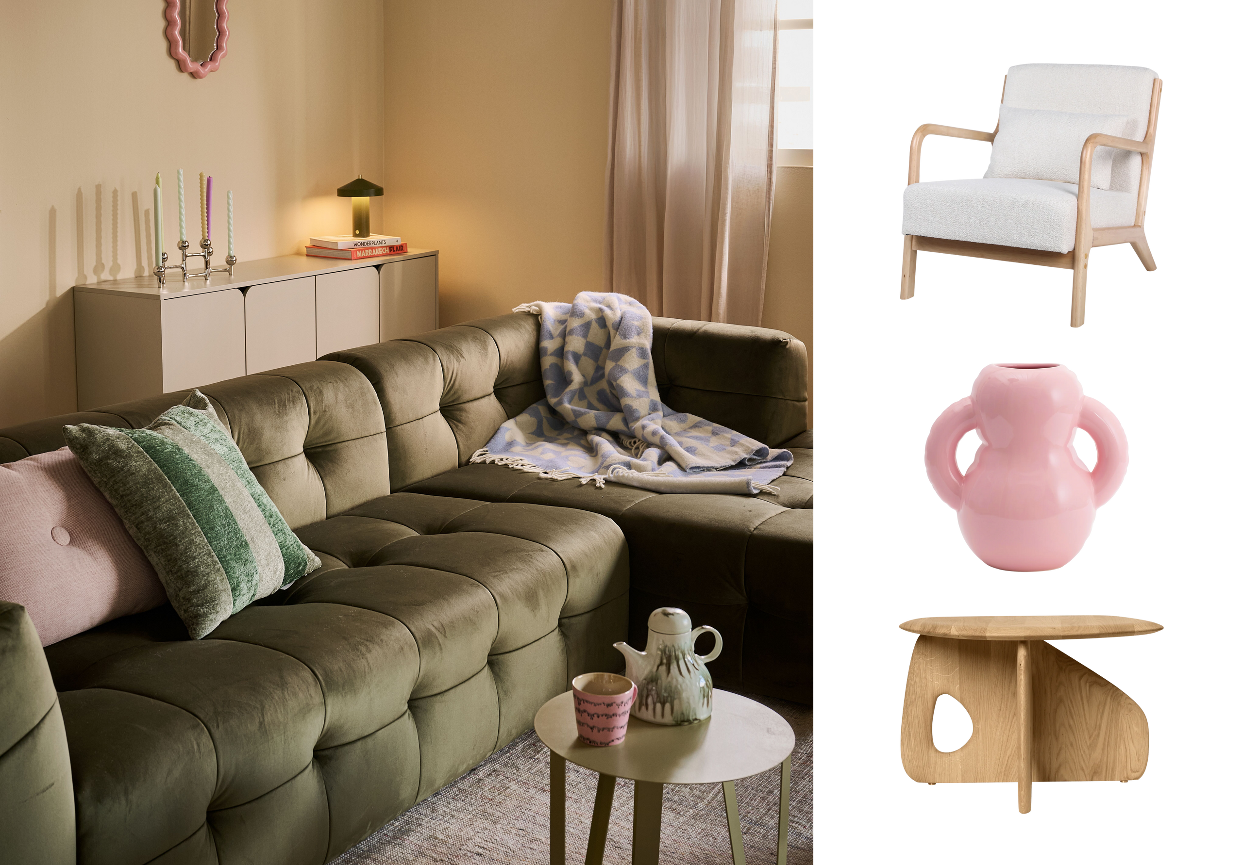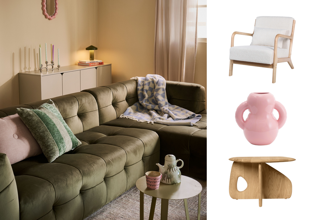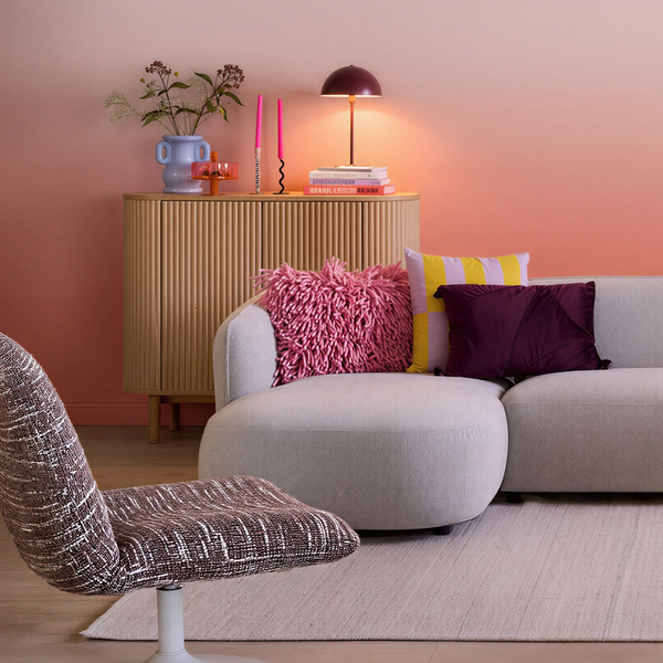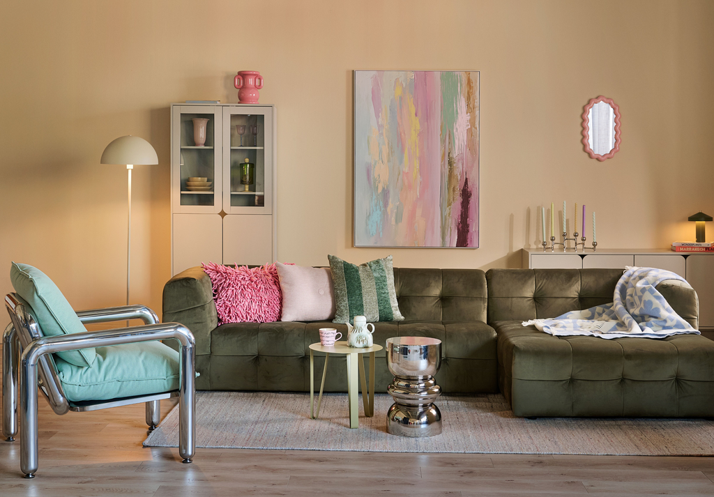 Daaromheen zie je zachtere en koelere tinten terugkomen. Mintgroen sluit logisch aan op het groen van de bank en voelt fris zonder hard te zijn. Bubblegumroze brengt juist speelsheid, maar blijft in balans doordat het gecombineerd wordt met rustige kleuren en alleen in accessoires terugkomt. Ook de blauwtinten in het plaid en het kunstwerk zorgen voor verkoeling en verbinden de verschillende kleuren met elkaar.