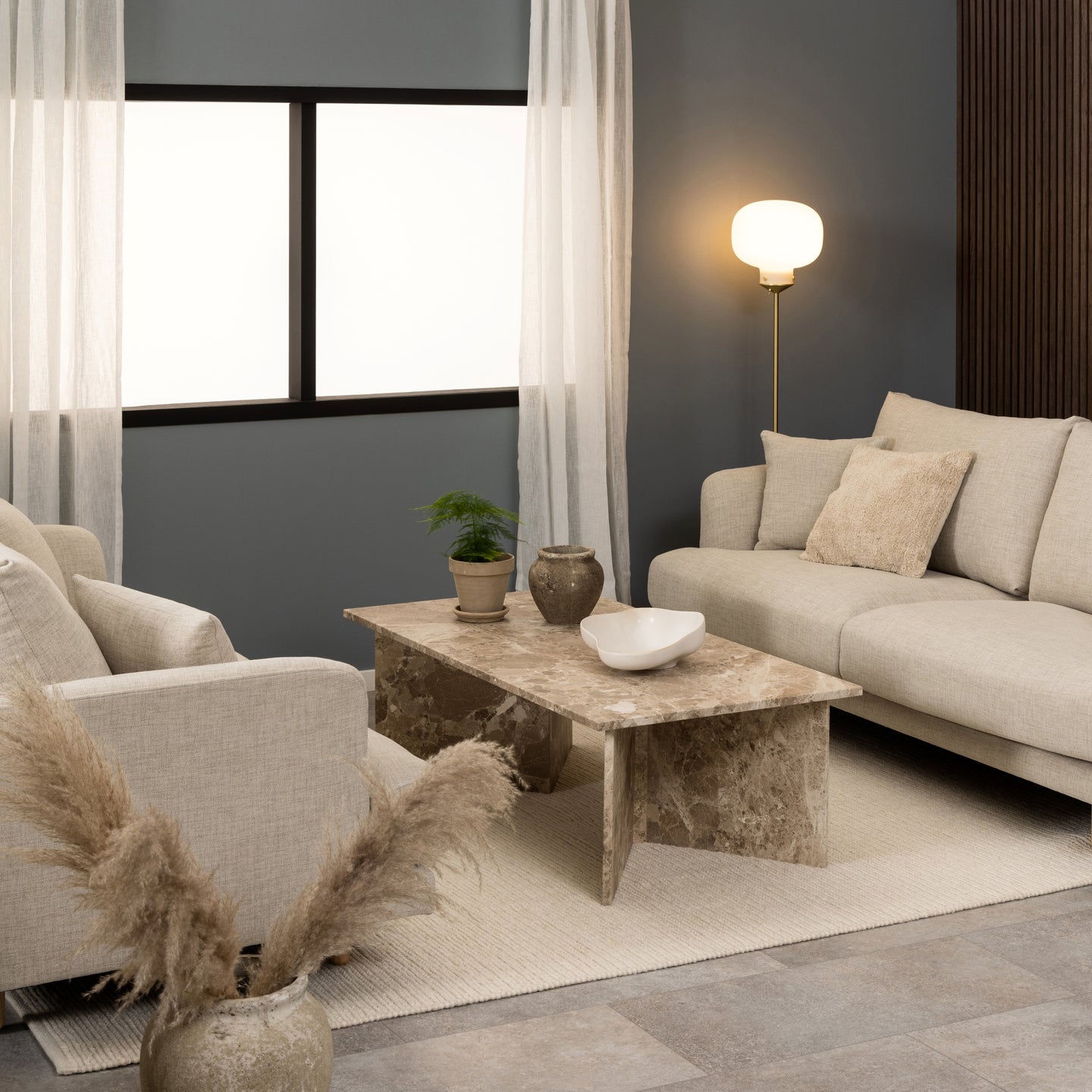 Het leuke van aparte salontafels met elkaar combineren, is dat je kunt spelen met verschillende hoogtes. Houd bovenstaande maten aan voor je salontafels, maar wissel af in hoogte voor een speelse twist.