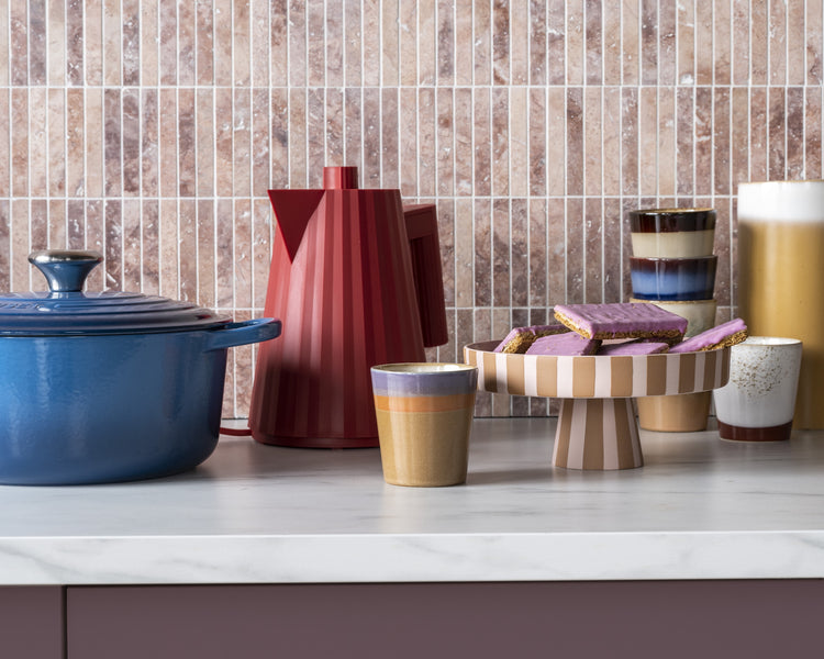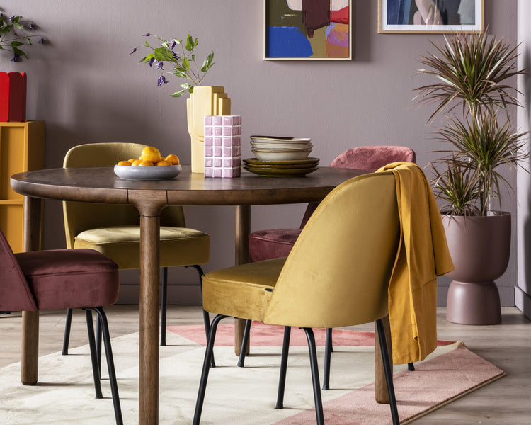 Maak je eetkamer klaar voor het najaar met zachte tinten zoals lichtroze, lila, oranje en cognacbruin, die samen een ultiem cozy herfstgevoel creëren. Niks wordt overgeslagen: muren, plafonds en gordijnen baden in gedurfde kleuren. Accenten in mint en rood maken het geheel af. Bold en gezellig, zo komen de najaarskleuren in je eetkamer volledig tot hun recht. Gestreepte sierkussens en kunstzinnige decoraties vullen de ruimte, met opvallende lampen, retro itemsen golvende statement meubels. Alles draagt bij aan een comfy en warme sfeer. Perfect voor de herfst!