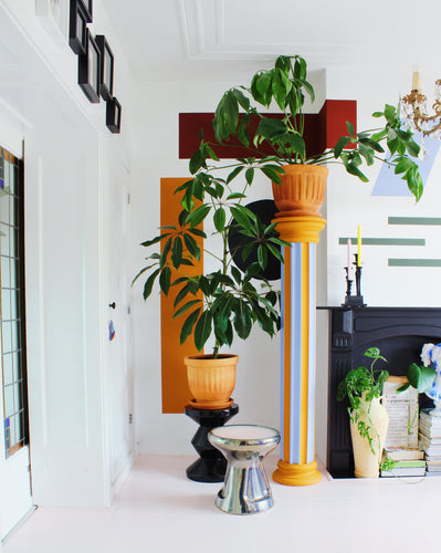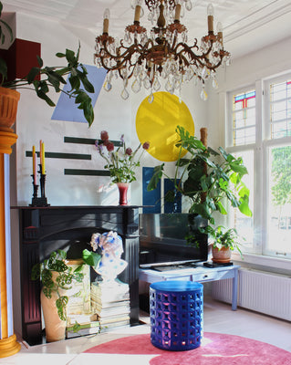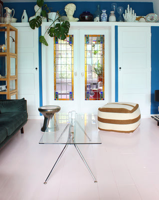 In het interieur zijn ook Griekse invloeden gekomen, een fascinatie van Sharvin. “We hebben vrij veel pilaren in huis, zo'n zes stuks. Deze hebben allemaal een andere hoogte en geven veel sfeer aan de ruimtes. Vaak zetten we hier planten op om de hoogte van de ruimte te laten zien". De meeste pilaren zijn als DIY-project geverfd in bijvoorbeeld geel en lichtblauw, waardoor ze extra opvallen: “De 'Griekse' pilaren hebben een dip-dye effect en strepen, de kleinere pilaren zijn weer volledig gekleurd”. De mannen zijn echte trendsetters, want deze invloeden uit de klassieke oudheid zien we ook terug in de woontrends van 2021.