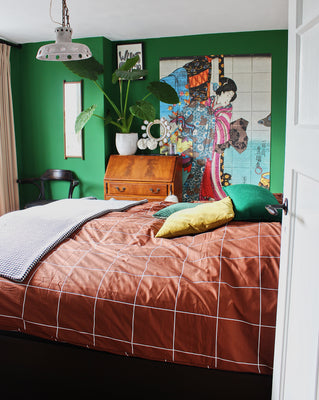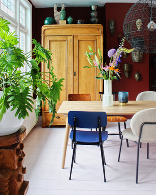 Hoe ontstaat nou zo’n eclectische mix? “We verzamelen veel en houden van kleur. Meestal ontstaat het natuurlijk en lopen we mooie spullen tegen het lijf.” In de woonkamer staat een moderne lichtgrijze bank van het merk Zuiver met een mix van gekleurde sierkussens. Aan de muur pronken kunstwerken, waaronder een aantal uit eigen werk van Sharvin. Deze geven niet alleen een dosis kleur, maar ook een heel persoonlijke touch aan de ruimte. In de eetkamer is de basis strak met een ruime eettafel, waar zowel aan gegeten als gewerkt wordt. De eetkamerstoelen zijn een mix van verschillende ontwerpen, materialen en kleuren. Alles kan én mag in dit huis. “Eigenlijk hebben we best wel dezelfde smaak. Maarten houdt echt van kringlopen en kan daar lekker rondstruinen, Sharvin vindt het leuk om met design en kunst bezig te zijn.”