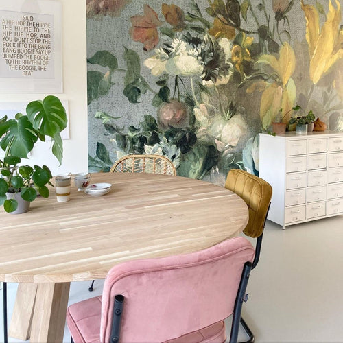 Een rustige Scandi basis met zonnige kleuren wordt opgevuld met unieke eyecatchers, zoals het foto behang met botanische print. Sinds kort is Susanne ook helemaal verliefd op de stalen deur in koperen kleur. “De stalen deur glinstert prachtig als de zon er op schijnt!” aldus Susanne. Merken als Zuiver, HKliving en Bloomingville zijn favoriet, hiervoor heeft Susanne altijd wel een plekje in huis!