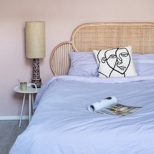 De bank staat dwars in de kamer waardoor je fijn wegkijkt over het centrum van Den Bosch. Ook breekt het de ruimte in meerdere gezellige hoekjes; van coffee corner tot eetkamer. Kim heeft gekozen voor meubelstukken die op pootjes staan, waardoor ze een ruimtelijk effect creert en de woning optimaal benut. Haar slimme indeling maakt dat Kim genoeg ruimte heeft voor sfeervolle woonaccessoires. "Ik vind het belangrijk dat ik blij word van mijn interieur. Een aparte lamp of een lila tafel zorgt ervoor dat ik na een lange dag opgewekt mijn huis binnen stap."