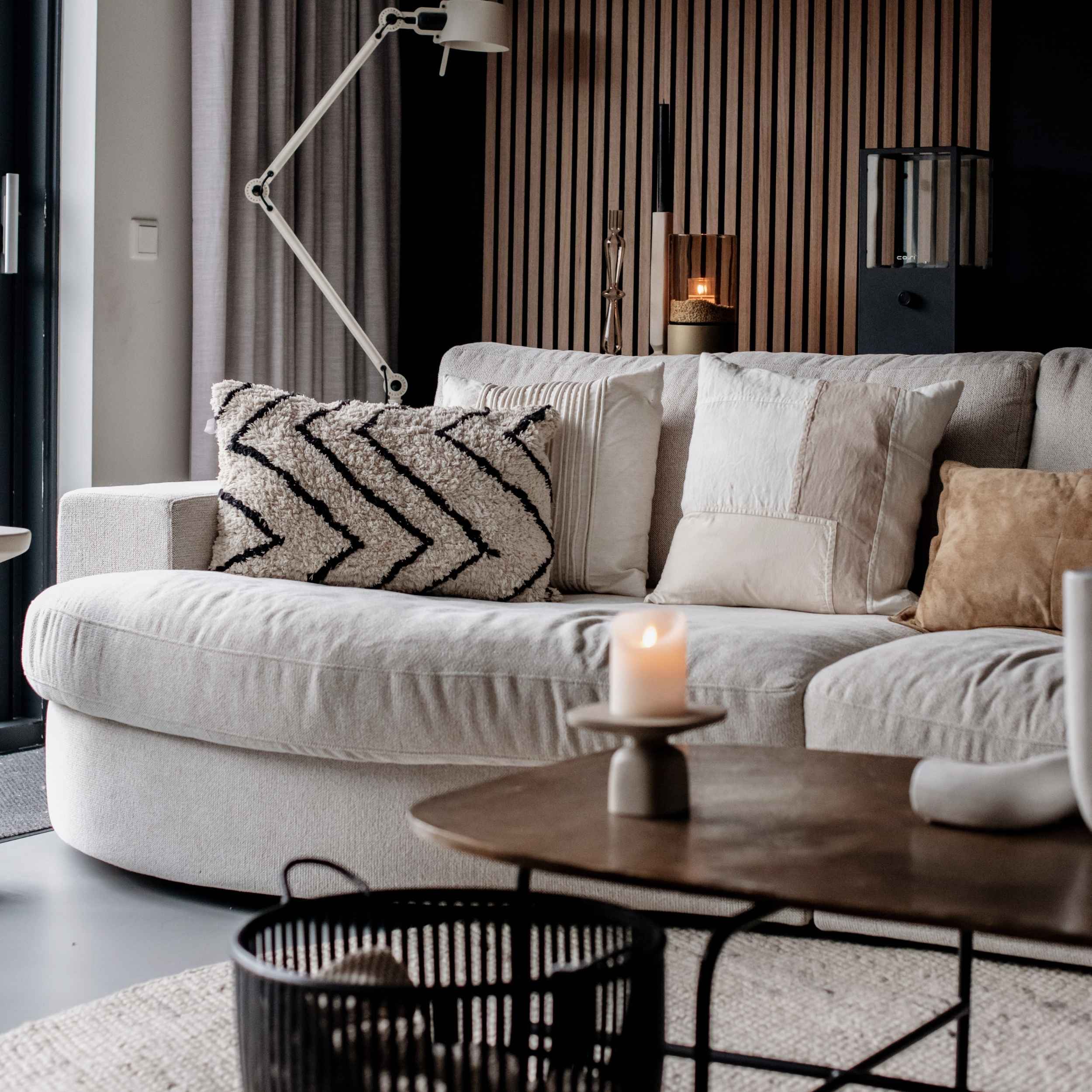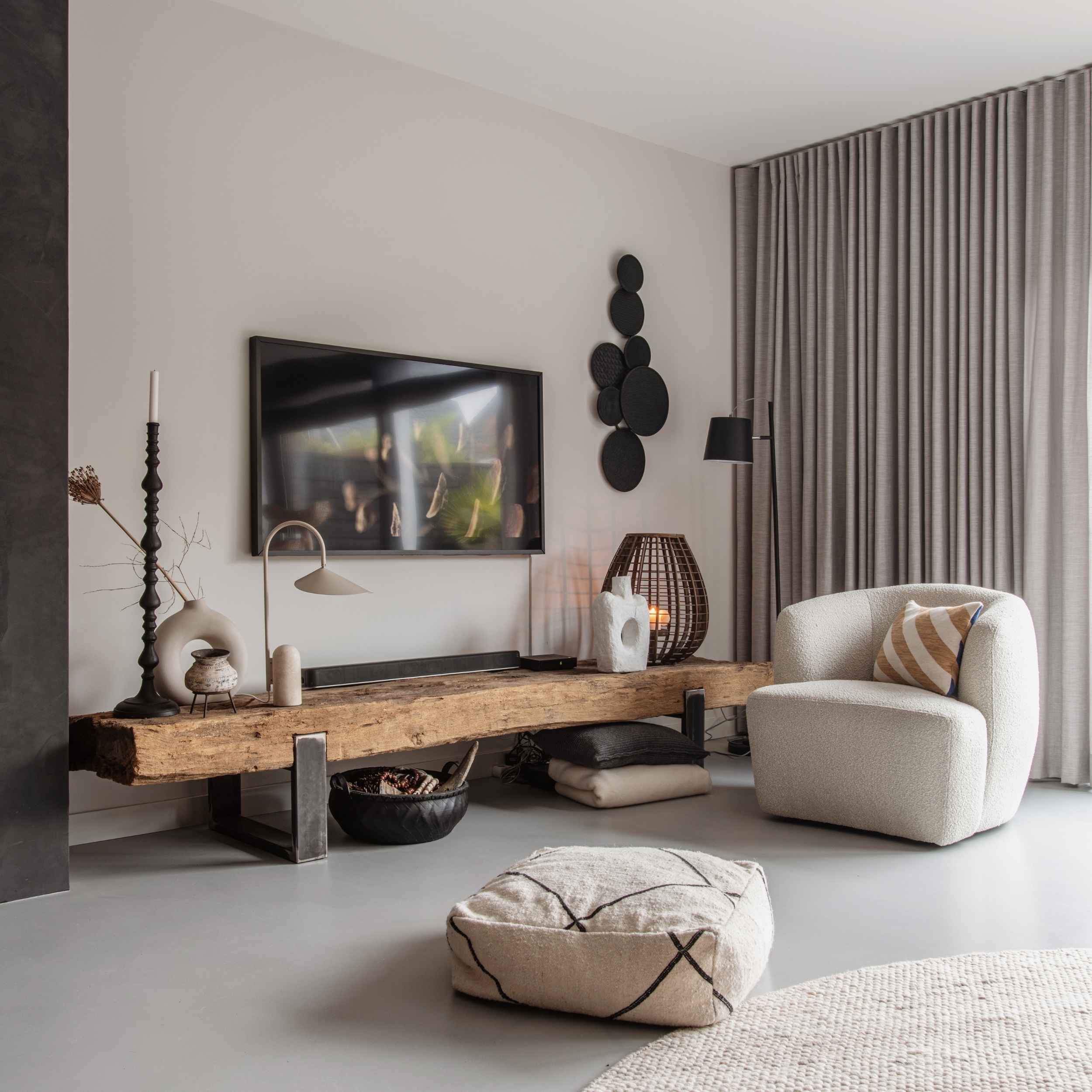 Judith is dol op de natuur en dat zie je terug in haar styling. Doorleefde materialen zoals oud hout vind je daarom ook veel terug in het huis, denk aan een donkere houten TV-meubel en een mooie eettafel van hout. ‘’Na een boswandeling kom ik geregeld thuis met een mooie tak!’’ Deze mooie vondsten worden gecombineerd met zachte stoffen.