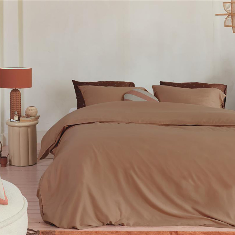 Geef je slaapkamer een retro twist met de Modern Eclectic trend. Kies voor dekbedovertrekken in warme, aardse tinten zoals okergeel, terracotta en diepe rood- en bruintinten. Dessins mogen eclectisch zijn, maar blijven in ton-sur-ton kleuren, zoals geometrische patronen of abstracte prints. Voeg een subtiele gouden accent toe voor een luxe uitstraling. Deze combinatie van rijke kleuren en zachte materialen creëert een uitnodigende, warme sfeer, perfect voor een stijlvol, modern bed.