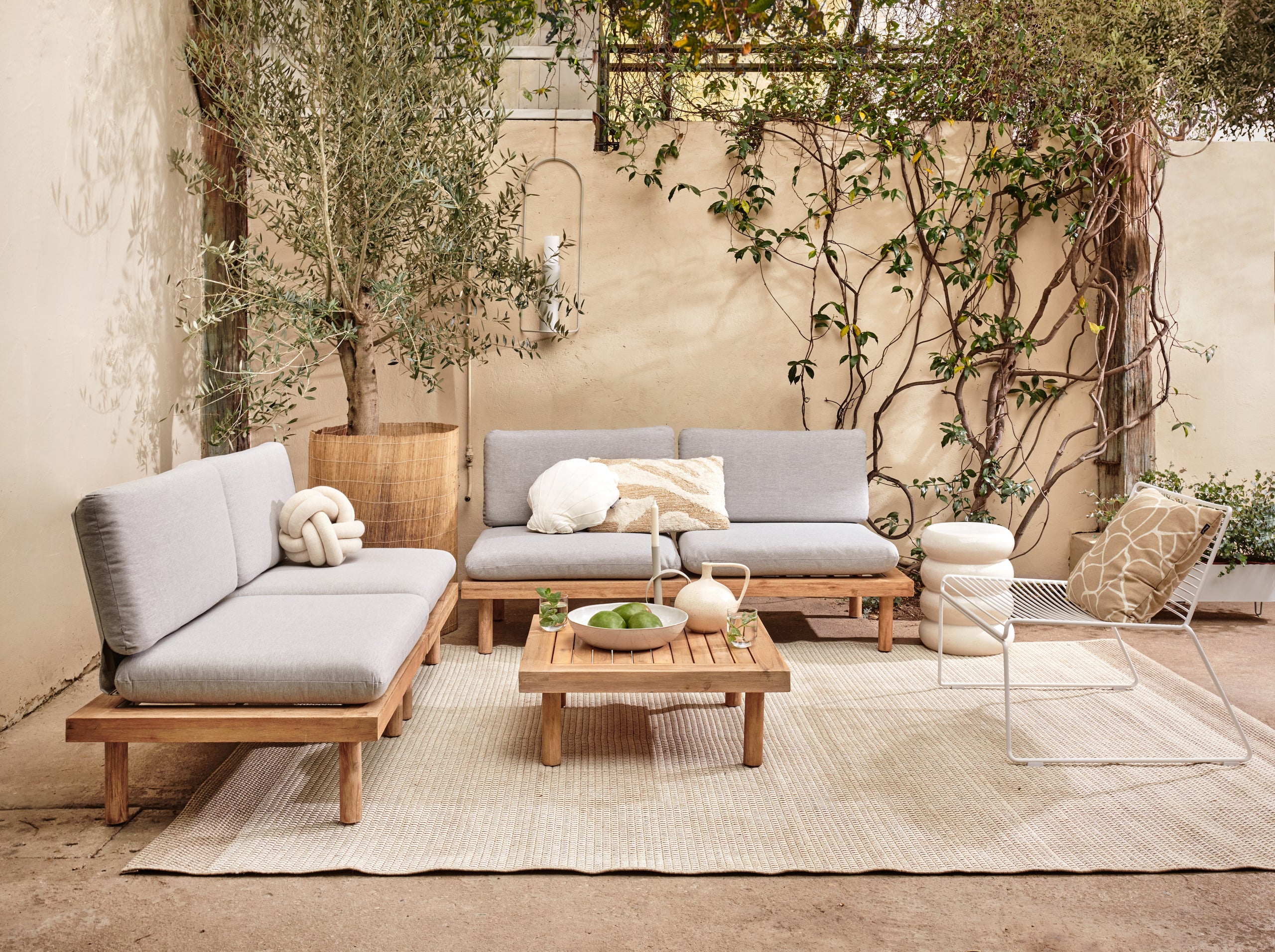 Sluit even je ogen en laat je meenemen door het gevoel van Fresh Summer. Terwijl je de vogels hoort fluiten, schijnt de warme zon op je gezicht en geniet je van een kop koffie uit je favoriete mok. Dit serene gevoel vertalen we door naar een tuinstijl waarbij het creëren van een rustige, comfortabele plek centraal staat. Ga voor neutrale tinten met zachtgrijs en -beige als accentkleuren. Maak een combinatie van natuurlijke materialen die niet alleen rust uitstralen, maar ook het idee van duurzaamheid omarmen. Een mooie loungebank in een neutrale houtkleur past hier perfect en met sfeervolle tuinverlichting maak je jouw oase aan rust helemaal af!