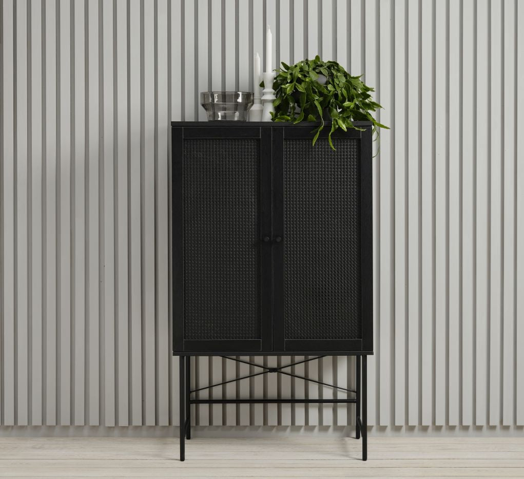 Deze Freeport kast heeft 2 deuren met polyrattan webbing en staat op een zwart metalen onderstel.