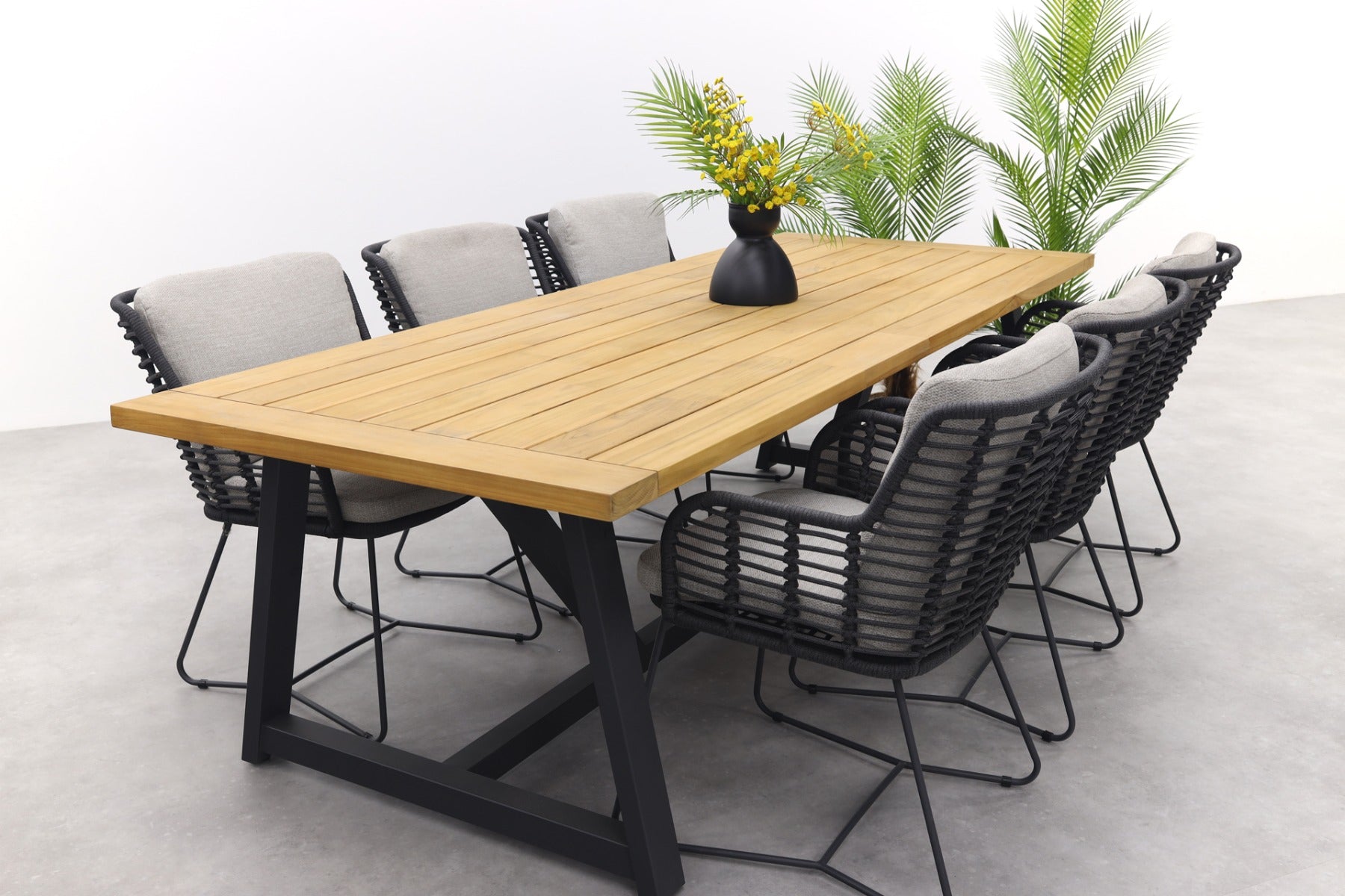 Stijlvolle en moderne tuinset met een stoer randje? Dan mag de 4 Seasons Fabrice/Noah tuinset niet ontbreken in jouw tuin. Geniet van het buitenleven met een gezelschap van 6 personen met de prachtige Noah tuintafel. Door de royale afmetingen is de tafel perfect om stijlvol te borrelen, bbq'en of te dineren. De Noah tuintafel 260x100 cm. is een prachtige combinatie van een unieke vorm RVS frame met een teakhouten tafelblad. Het warme houten tafelblad is gemaakt van losse planken en zorgt voor een warme uitstraling. Niet alleen het frame van de tafel is uniek, maar ook het rope touwpatroon van de Fabrice tuinstoelen. De set zorgt voor een industriële, maar ook luxe uitstraling in jouw tuin. Geniet gezellig met een gezelschap van 6 personen van het buitenleven onder het genot van een drankje. Bestel eenvoudig online! Liever eerst even proefzitten? Kom dan gezellig langs in onze showroom in Opheusden, Duiven of Apeldoorn. Je bent van harte welkom!