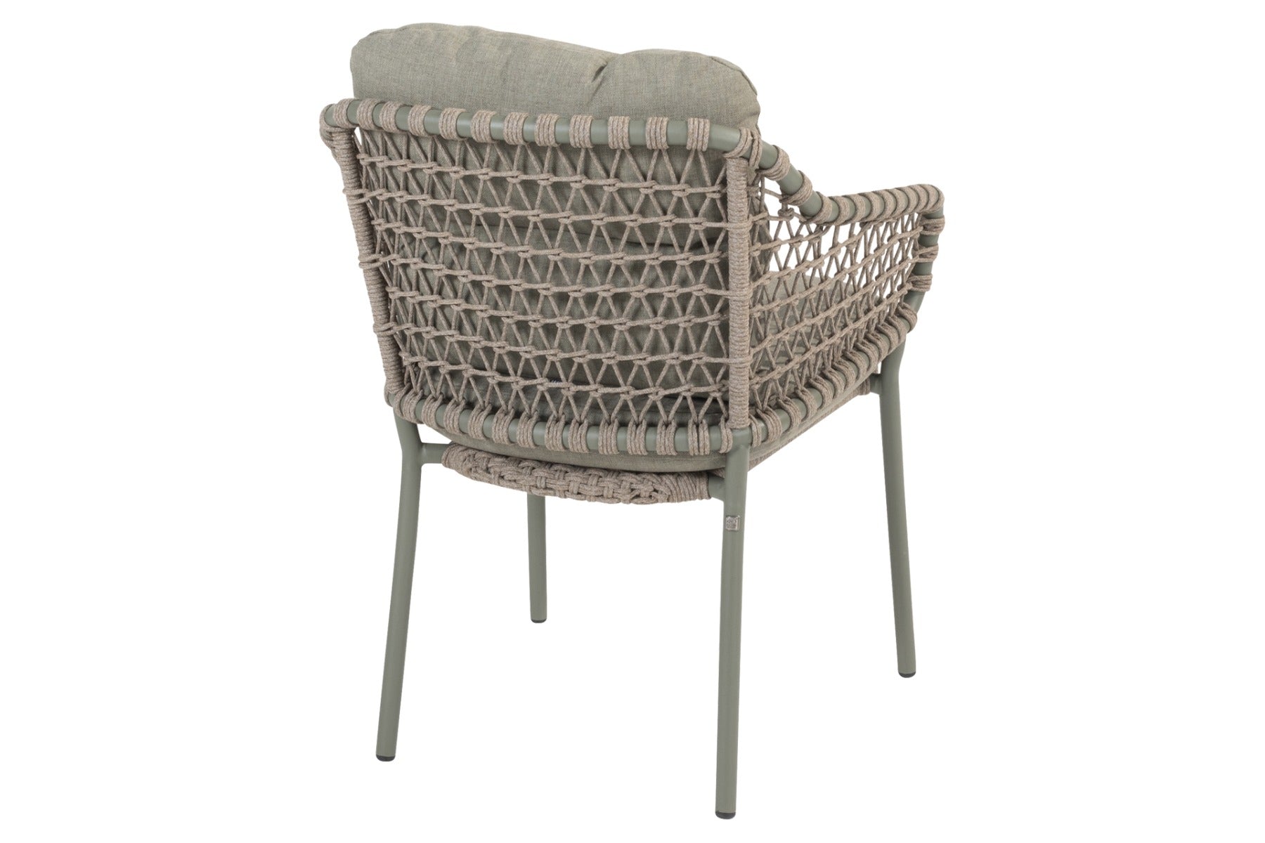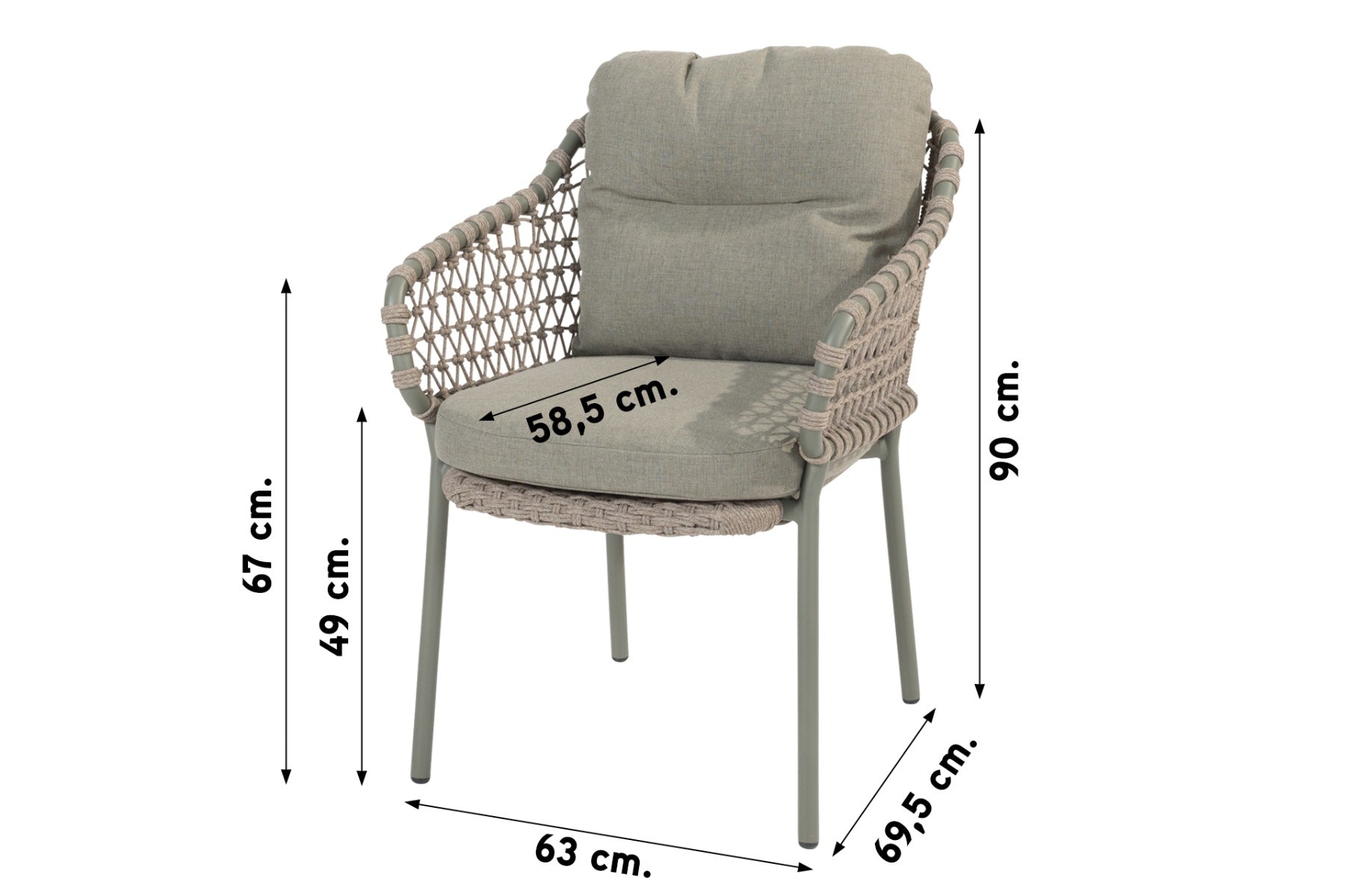 De 4 Seasons Jura tuinstoel heeft een stevig frame van RVS (Roest Vast Staal). Voor extra duurzaamheid is het frame behandeld met een matte coating die bestand is tegen krassen en stoten. Het zitgedeelte van de Jura tuinstoel is vervaardigd uit Rope. Dit materiaal heeft een minimalitische uitstraling en voelt zacht aan, toch is het bepaald geen touw. Rope is namelijk opgebouwd uit een polypropyleen basis met een kunststof kern. Het omhulsel wordt gemaakt van een acryl stof en is zeer waterafstotend, Uv-bestendig en kleurvast. Perfect materiaal om te verwerken in een tuinstoel. Er wordt dan ook maar liefst 5 jaar garantie gegeven op dit materiaal. Met de kussens van de 4 Seasons Jura dining tuinstoel ben je verzekerd van optimaal zitcomfort. De kussens zijn voorzien van een afneembare hoes welke gewassen kan worden op 30 graden. Mocht je de hoes willen wassen dan adviseren wij om dit te doen zonder wasmiddel.