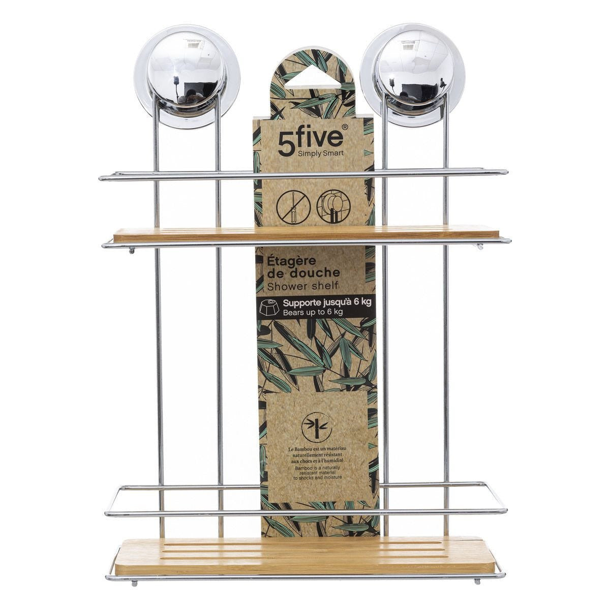 Doucherekje/badkamerrekje 2 lagen metaal/bamboe met zuignappen 25 x 13 x 36 cm. Handig dubbel badkamer rekje voor het opbergen van shampoo en andere douche artikelen. Makkelijk te bevestigen met de zuignappen. Materiaal: verchroomd staal/bamboe.