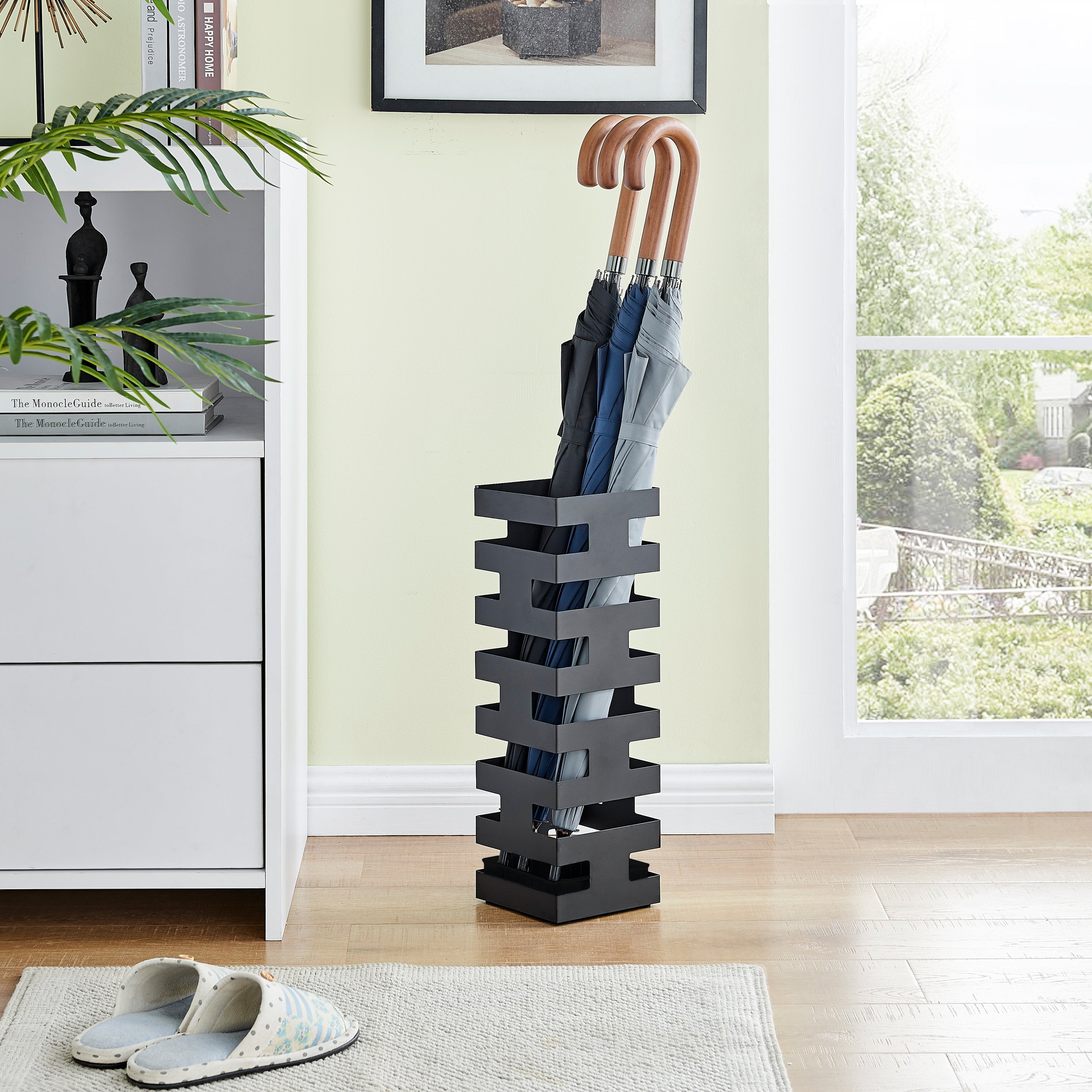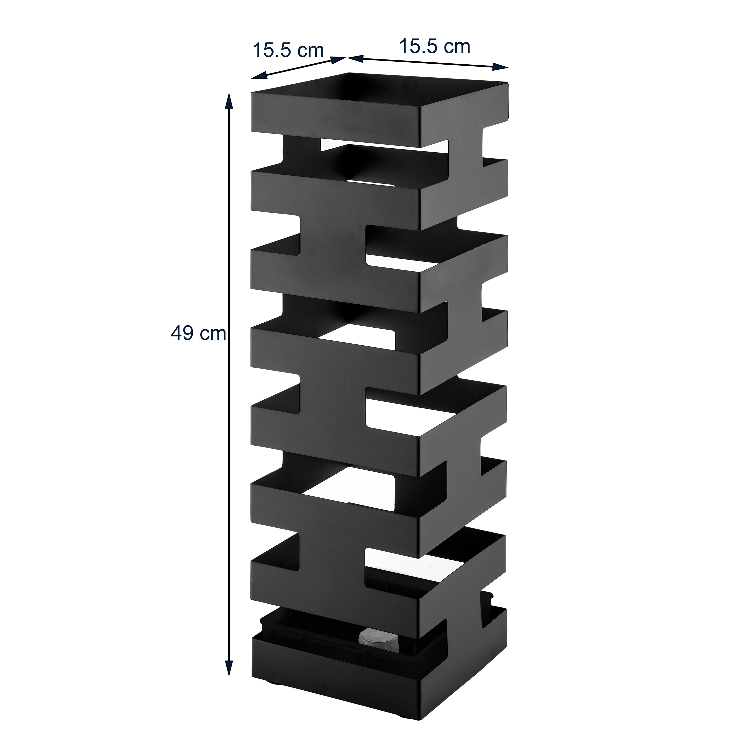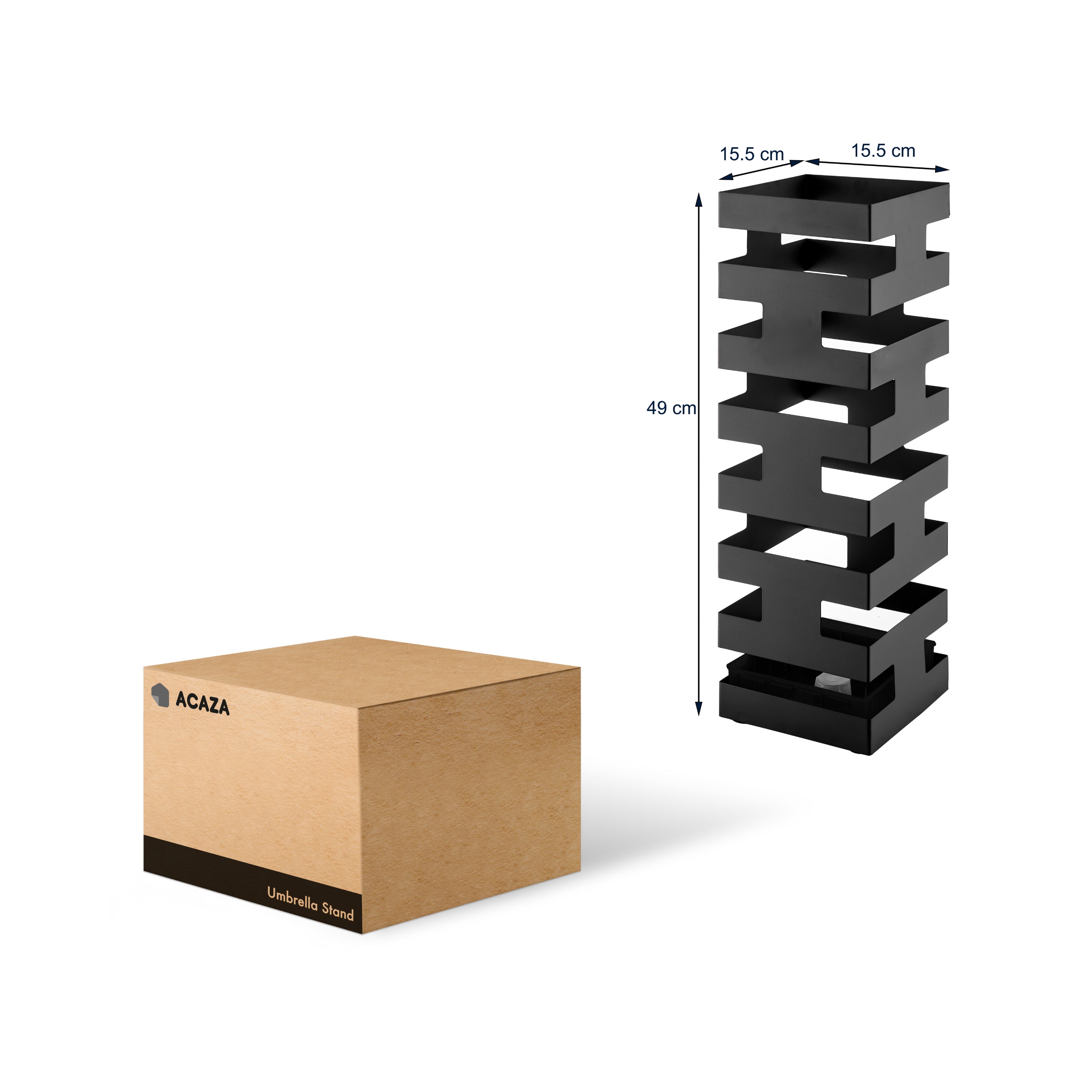 Deze rechthoekige paraplubak combineert gebruiksgemak met een tof design. Door gebruik te maken van een plastic opvangbakje onderaan de paraplubak zal je vloer netjes blijven. Om krassen op de vloer tegen te gaan, werden eveneens 4 beschermingspads onderaan de parapluhouder voorzien. Specificaties: - Merk: ACAZA- Materiaal: Metaal - Afmetingen: 49cm Hoog, 15,5cm Breed en 15,5cm Diep- Gewicht: 1.8 kg - Kleur: zwartLevering: - 1 x paraplubak