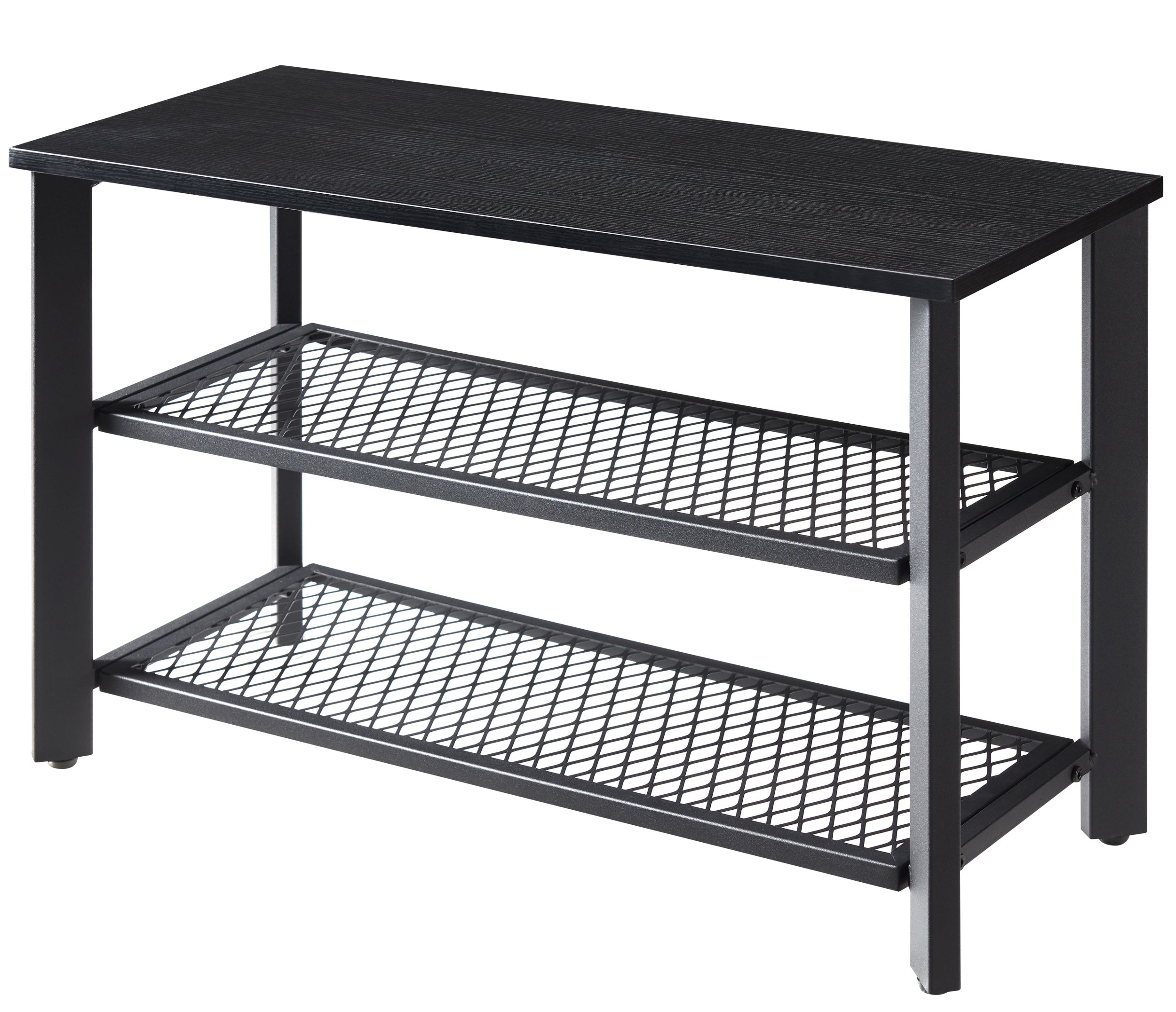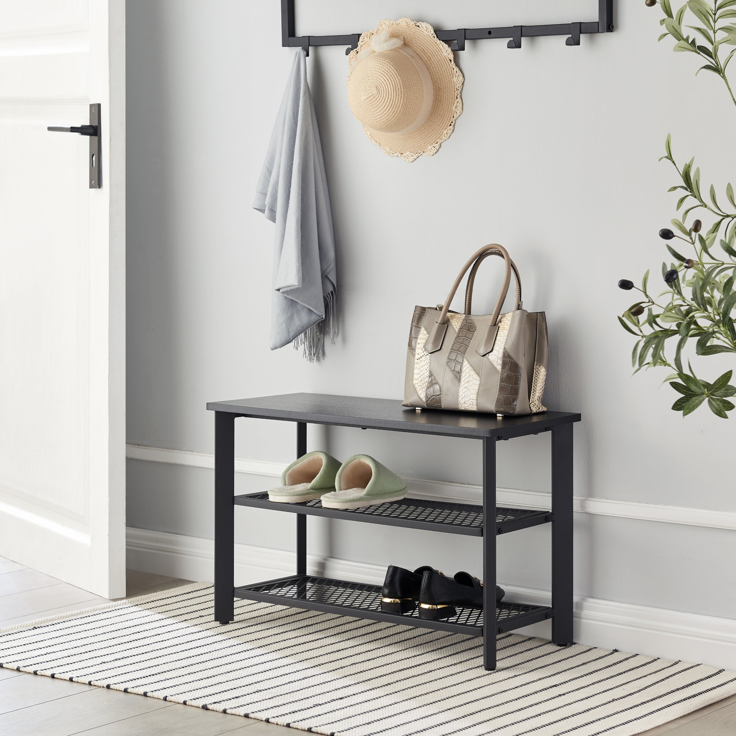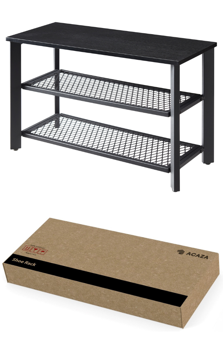 Loopt er ook een sloddervosje bij u thuis rond? Dit elegante schoenenrek van ACAZA is de oplossing!Functioneel en stijlvolDit opbergrek heeft 3 niveaus en neemt weinig ruimte in beslag. Het rekje biedt toch een grote capaciteit om je schoenen op te bergen en aan te trekken. De zwarte kleur van het houten blad en het metalen frame zal een strak moderne toets geven aan uw inkomhal, entree of slaapkamer. HandigDit schoenrek met bankje heeft 4 voetjes die voor een goede stabiliteit zorgen, zelfs op een licht oneffen ondergrond. Ze beschermen de vloer ook tegen krassen. Met een draagvermogen van 90 kg kan je rustig je sneakers of andere schoenen aantrekken.Kenmerken:- Kleur: zwart- Materialen: spaanplaat, ijzeren frame- Afmetingen: 73 cm lengte, 30 cm diepte, 46 cm hoogte- Gewicht: 8 kg- Maximale belasting: 90 kgInhoud van pakket :- 1 x Schoenenrekje- 1 x zak met accessoires- 1 x montagehandleiding