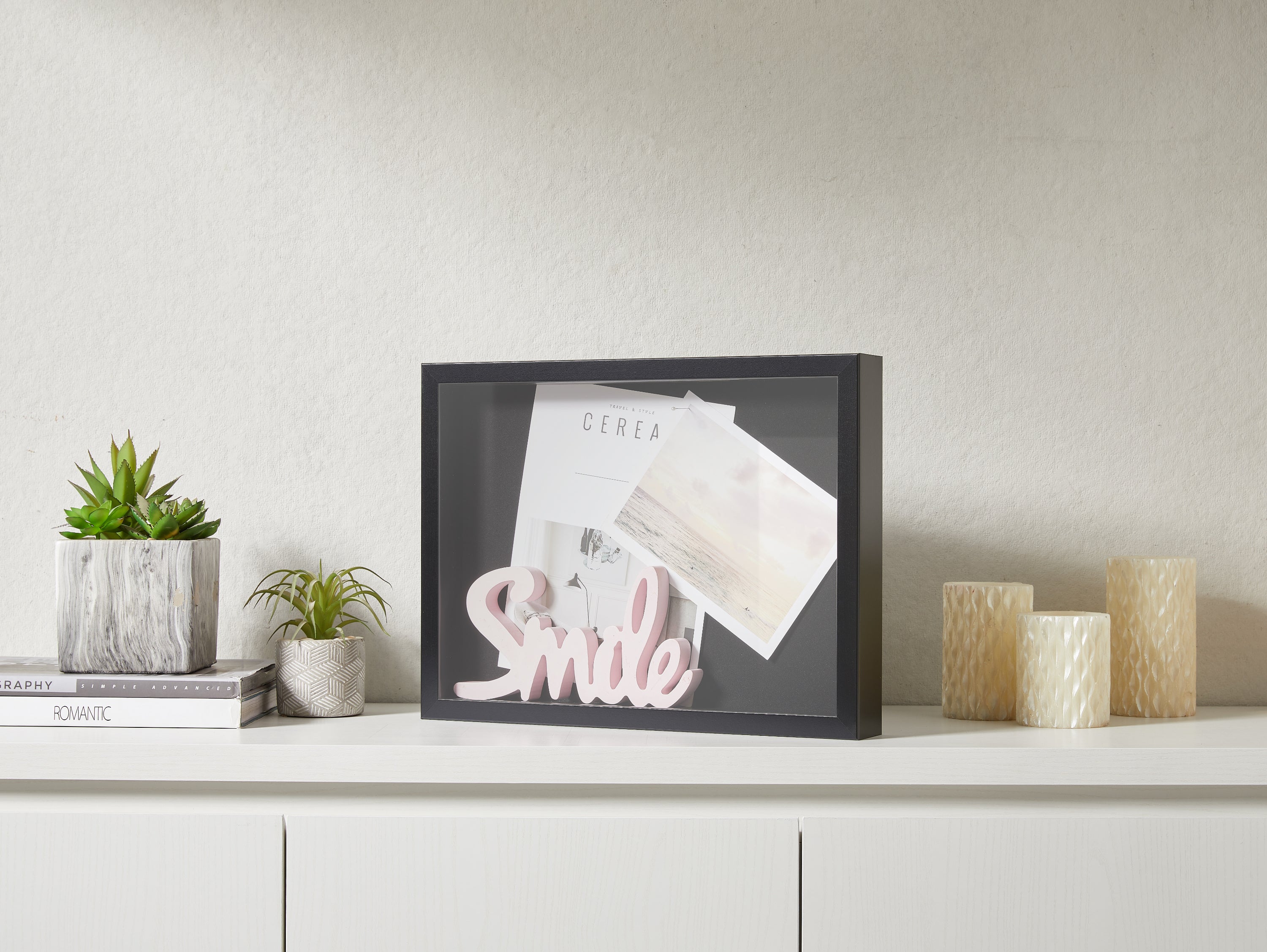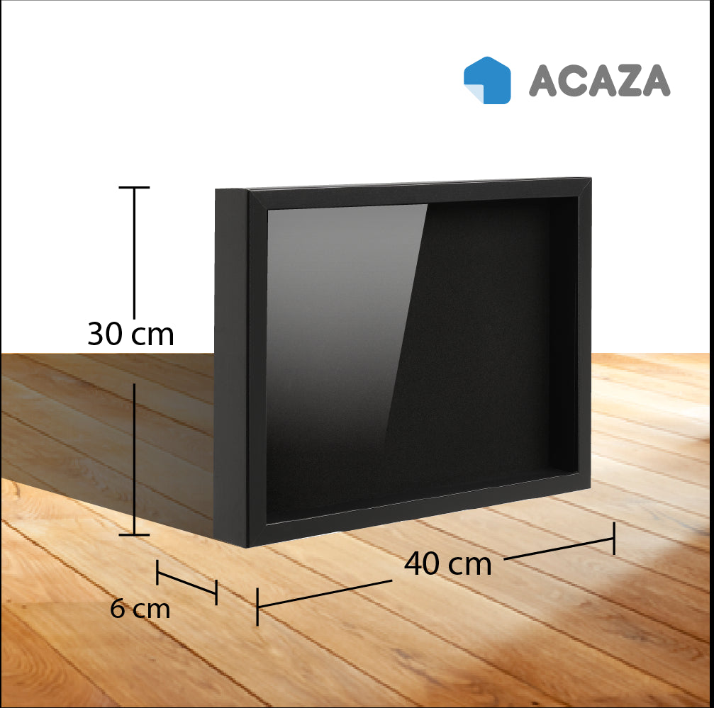 Dankzij deze diepe 3D lijst van ACAZA kan je jouw favoriete objecten inkaderen en een mooi plaatsje aan de muur geven. Met een diepte van 3.5 cm geeft deze fotolijst verschillende opties om objecten en herinneringen in tentoon te spreiden, zoals bijvoorbeeld een bruidsboeket, een rompertje van een baby, medailles, opgezette diertjes, een knutselwerkje,... De achterkant waarop je jouw objecten kan bevestigen is gemaakt van verhard schuim waarop een zwarte vilten laag is bevestigd. Op die manier kan je met prikkers jouw objecten vastpinnen in de lijst.De fotolijst is aan de achterkant voorzien van hangers waarmee je ze zowel horizontaal als verticaal tegen de muur kan bevestigen.Een echt hebbeding voor de creatieveling!Eigenschappen:Merk : ACAZAMateriaal: frame in MDF hout, plexiglas, metalen bevestigingsclipsKleur: ZwartAfmetingen: 30x40 cmDiepte buitenmaat: 6cmDiepte binnenmaat 3,5 cmLevering:1 x fotolijst5x prikbord pinnen om jouw objecten te bevestigen in de fotolijst