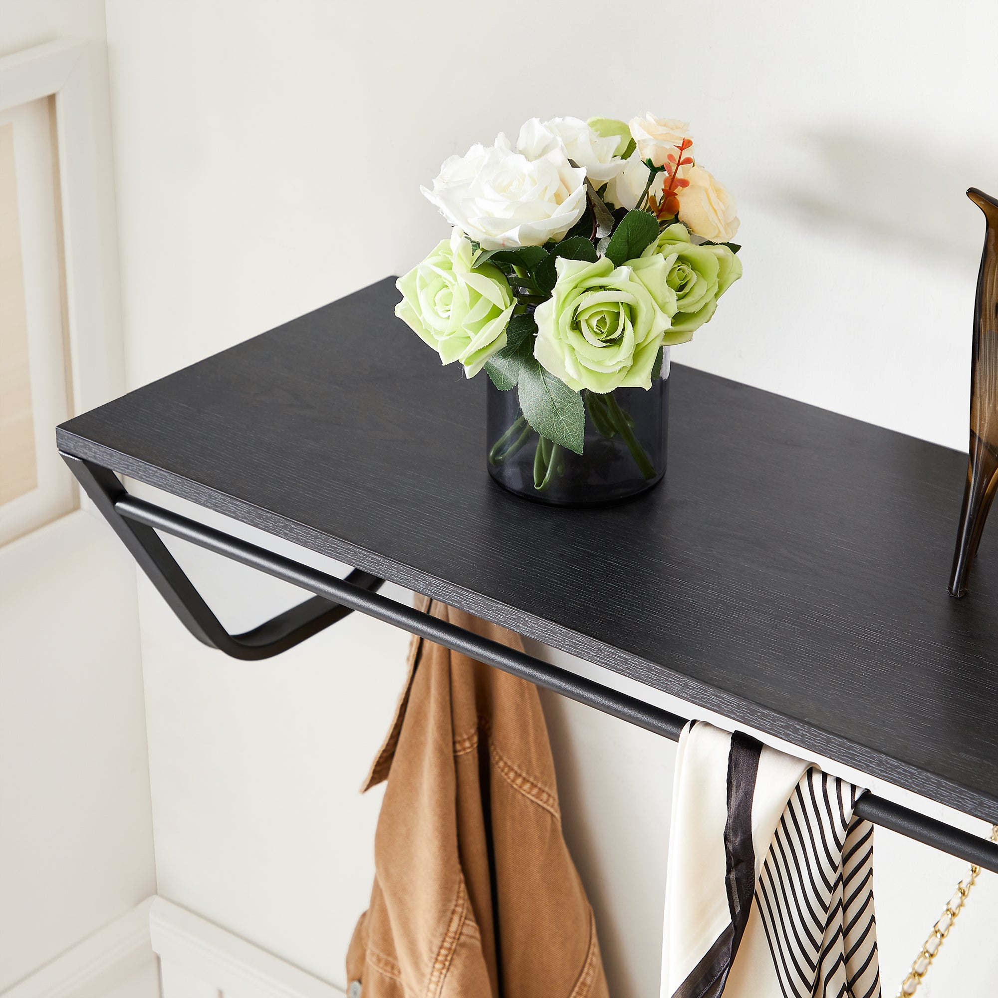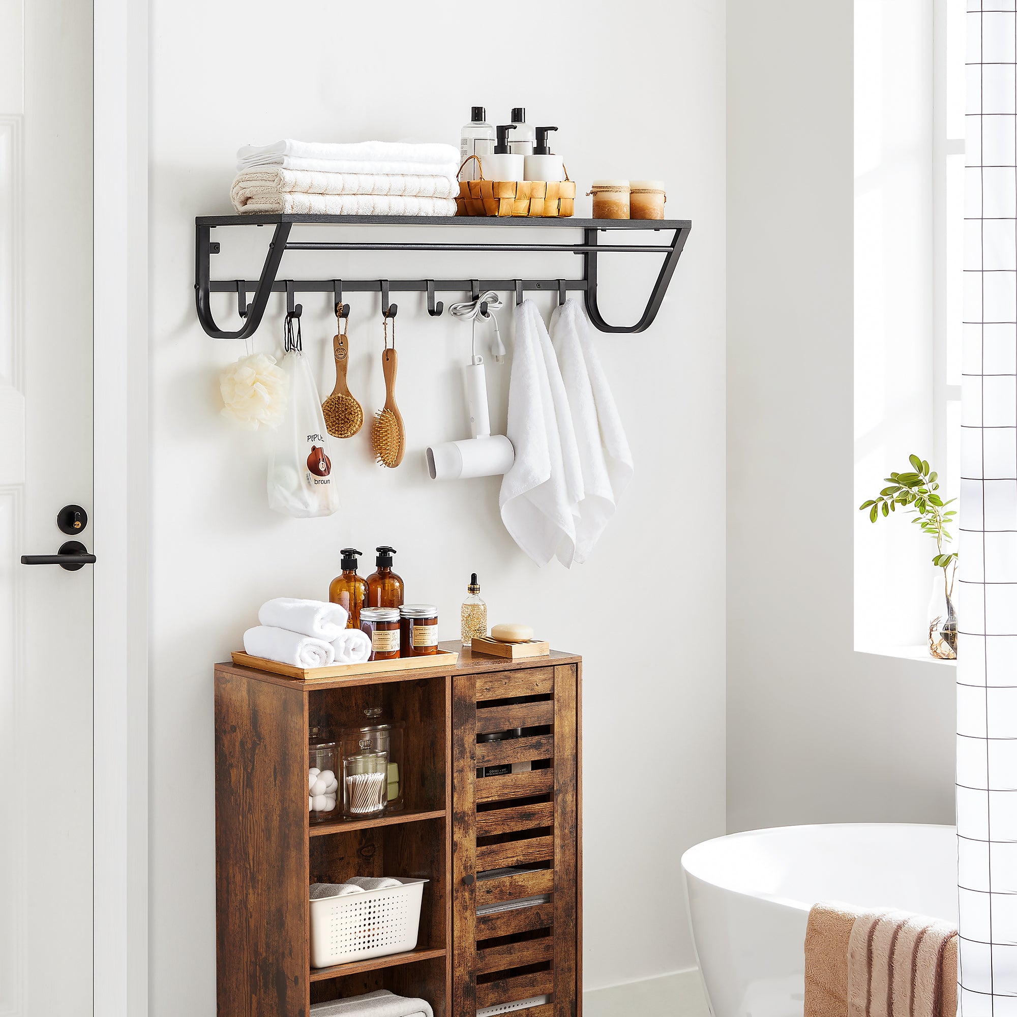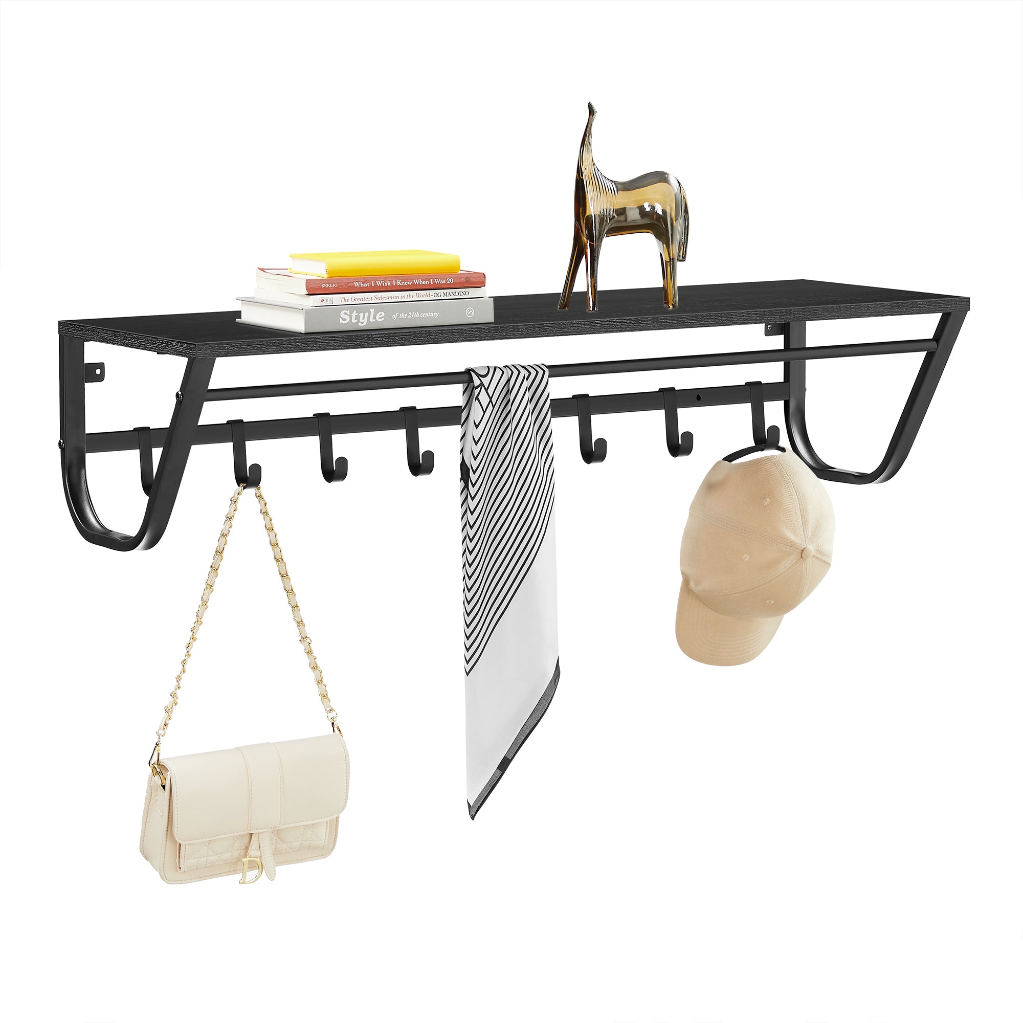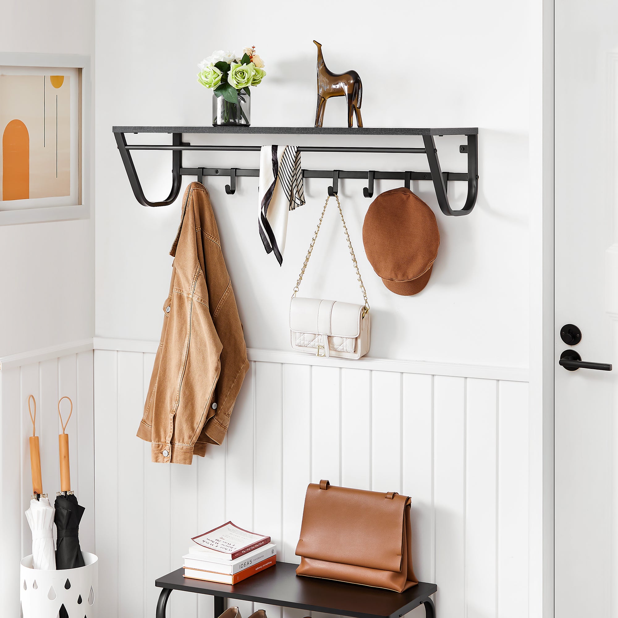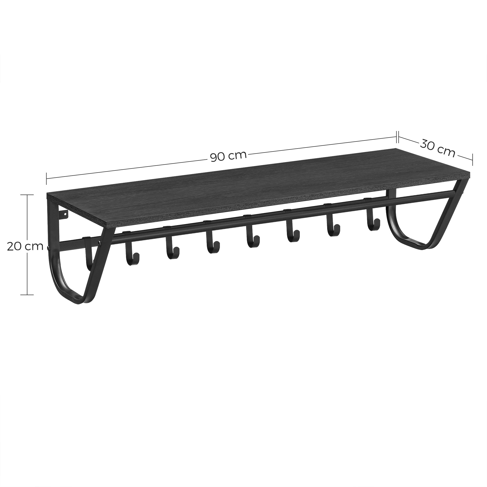 Deze kapstok combineert verschillende ophang- en opbergmogelijkheden met een plank, een rail en meerdere haken. De kapstok is 90 cm Lang. De zwarte uitvoering van deze kapstok geeft deze een strak karakter waardoor ze een echte eyecatcher zal zijn in uw hal, badkamer of woonkamer.Specificaties:- Kleur: zwart- Materiaal: Metaal, MDF- Afmetingen: 90 cm lang, 20 cm hoog en 30 cm diep