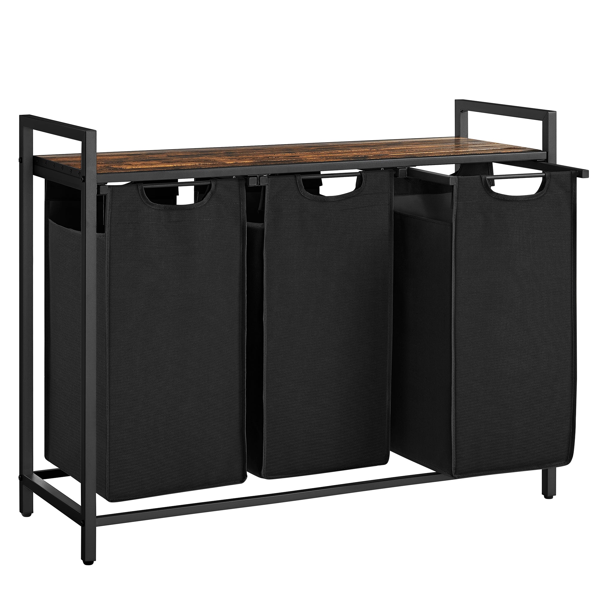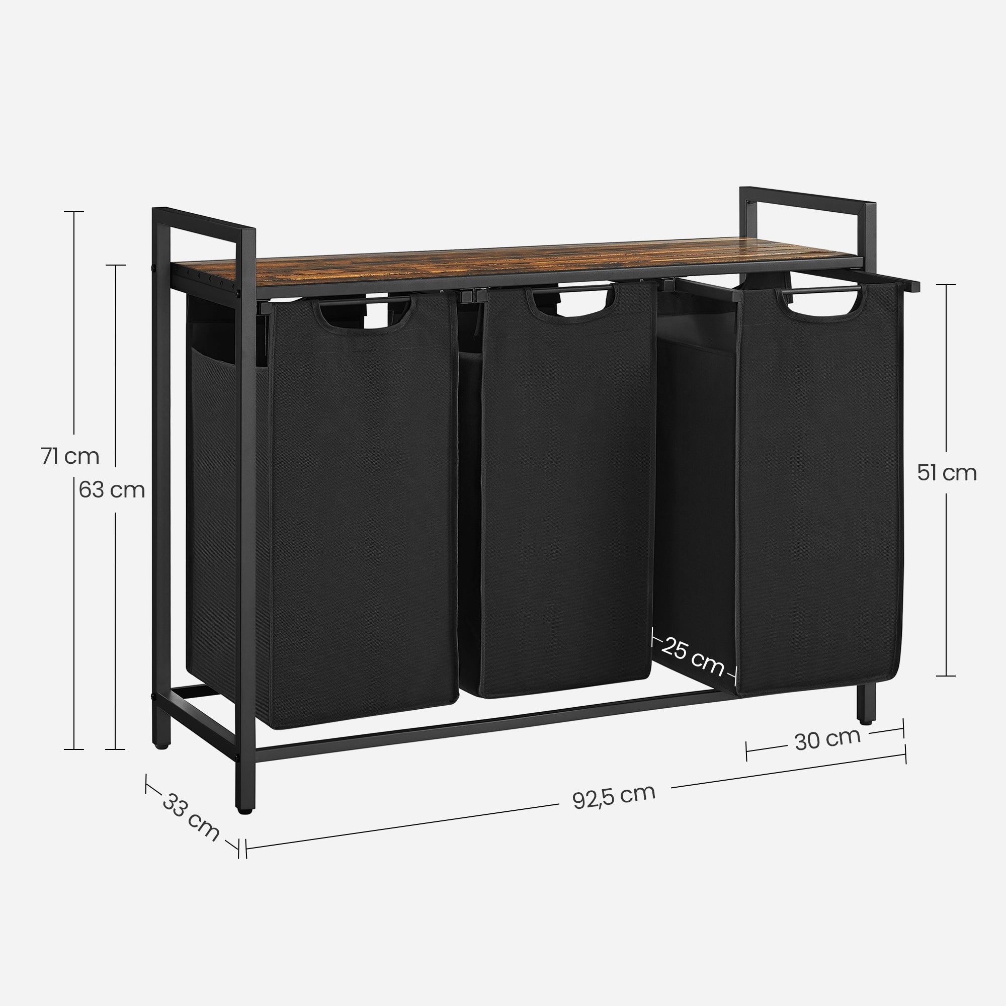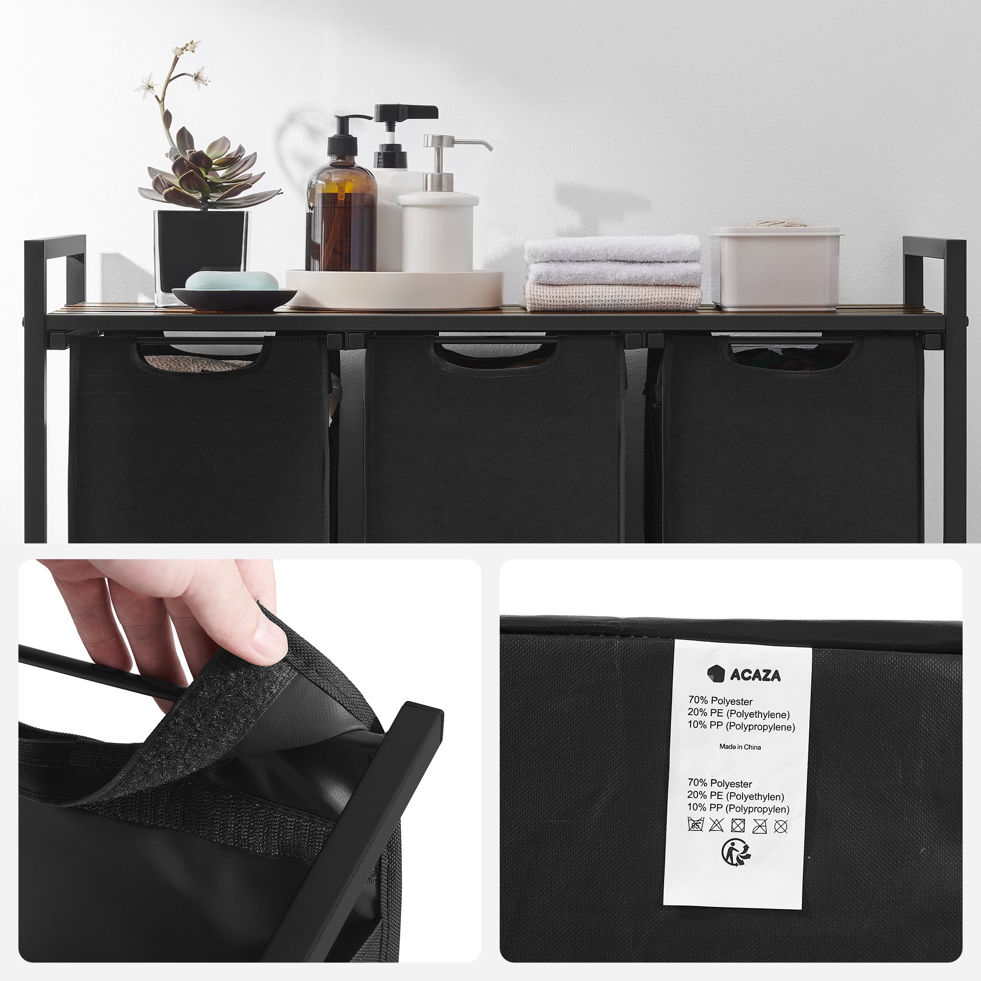 Sorteer je wasgoed met de drie stoffen zakken en plaats de wasmiddelen en wasverzachters op de plank. Al je opbergbehoeften voor een luchtige wasdag worden verwelkomd door deze wasmand,Trek de tassen van Oxford-stof eruit, open de klittenbandsluitingen, verwijder de waszakken en draag ze gemakkelijk naar de wasmachine - de was doen kan zo eenvoudig zijn met deze wassorteerder.Deze wassorteerder gemaakt met een robuust stalen frame en MDF-panelen biedt sterke ondersteuning. De verstelbare voeten en anti-tip kits dragen bij aan de stabiliteit.Je hoeft je hersenen niet te pijnigen om erachter te komen hoe je elk onderdeel moet verbinden. De geïllustreerde instructies en duidelijk gelabelde onderdelen helpen je om de montage gemakkelijk te voltooien.Een veelzijdige dagelijkse hulp: deze wasmand met 3 containers en 1 plank past goed in de wasruimte, badkamer of slaapkamer en helpt je de chaos verborgen en vaak gebruikte items gemakkelijk toegankelijk te houden.Product specificaties:- Kleur: Rustiek Bruin, Zwart- Materiaal: MDF (Medium Density Fiberboard), metaal, Oxford-stof- Productafmetingen: 92,5 x 33 x 71 cm- Afmeting per tas: 25 x 30 x 51 cm (L x B x H)- Productgewicht: 8 kg