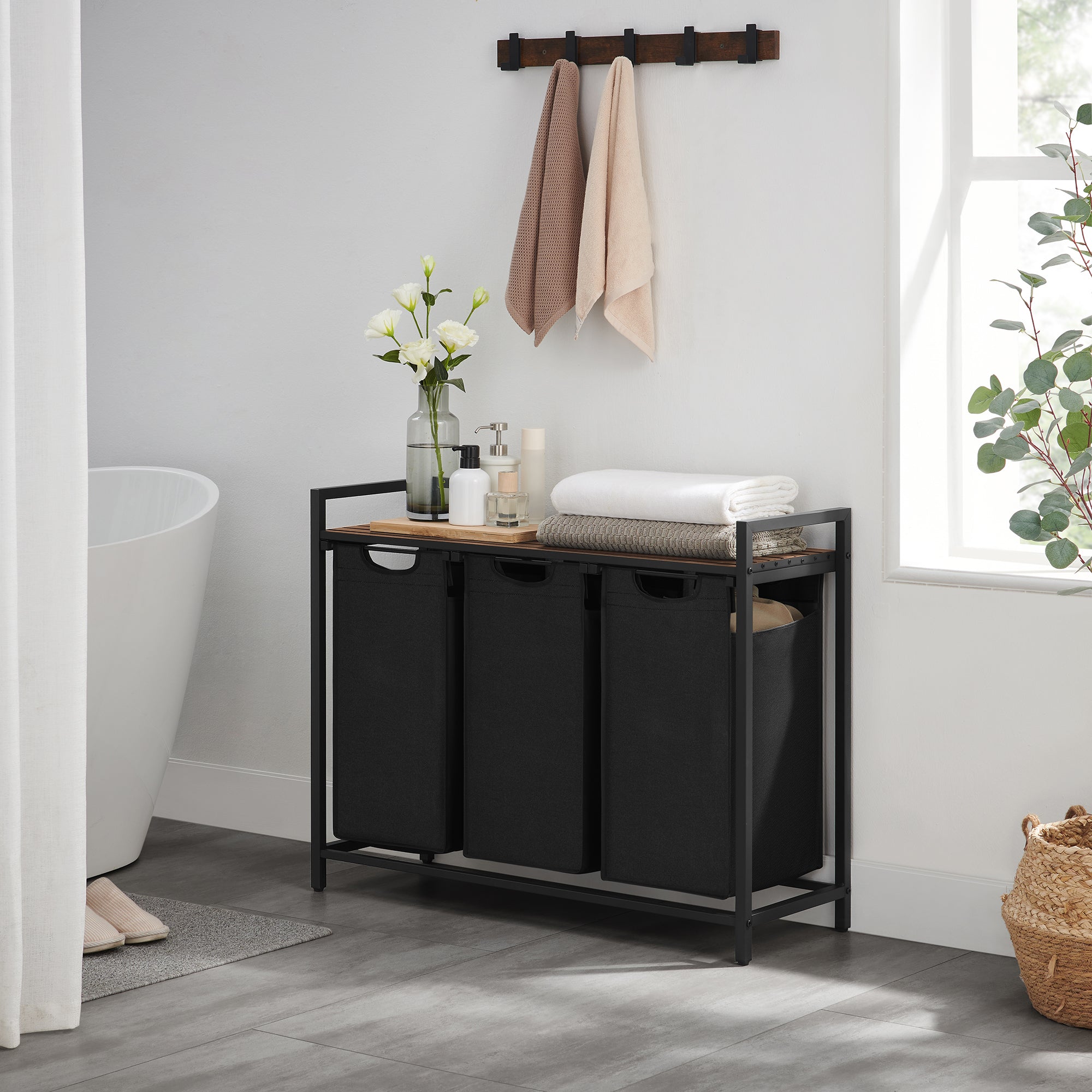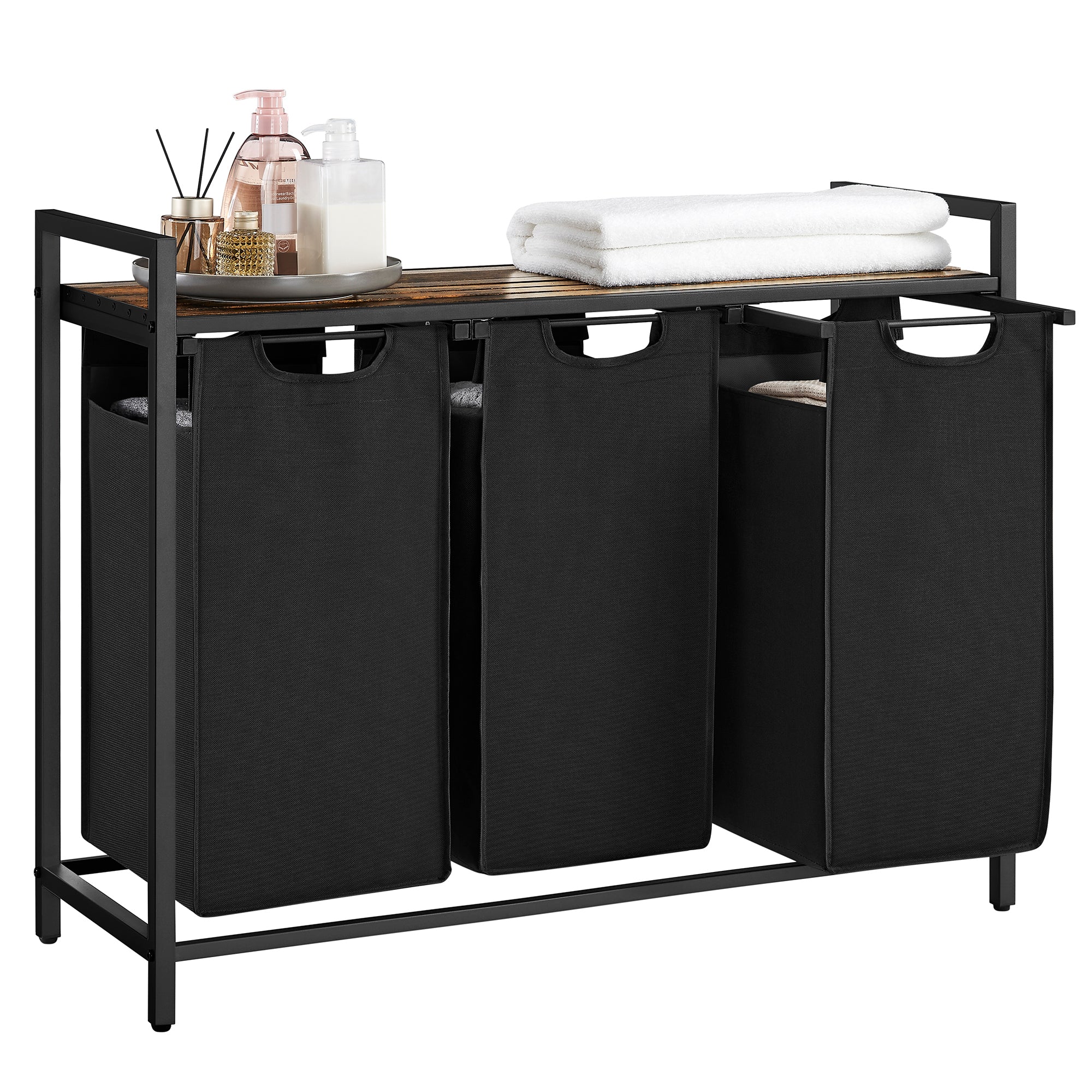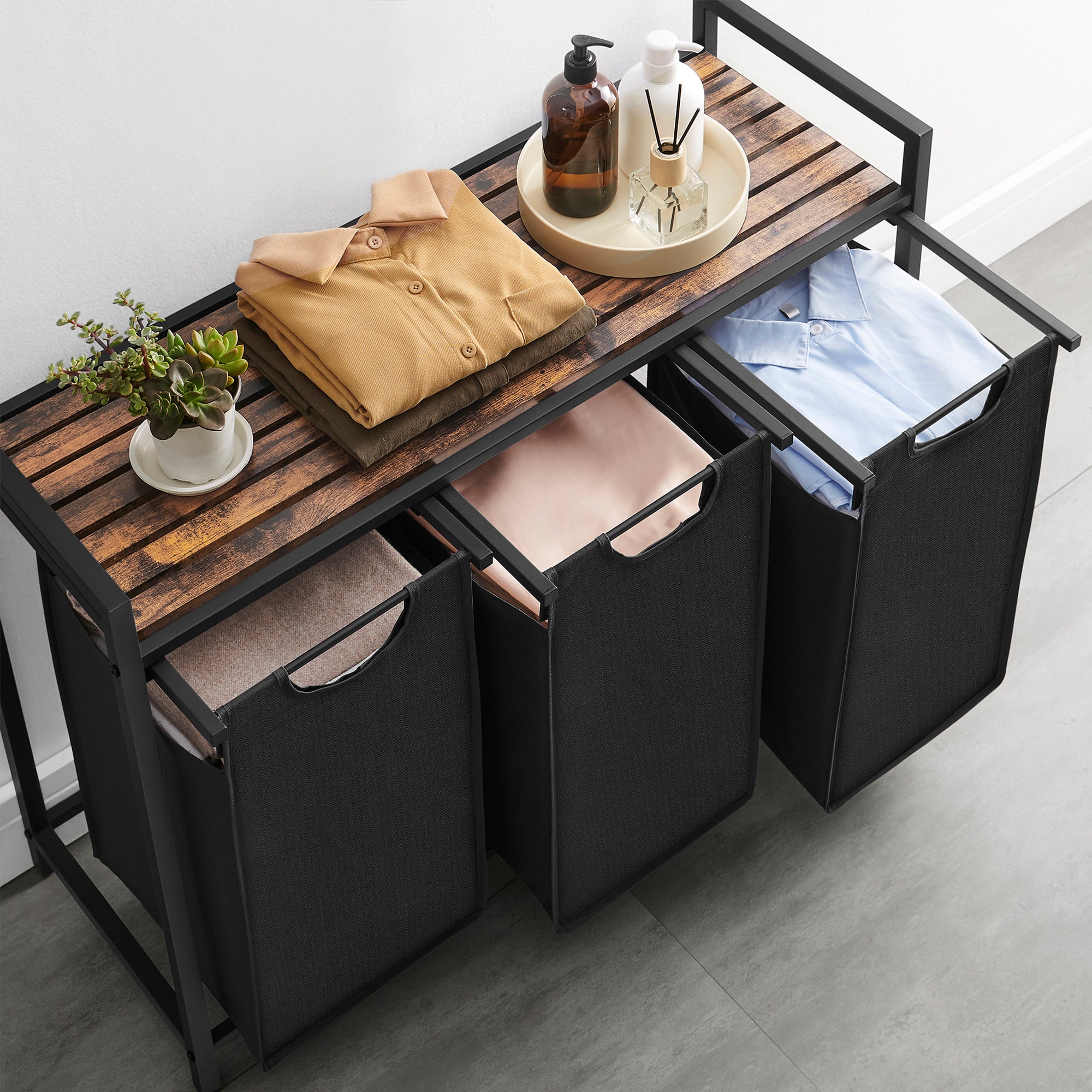 Sorteer je wasgoed met de drie stoffen zakken en plaats de wasmiddelen en wasverzachters op de plank. Al je opbergbehoeften voor een luchtige wasdag worden verwelkomd door deze wasmand,Trek de tassen van Oxford-stof eruit, open de klittenbandsluitingen, verwijder de waszakken en draag ze gemakkelijk naar de wasmachine - de was doen kan zo eenvoudig zijn met deze wassorteerder.Deze wassorteerder gemaakt met een robuust stalen frame en MDF-panelen biedt sterke ondersteuning. De verstelbare voeten en anti-tip kits dragen bij aan de stabiliteit.Je hoeft je hersenen niet te pijnigen om erachter te komen hoe je elk onderdeel moet verbinden. De geïllustreerde instructies en duidelijk gelabelde onderdelen helpen je om de montage gemakkelijk te voltooien.Een veelzijdige dagelijkse hulp: deze wasmand met 3 containers en 1 plank past goed in de wasruimte, badkamer of slaapkamer en helpt je de chaos verborgen en vaak gebruikte items gemakkelijk toegankelijk te houden.Product specificaties:- Kleur: Rustiek Bruin, Zwart- Materiaal: MDF (Medium Density Fiberboard), metaal, Oxford-stof- Productafmetingen: 92,5 x 33 x 71 cm- Afmeting per tas: 25 x 30 x 51 cm (L x B x H)- Productgewicht: 8 kg