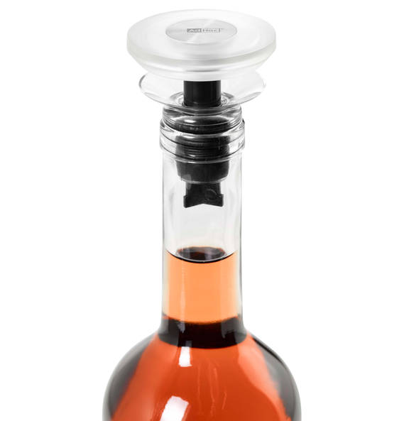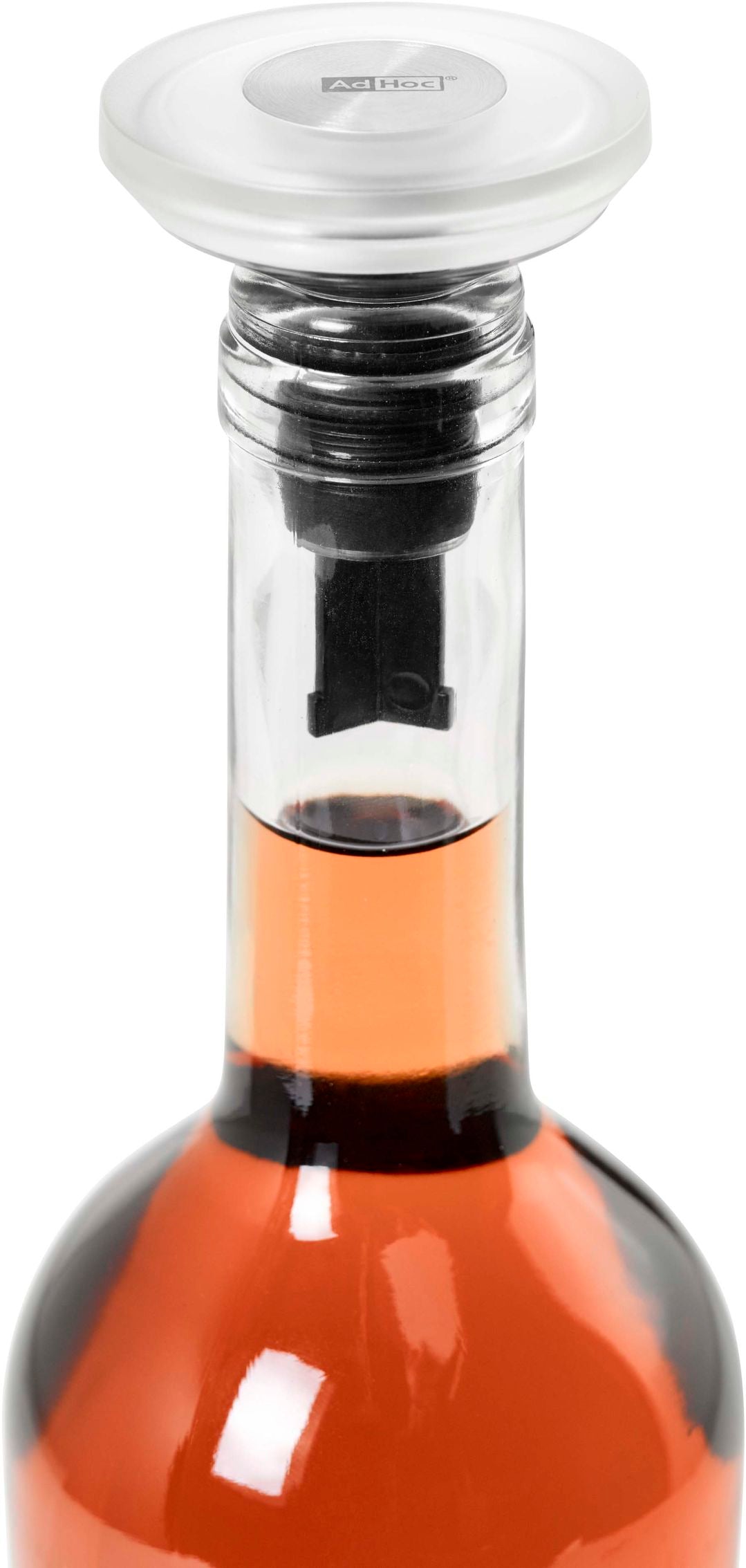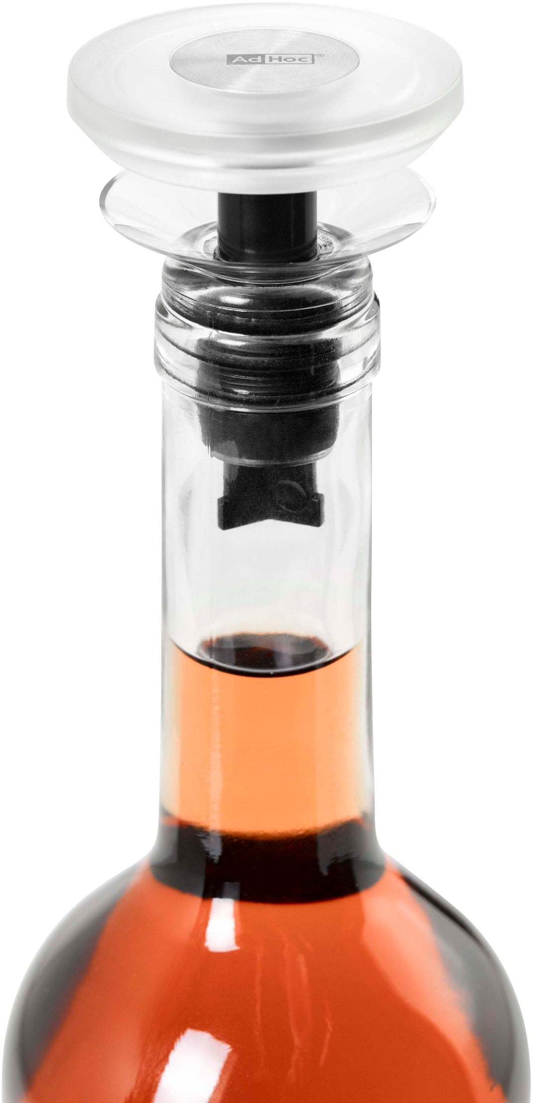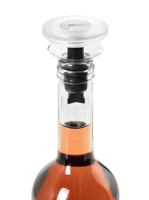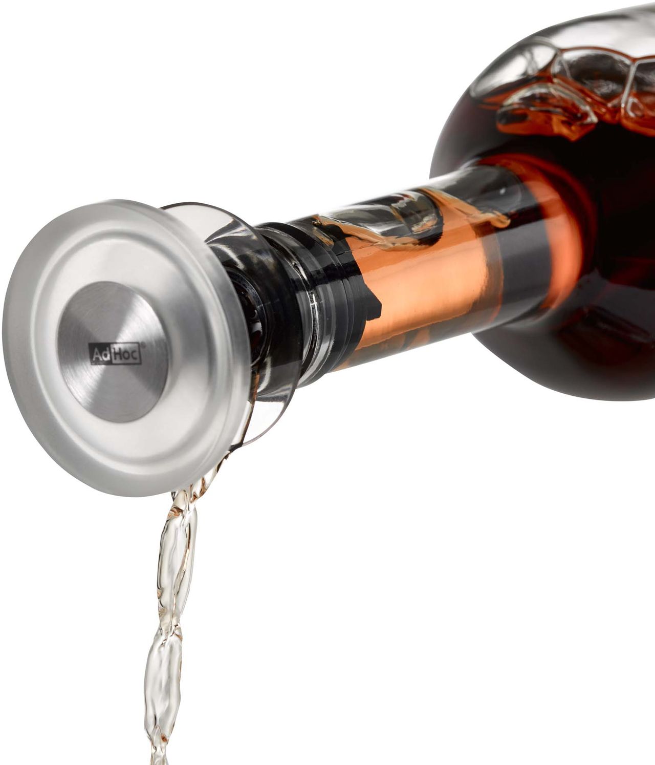 Mooi vormgegeven wijn flessenstop van het merk AdHoc. Gemaakt van RVS, kunststof en siliconen. De siliconen stopper maakt de fles luchtdicht, en heeft een plat design wat het ideaal maakt om de fles in de koelkast te kunnen zetten. Tevens bevat de flessenstop ook een schenktuit voor het gelijkmatig en zonder druppen inschenken van wijn. De flessenstop is niet geschikt voor in de vaatwasser.