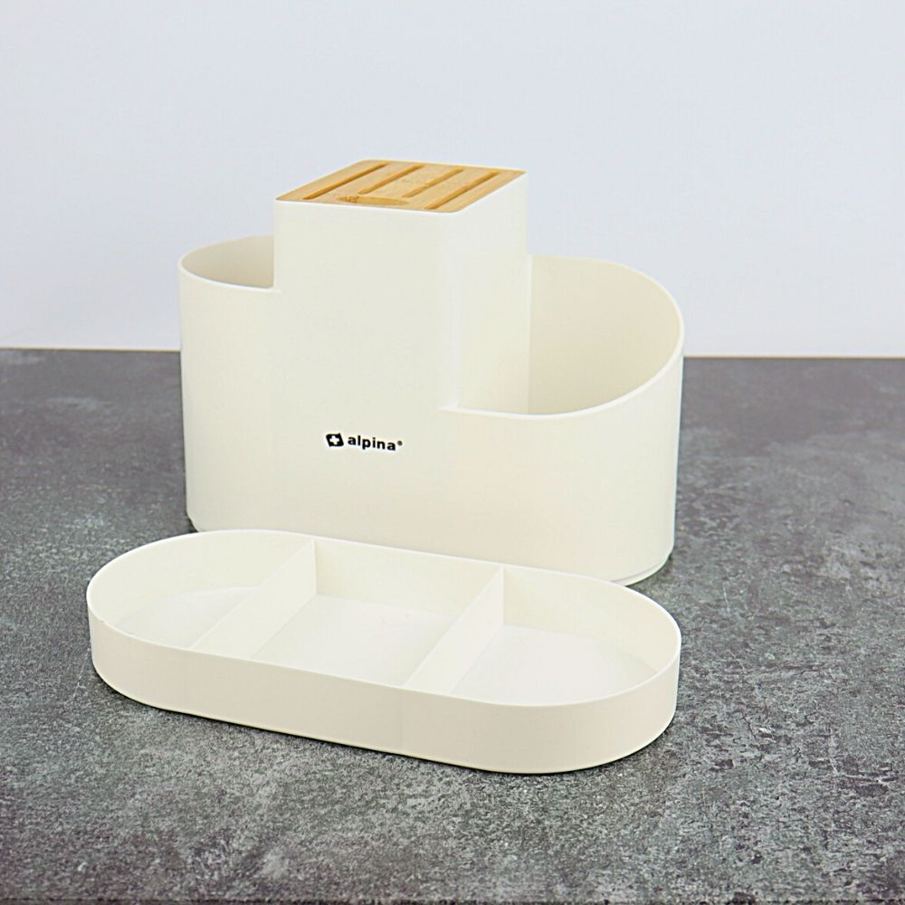 Deze Alpina houder voor keukengerei past door het tijdloze ontwerp in elke keuken. De houder bestaat uit een messenblok en twee spatelhouders. Deze keuken organizer is gemaakt van kunststof en heeft een bamboe detail. Kunststof is gemakkelijk schoon te maken, waardoor de houder lang netjes blijft. De onderkant van de houder is te verwijderen. Dit bakje vangt water op van nat gerei. Door het bakje los te maken van de onderkant is deze eenvoudig weer te legen.