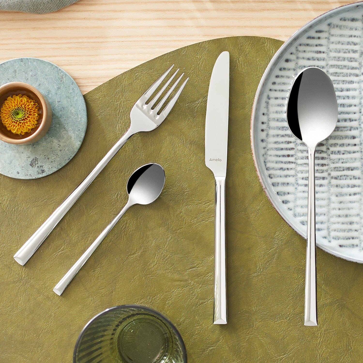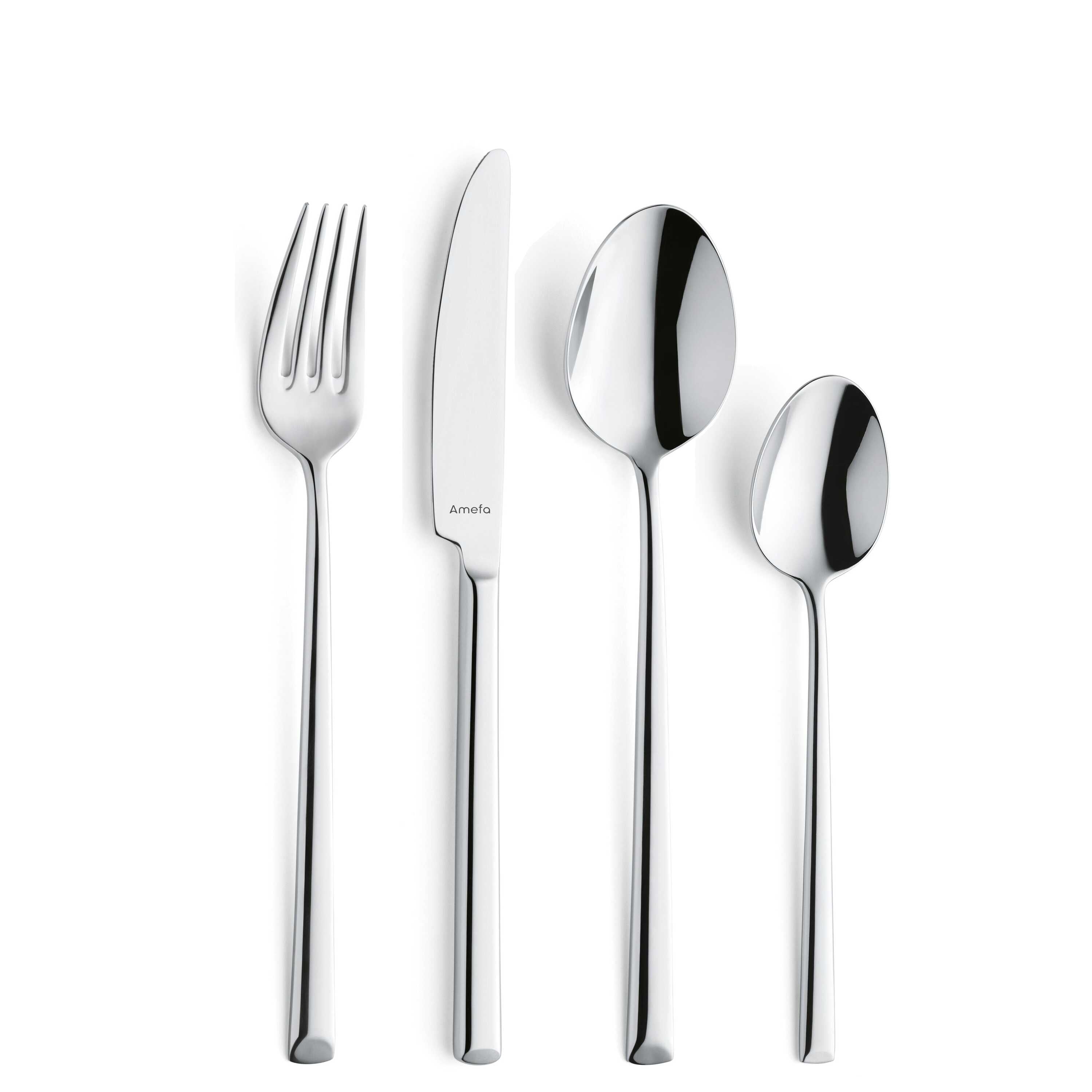 Deze bestekset Metropole van het merk Amefa is van hoogwaardige kwaliteit met lange, slanke lijnen en een aan de onderzijde schuin aflopend heft design. Het design is gebaseerd op de hedendaagse stadsarchitectuur en heeft een luxe en moderne uitstraling. Deze set past perfect bij een moderne tafelschikking. Het bestek is gemaakt van 18/10 roestvrij staal en heeft een hoogglans afwerking. Bovendien is het vaatwasmachinebestendig en daarom zeer gemakkelijk te onderhouden.