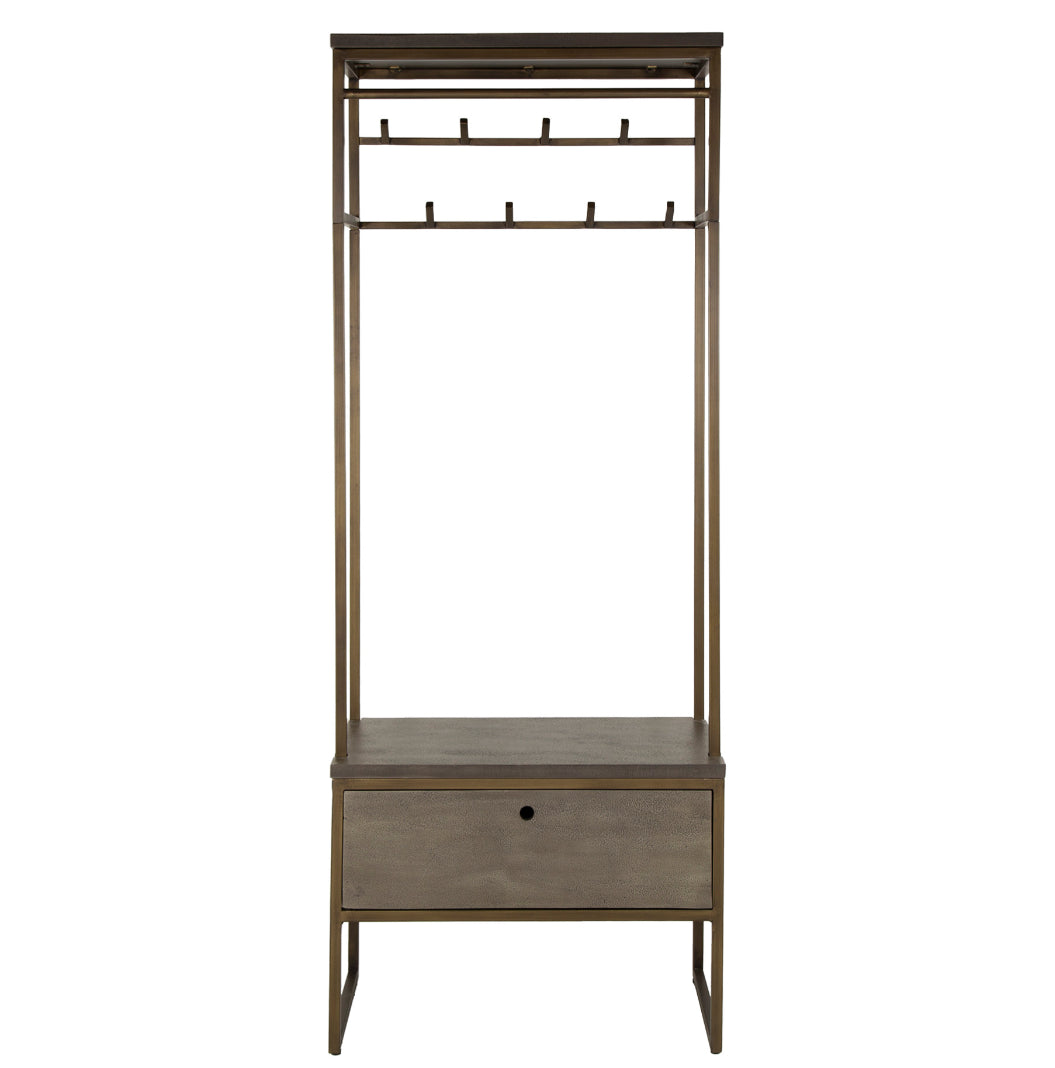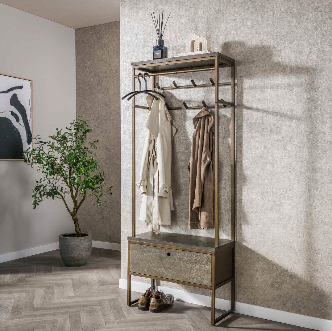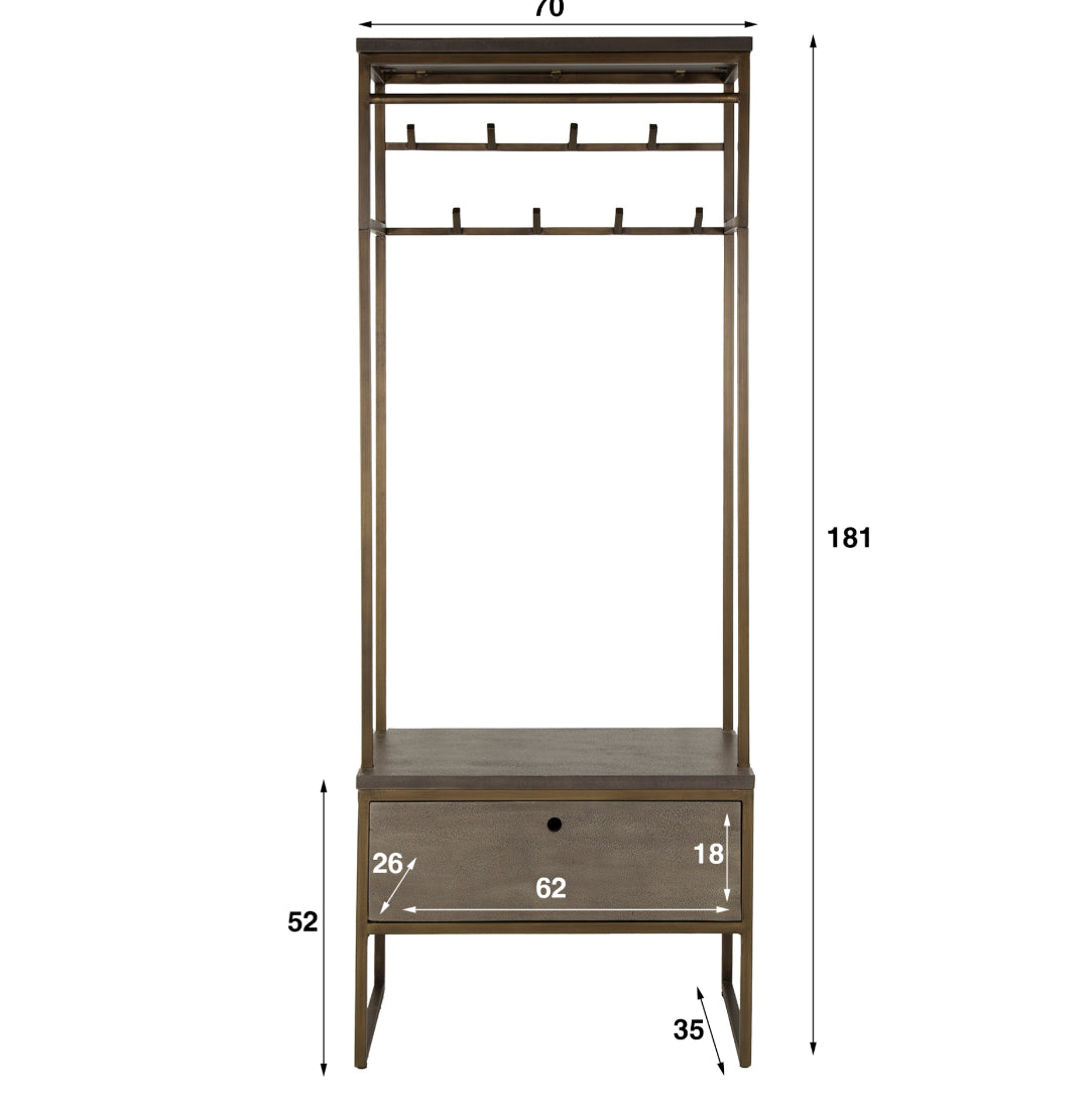Het AnLi Style Garderobemeubel Ferro met roede combineert functionaliteit met een stijlvol design. Dankzij de unieke ferro finish, brass antiek details en de extra opbergruimte in de lade is dit meubel een praktische én decoratieve toevoeging aan je hal of garderobe.
