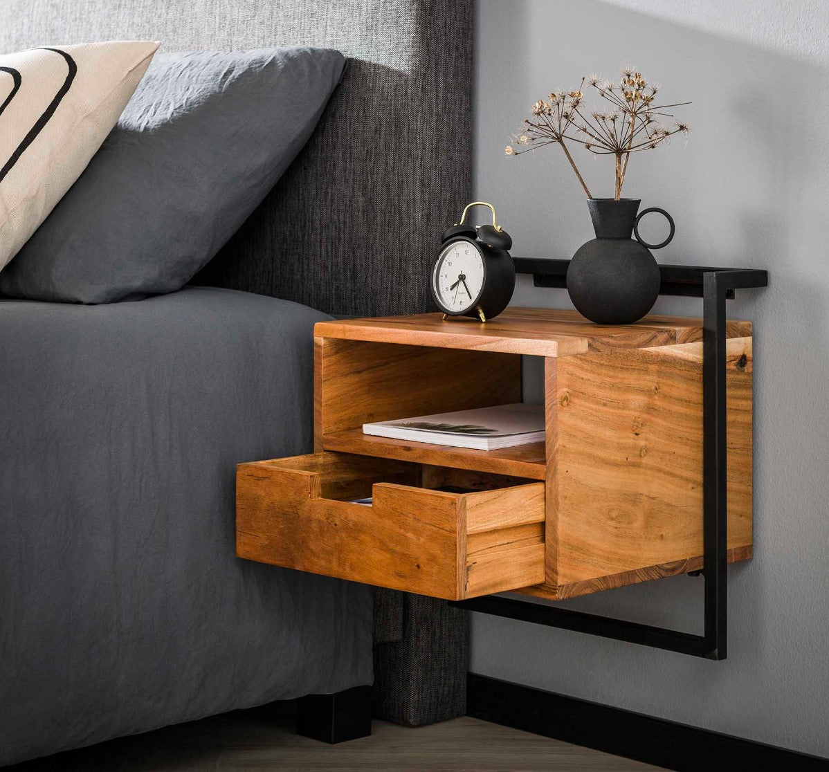 - Dit nachtkastje krijgt een unieke look omdat het kastje op te hangen is